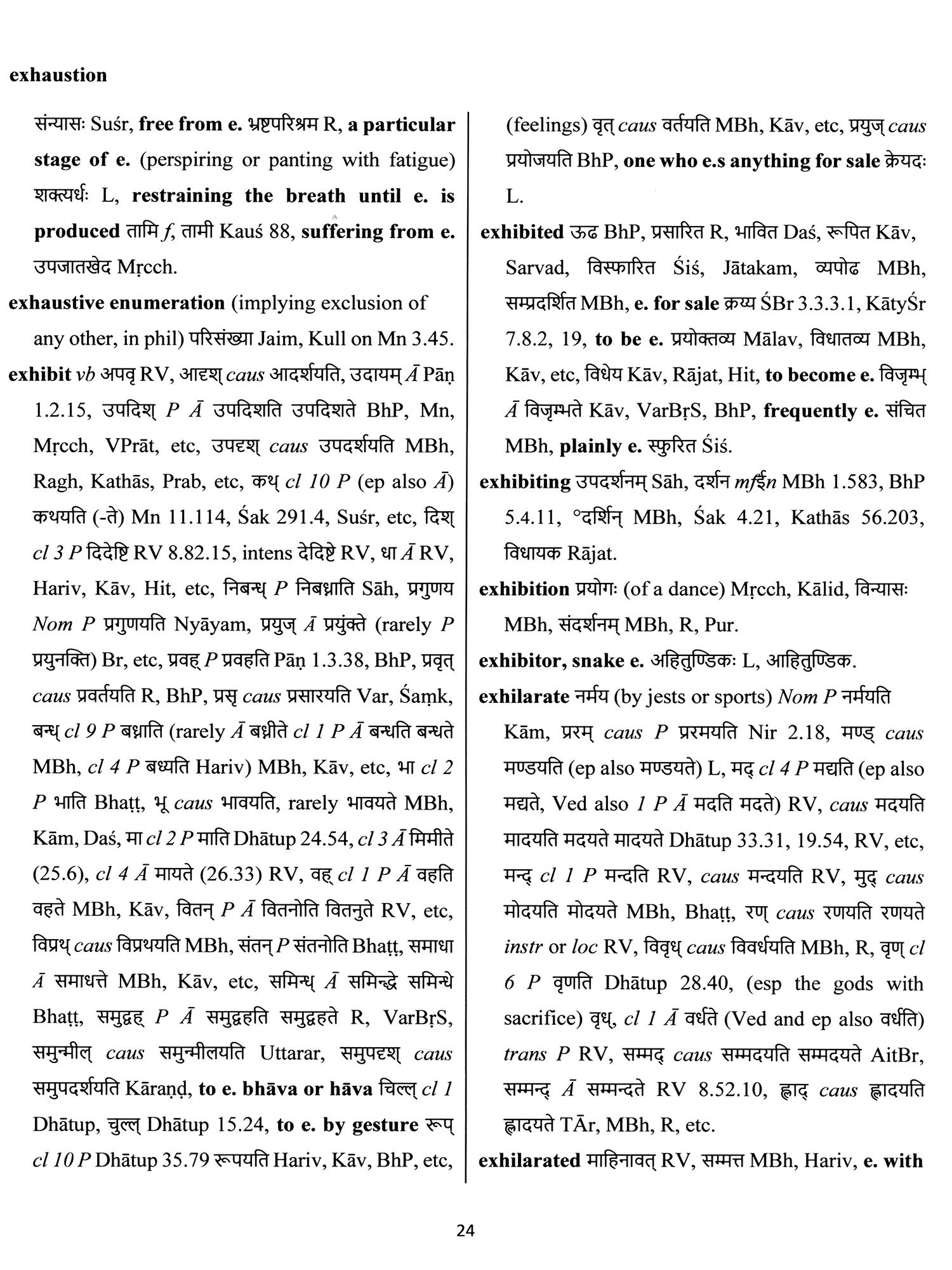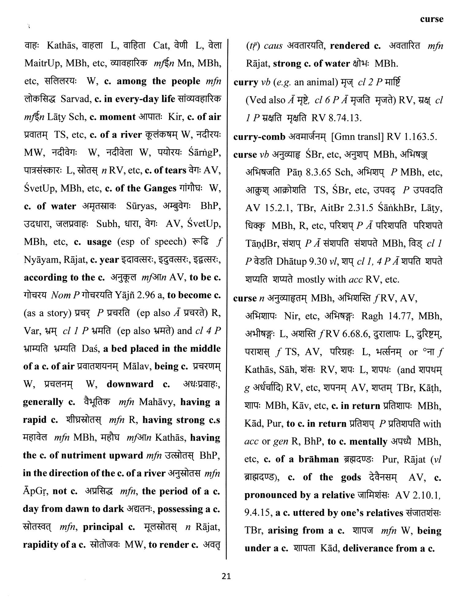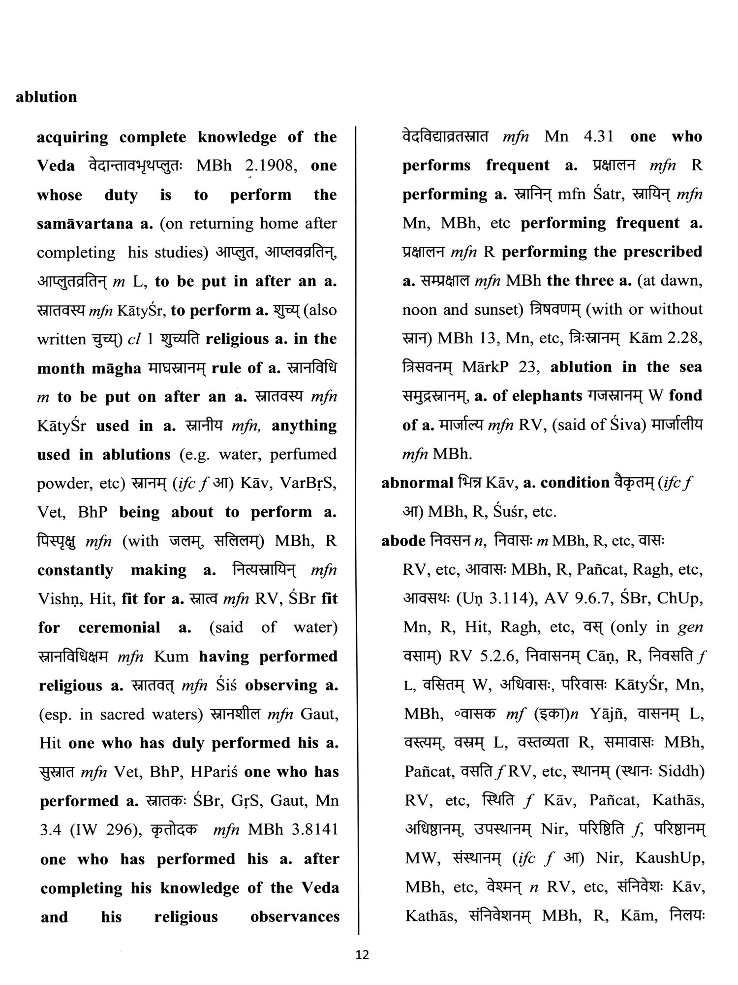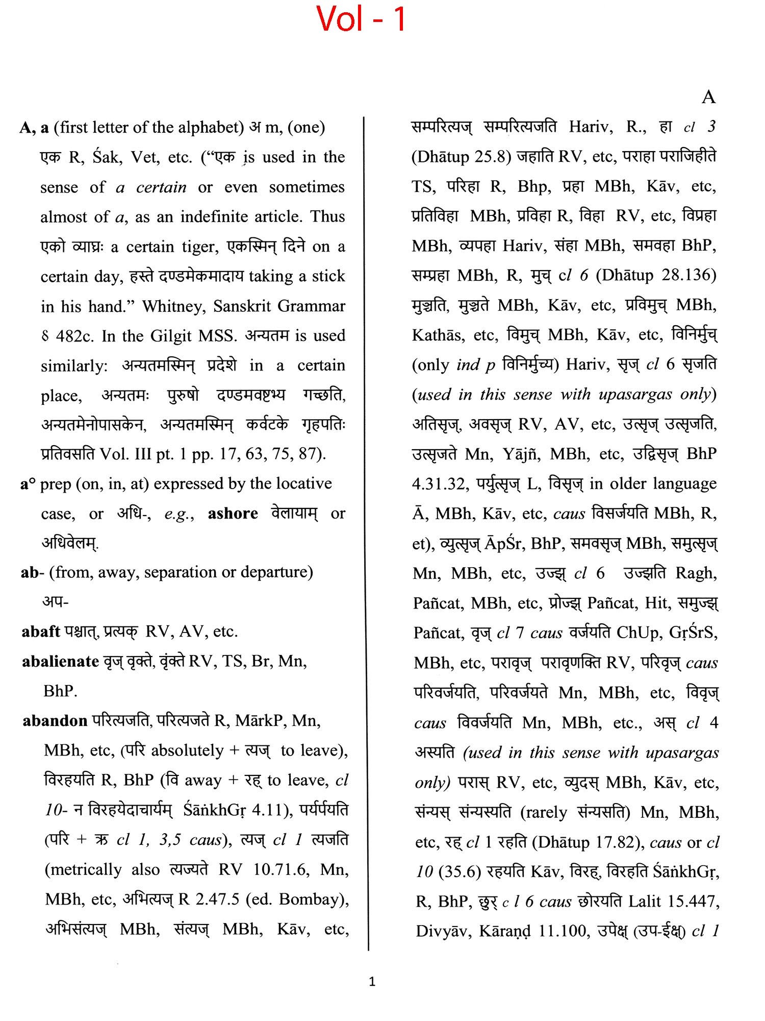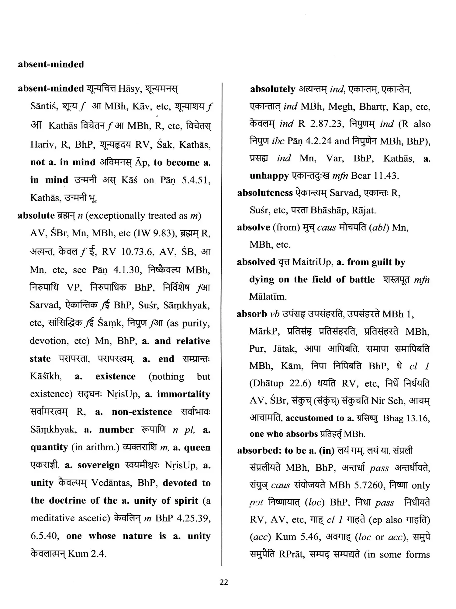 It is the first comprehensive English-Sanskrit dictionary of all the Sanskrit equivalents of an English word. It is all-inclusive and covers the complete linguistic heritage of Sanskrit from the Rgveda down to the eighteenth century. All the roots of the Dhatupathas have been incorporated so that the vast semantic spectrum of Sanskrit vis-a-vis a single English verb can be envisaged in its timeless efflorescence. The rare root du दु (Dhatupatha 22.46) occurs once in the Rigveda and survives in two words in Classical Sanskrit: dura 'distance' and duta 'envoy'. It means 'to go', Davayati 'to make distant' occurs in the Bhattikavya 2.55 which had vowed to use rare words and rare formations of grammar. This root travelled as far as Greece and MW cites three conjugated forms in Greek: duo, duno, deuomai. The innermost sanctum of a temple in Greece was aduton (garbhagrha), literally a place not to be entered (from a 'not' + dutos to be entered' from the root duein 'to enter'). It is spelt 'adytum' in English as a technical term in Greek archeology.