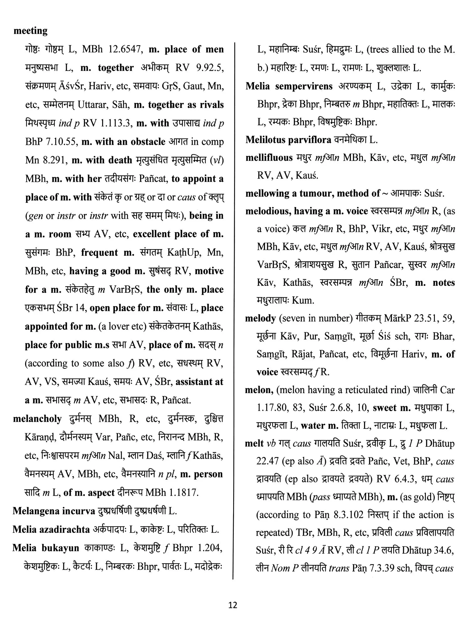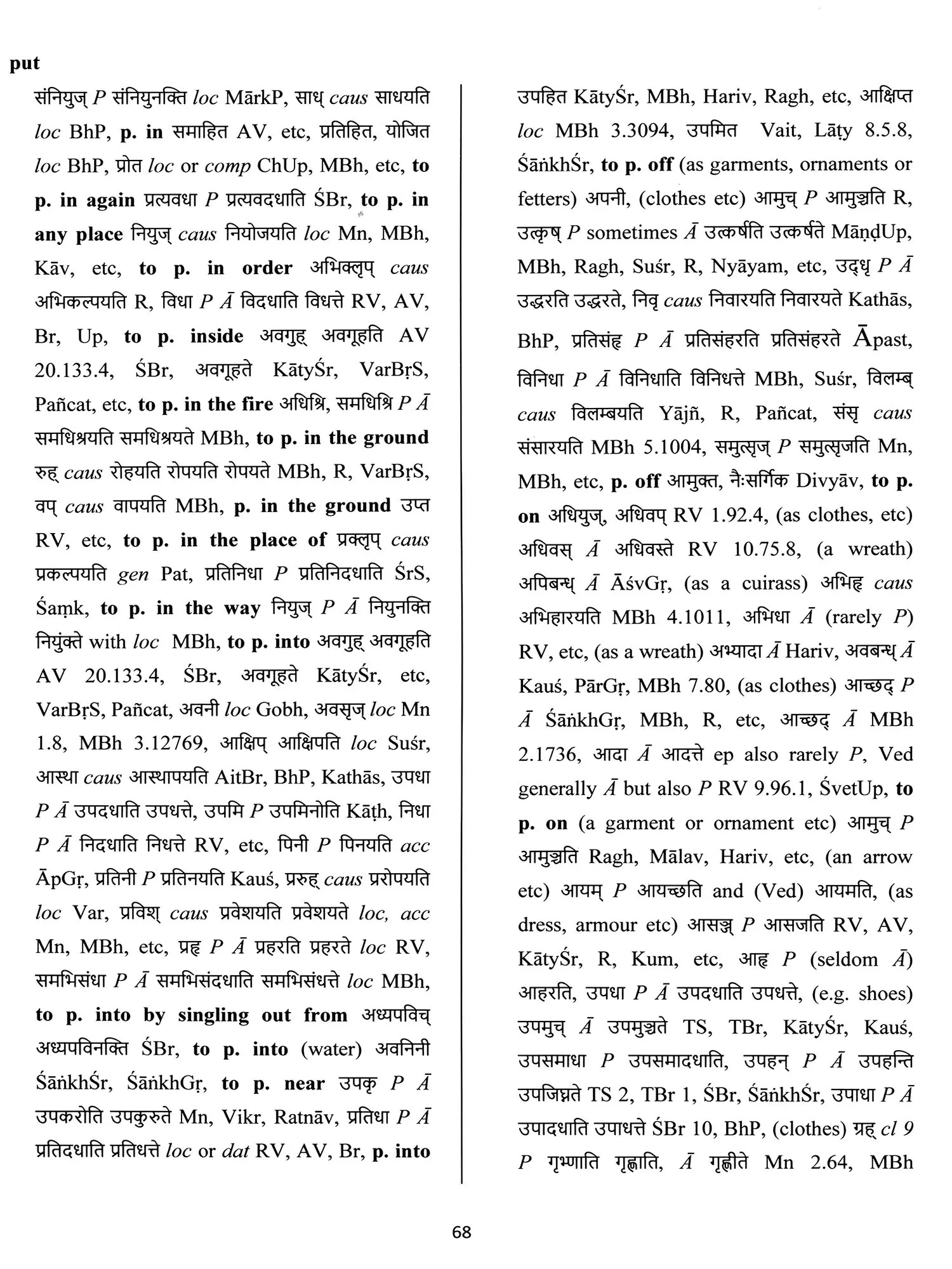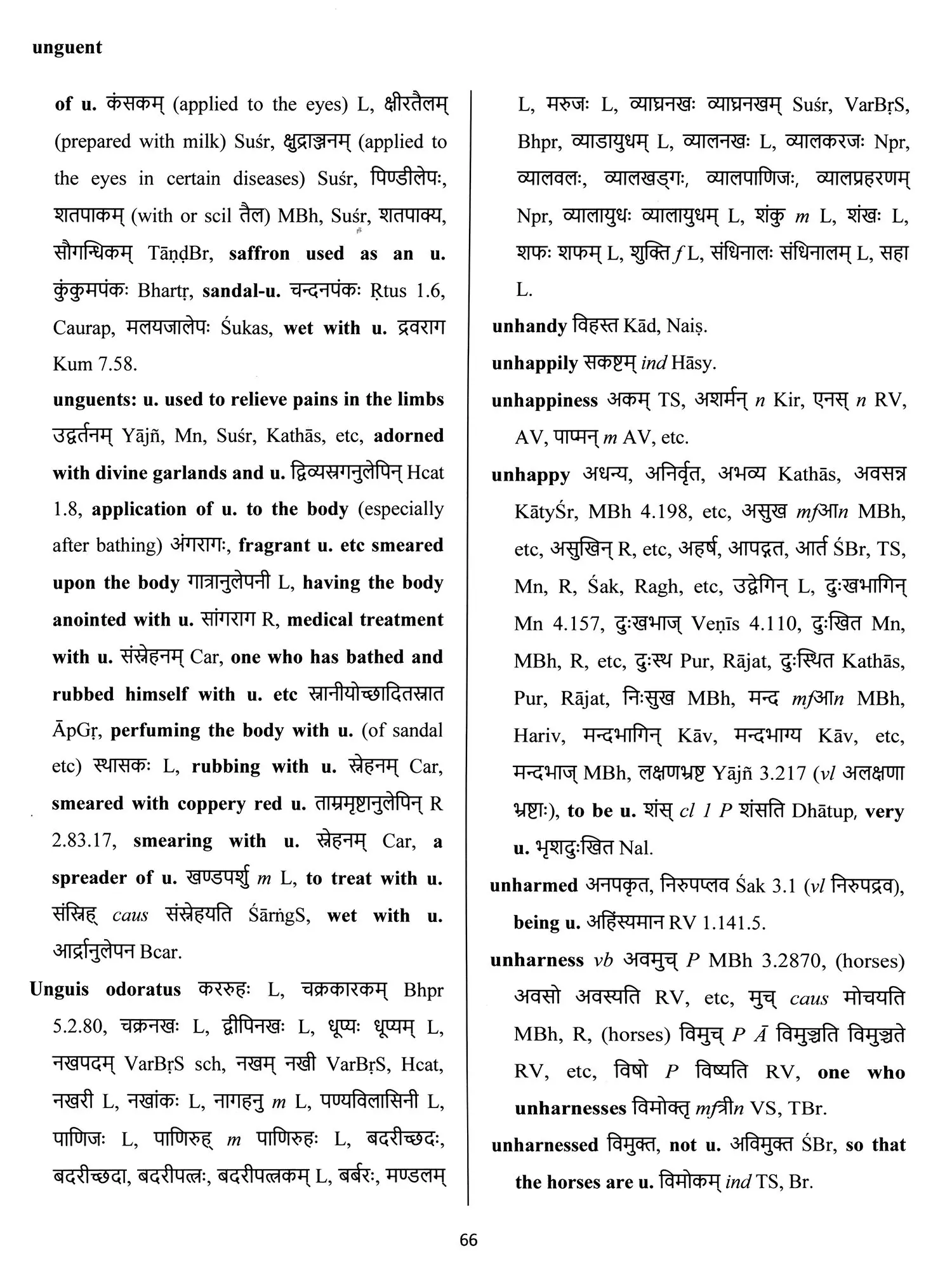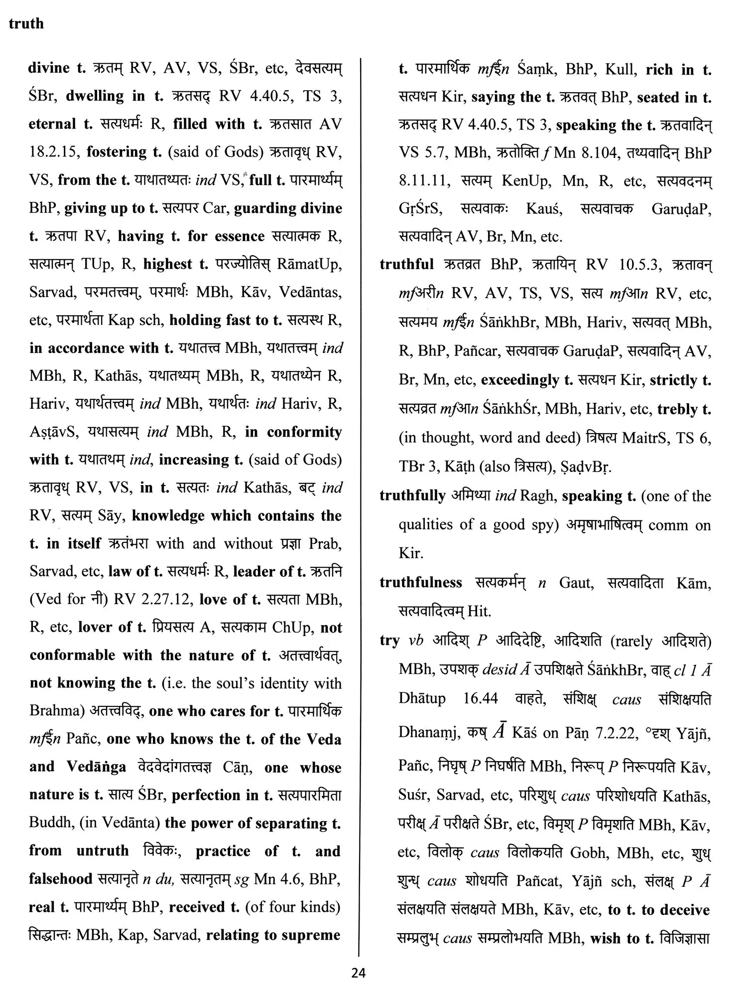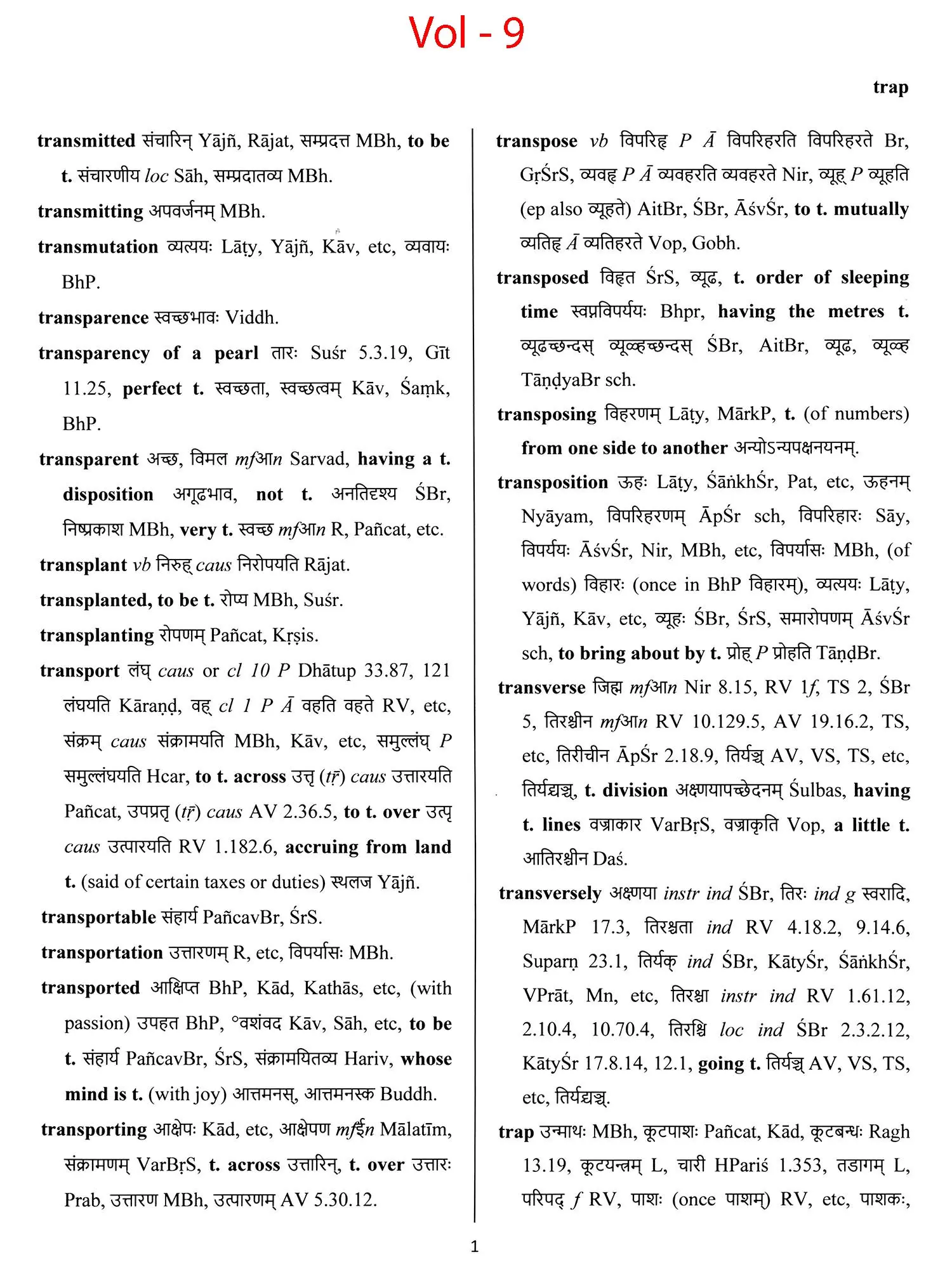 It is the first comprehensive English-Sanskrit dictionary of all the Sanskrit equivalents of an English word. It is all-inclusive and covers the complete linguistic heritage of Sanskrit from the Rgveda down to the eighteenth century. All the roots of the Dhatupathas have been incorporated so that the vast semantic spectrum of Sanskrit vis-a-vis a single English verb can be envisaged in its timeless efflorescence. The rare root du दु (Dhatupatha 22.46) occurs once in the Rigveda and survives in two words in Classical Sanskrit: dura 'distance' and duta 'envoy'. It means 'to go', Davayati 'to make distant' occurs in the Bhattikavya 2.55 which had vowed to use rare words and rare formations of grammar. This root travelled as far as Greece and MW cites three conjugated forms in Greek: duo, duno, deuomai. The innermost sanctum of a temple in Greece was aduton (garbhagrha), literally a place not to be entered (from a 'not' + dutos to be entered' from the root duein 'to enter'). It is spelt 'adytum' in English as a technical term in Greek archeology.