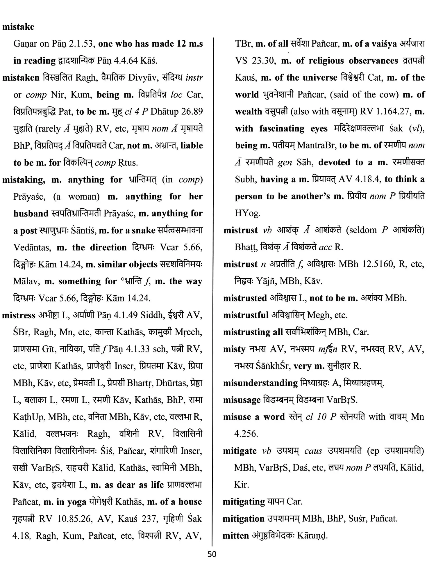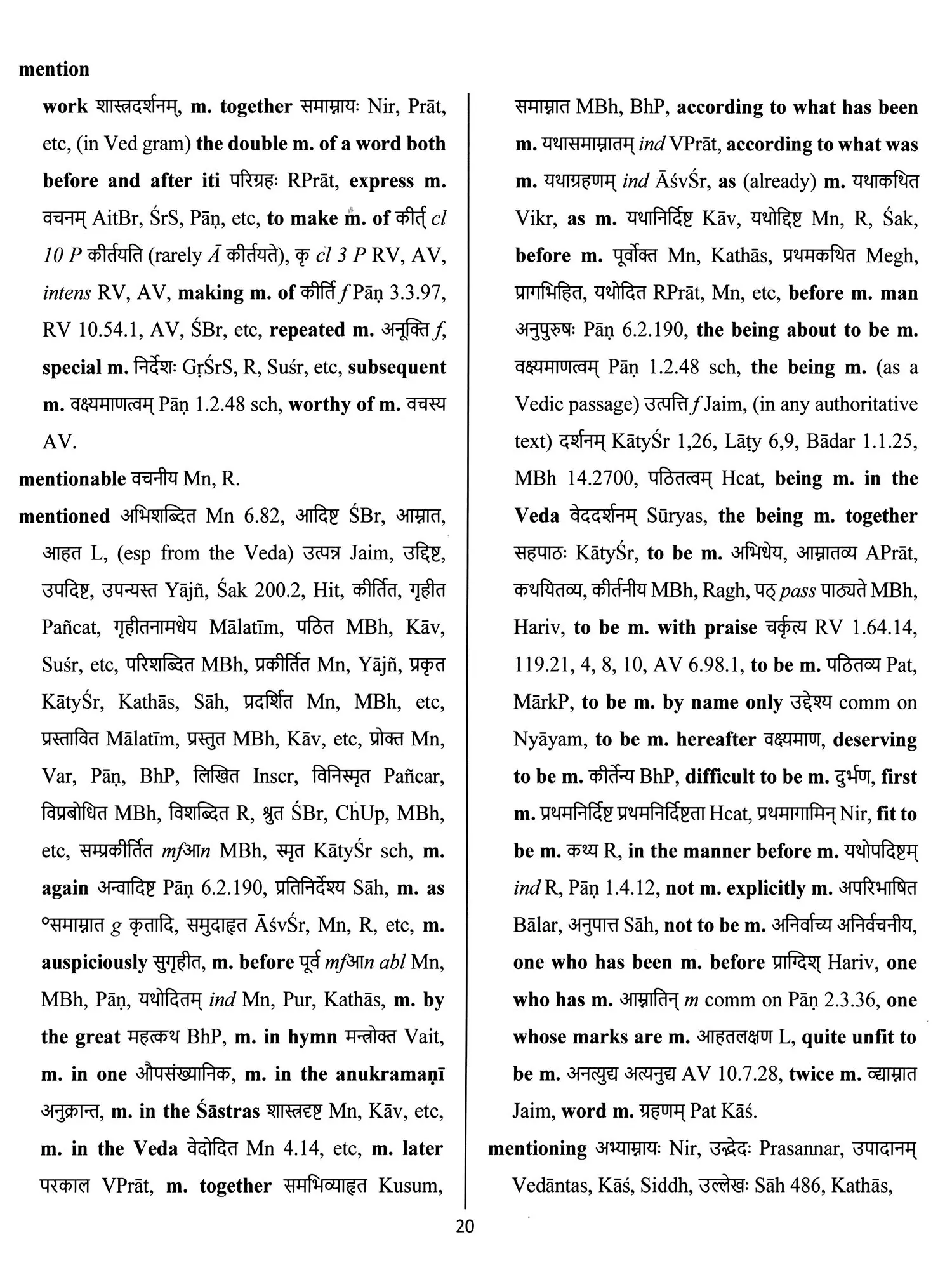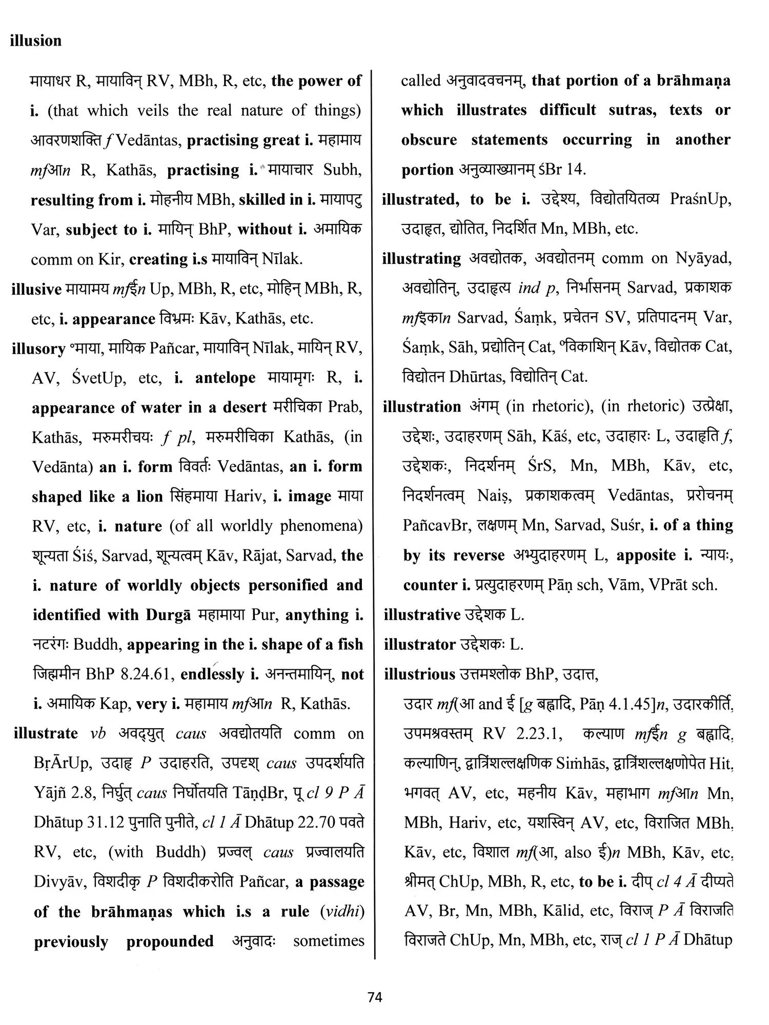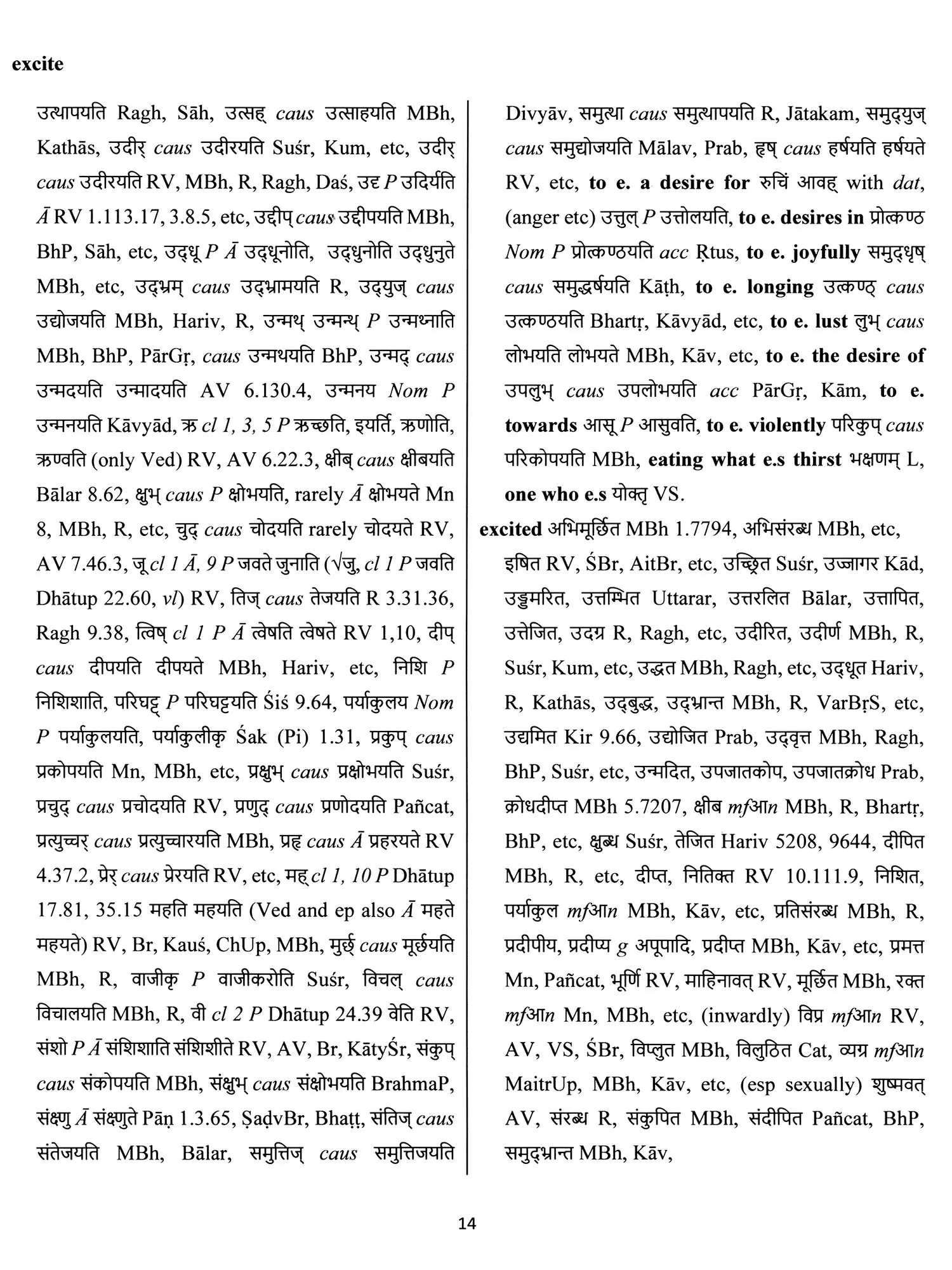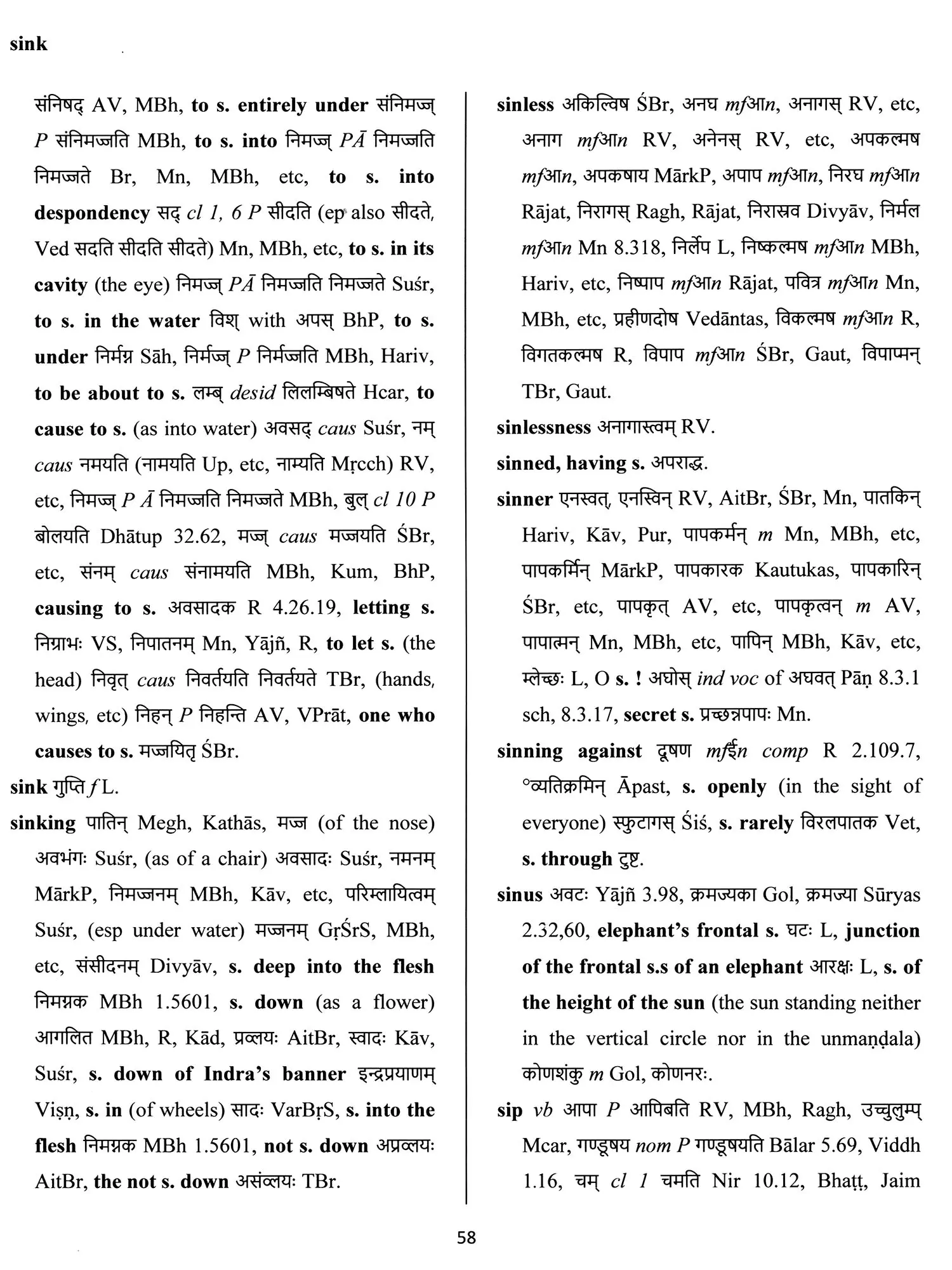 It is the first comprehensive English-Sanskrit dictionary of all the Sanskrit equivalents of an English word. It is all-inclusive and covers the complete linguistic heritage of Sanskrit from the Rgveda down to the eighteenth century. All the roots of the Dhatupathas have been incorporated so that the vast semantic spectrum of Sanskrit vis-a-vis a single English verb can be envisaged in its timeless efflorescence. The rare root du दु (Dhatupatha 22.46) occurs once in the Rigveda and survives in two words in Classical Sanskrit: dura 'distance' and duta 'envoy'. It means 'to go', Davayati 'to make distant' occurs in the Bhattikavya 2.55 which had vowed to use rare words and rare formations of grammar. This root travelled as far as Greece and MW cites three conjugated forms in Greek: duo, duno, deuomai. The innermost sanctum of a temple in Greece was aduton (garbhagrha), literally a place not to be entered (from a 'not' + dutos to be entered' from the root duein 'to enter'). It is spelt 'adytum' in English as a technical term in Greek archeology.