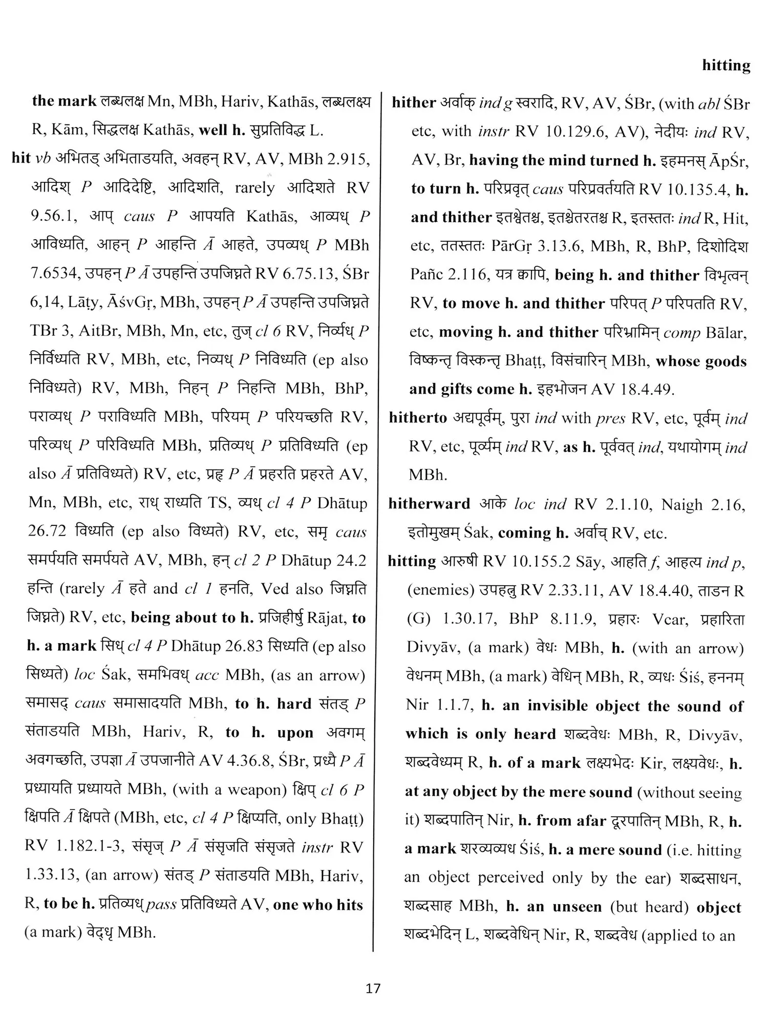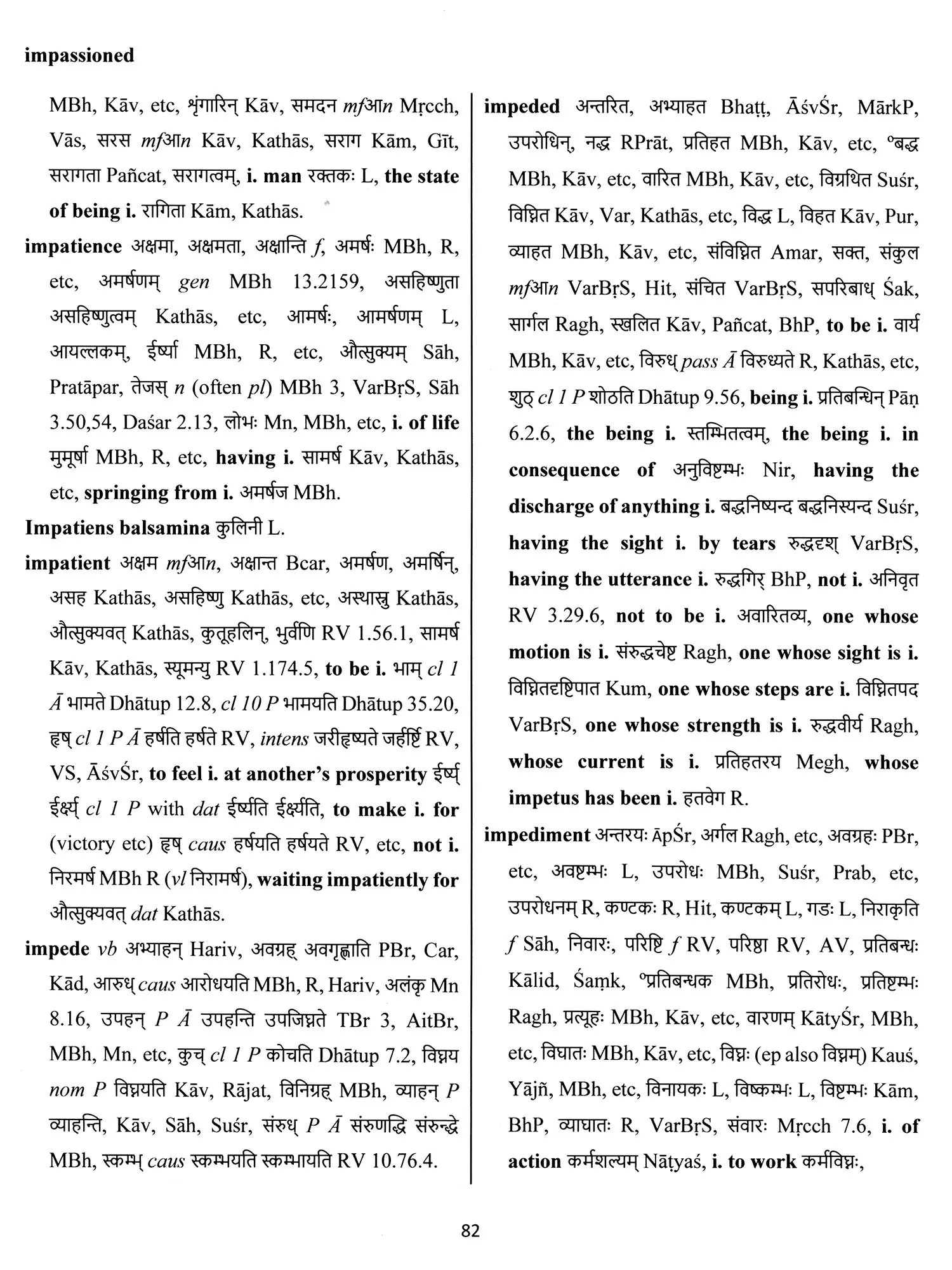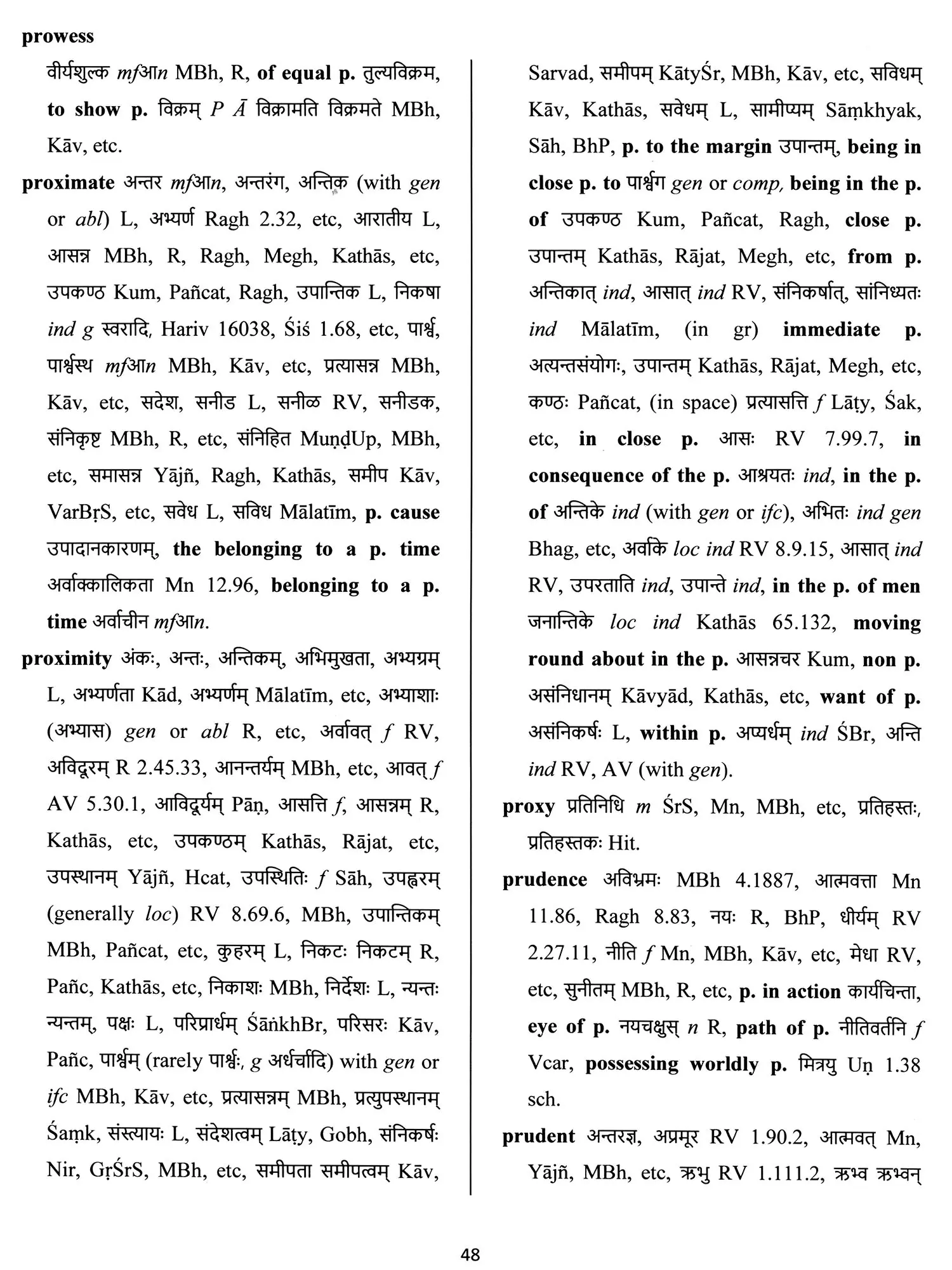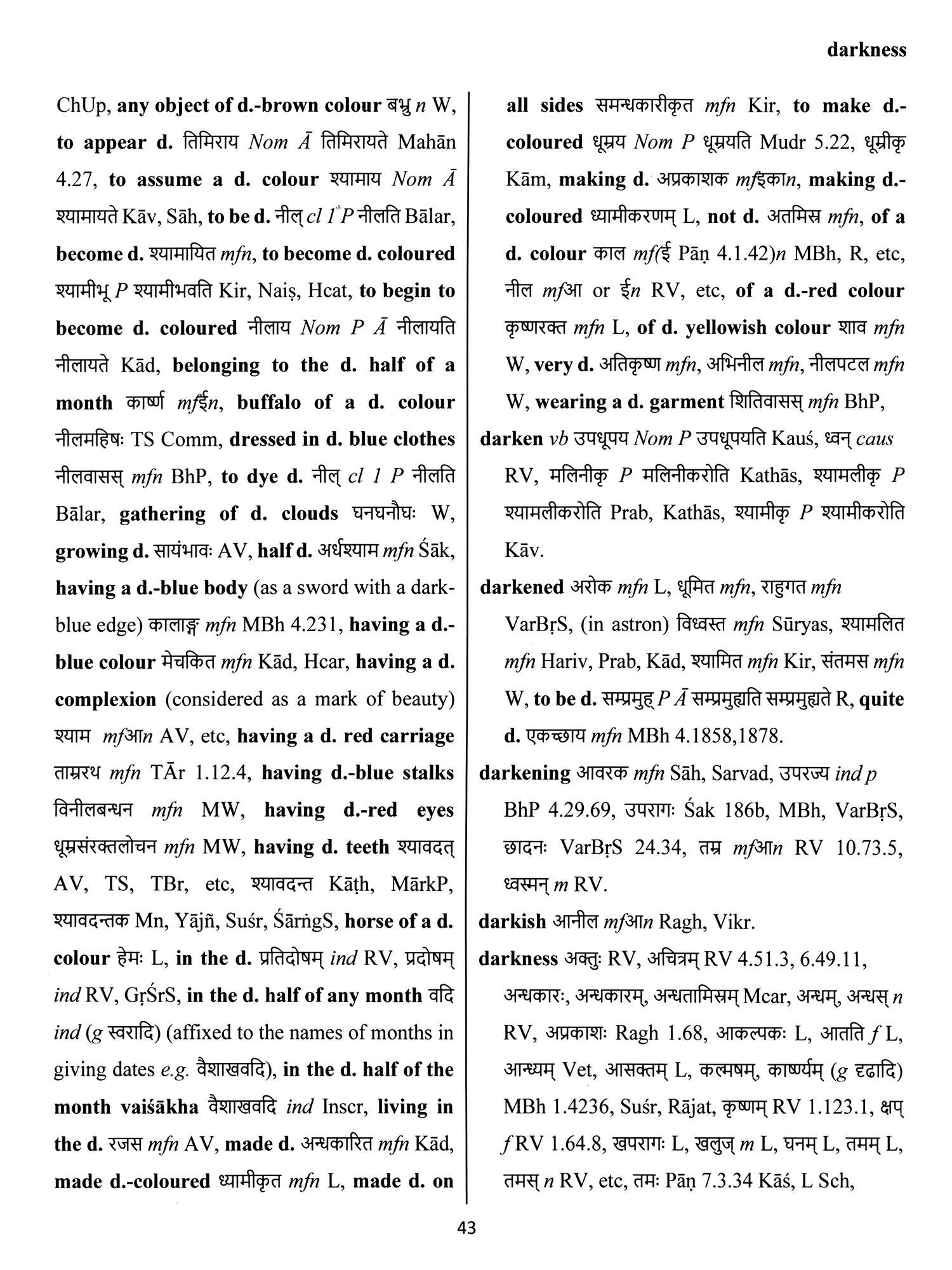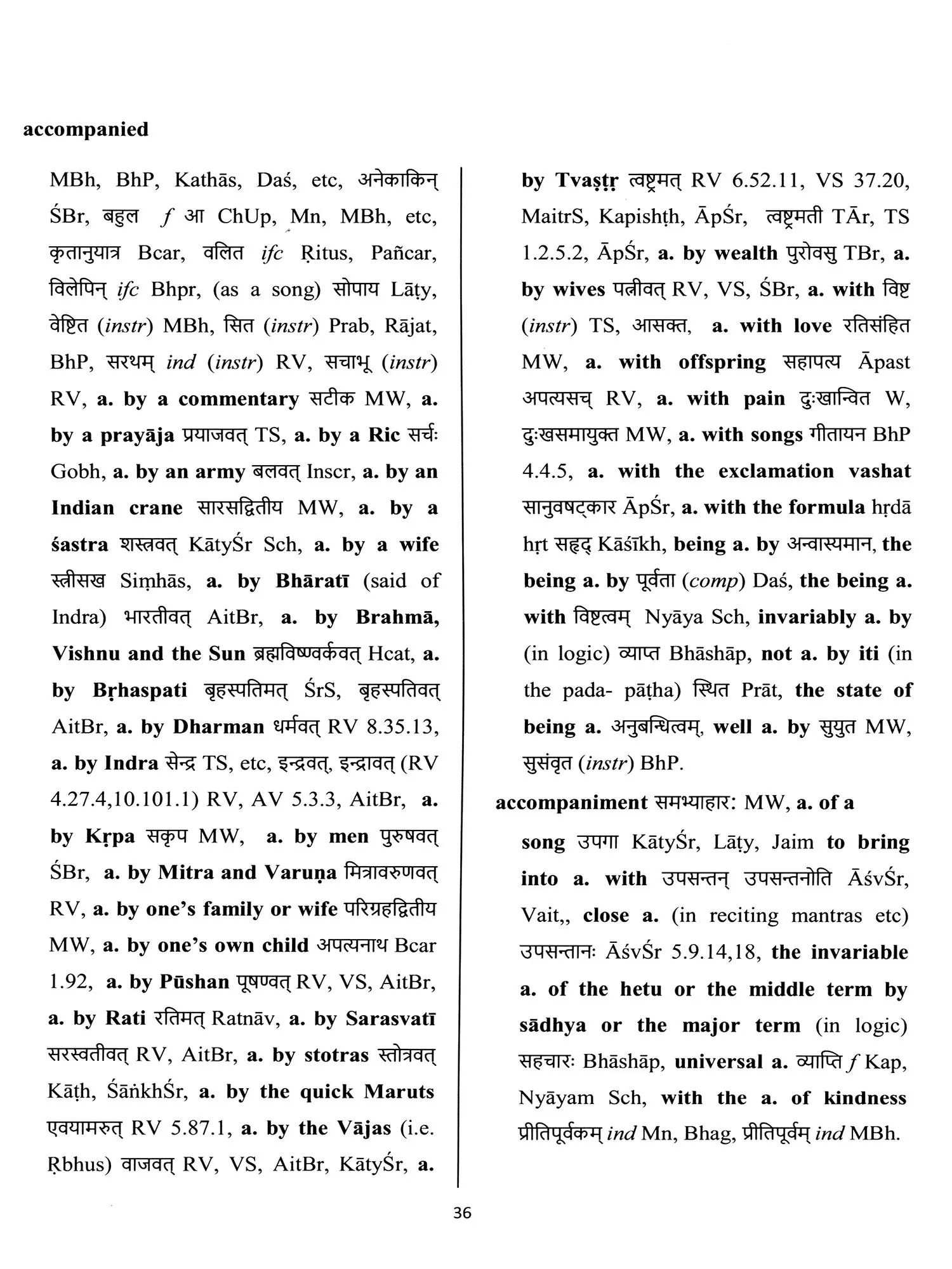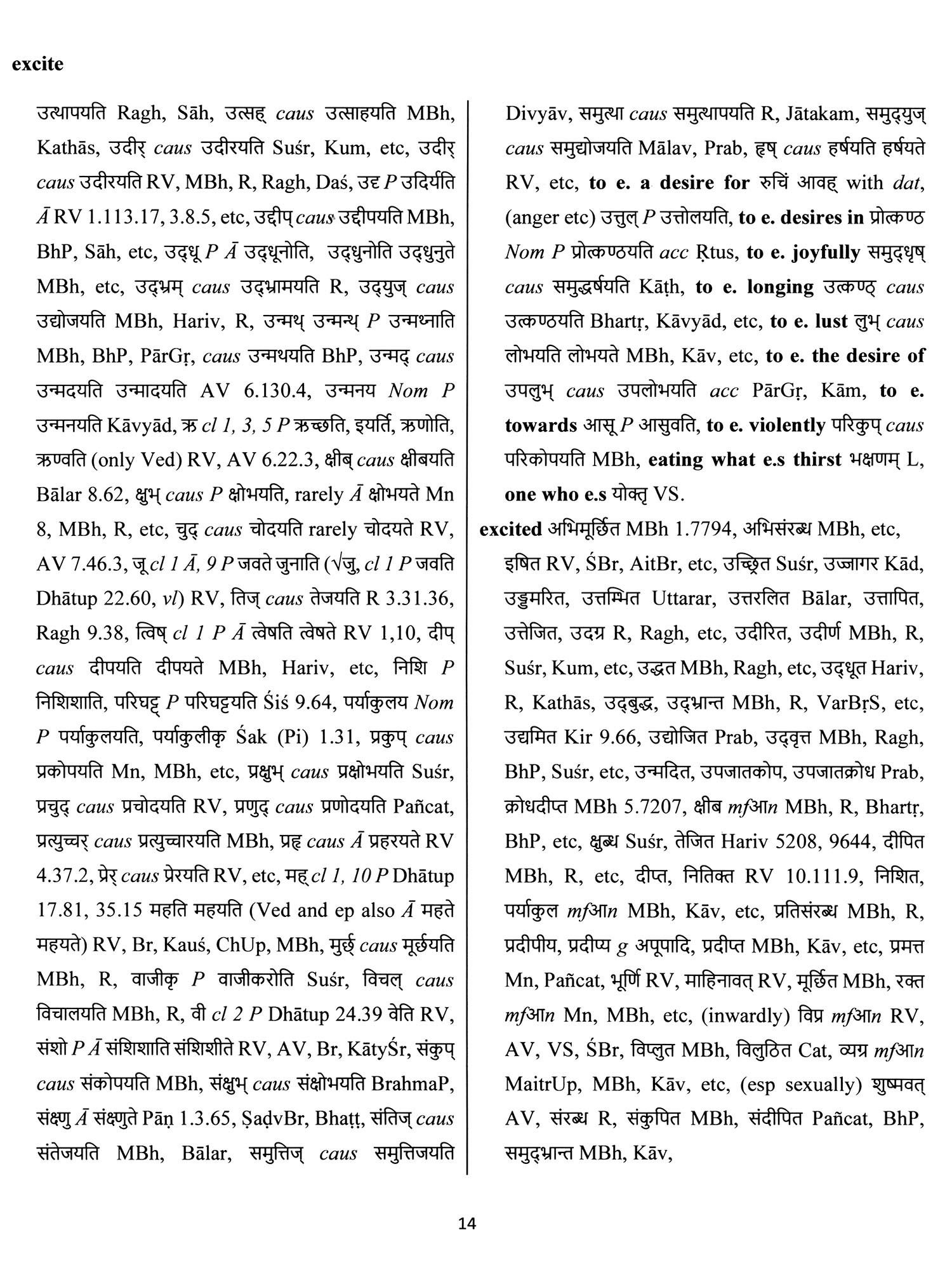 It is the first comprehensive English-Sanskrit dictionary of all the Sanskrit equivalents of an English word. It is all-inclusive and covers the complete linguistic heritage of Sanskrit from the Rgveda down to the eighteenth century. All the roots of the Dhatupathas have been incorporated so that the vast semantic spectrum of Sanskrit vis-a-vis a single English verb can be envisaged in its timeless efflorescence. The rare root du दु (Dhatupatha 22.46) occurs once in the Rigveda and survives in two words in Classical Sanskrit: dura 'distance' and duta 'envoy'. It means 'to go', Davayati 'to make distant' occurs in the Bhattikavya 2.55 which had vowed to use rare words and rare formations of grammar. This root travelled as far as Greece and MW cites three conjugated forms in Greek: duo, duno, deuomai. The innermost sanctum of a temple in Greece was aduton (garbhagrha), literally a place not to be entered (from a 'not' + dutos to be entered' from the root duein 'to enter'). It is spelt 'adytum' in English as a technical term in Greek archeology.
