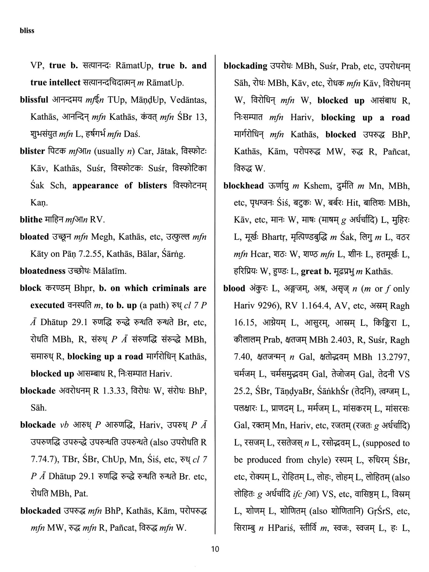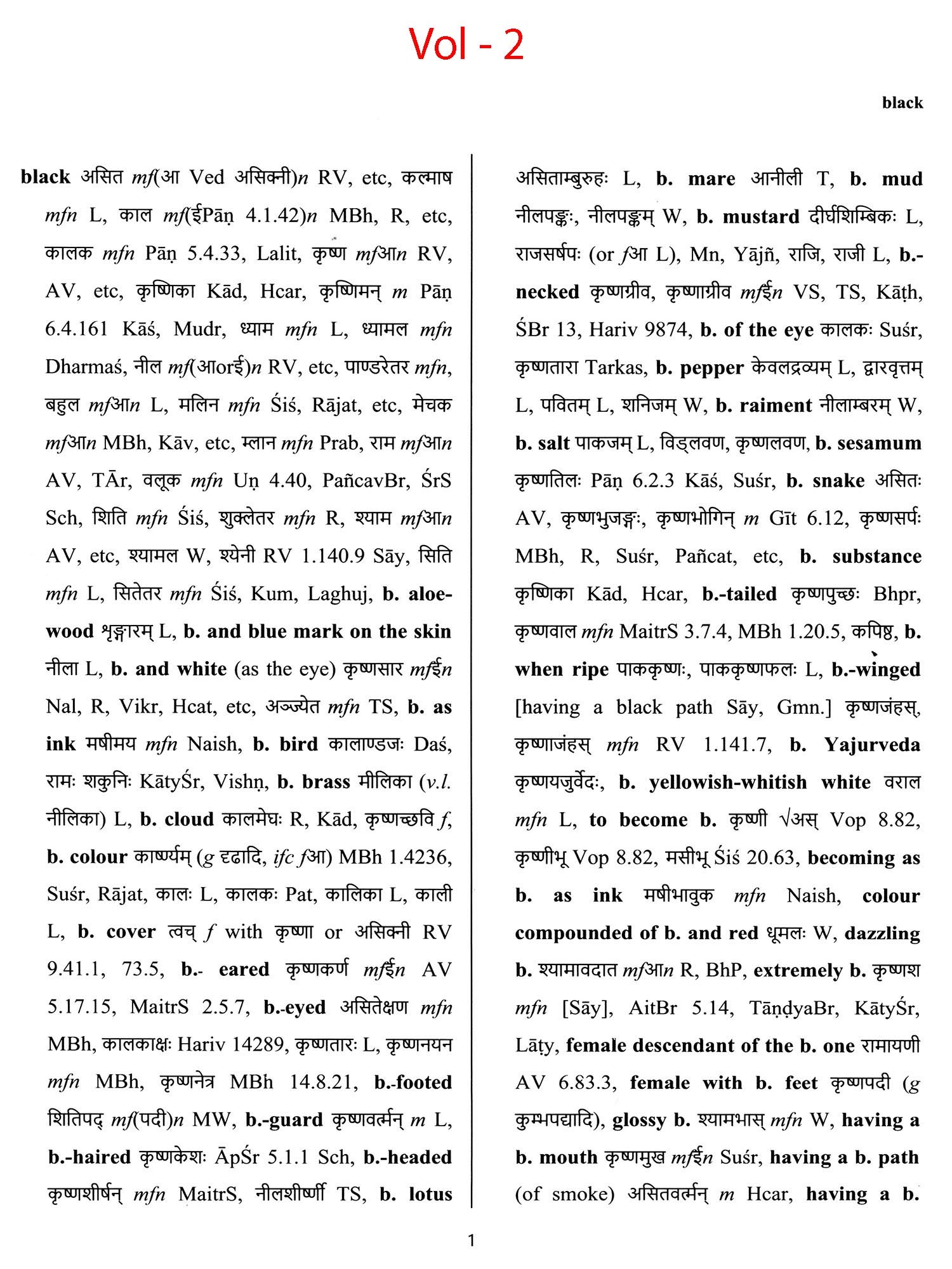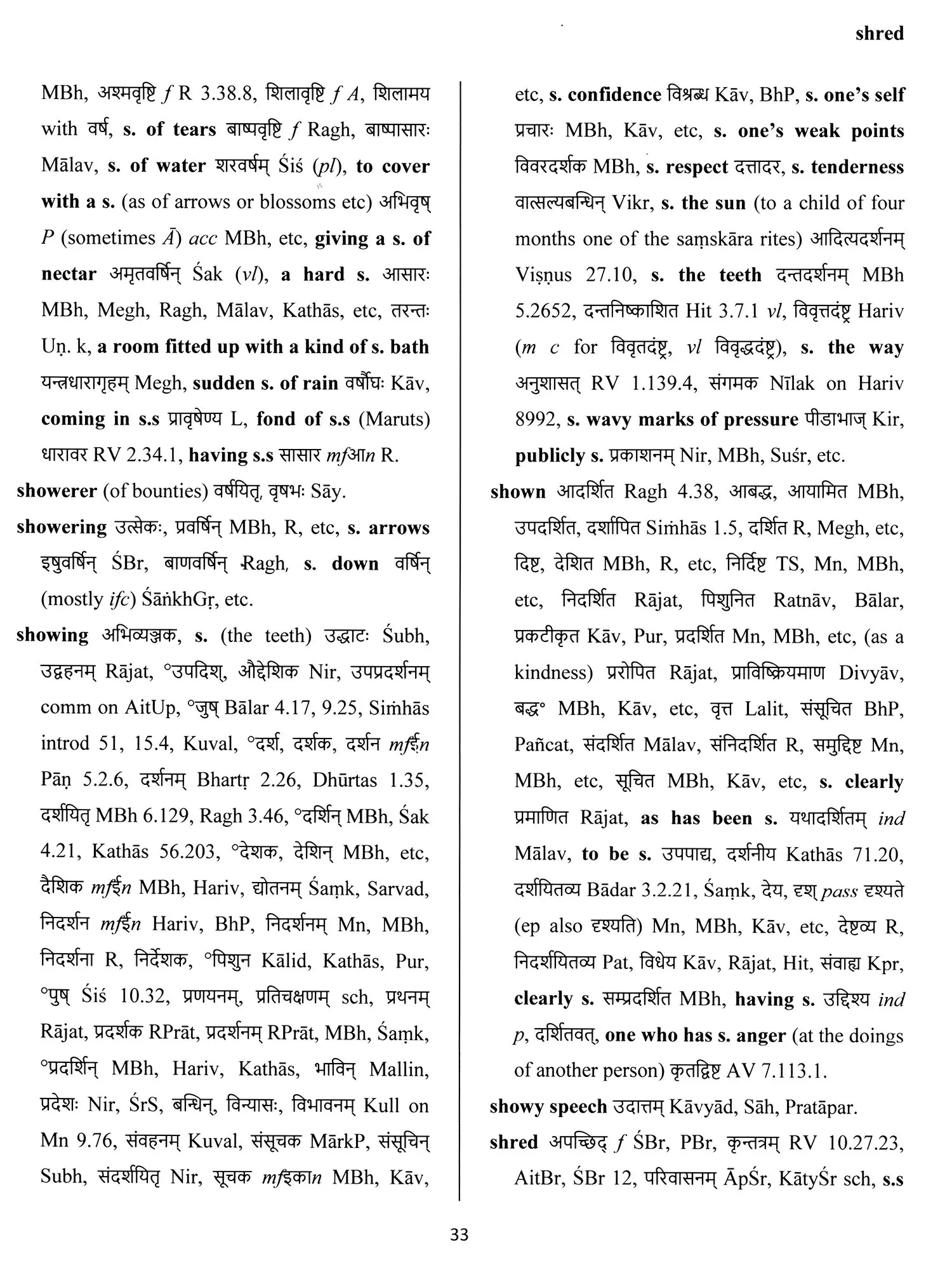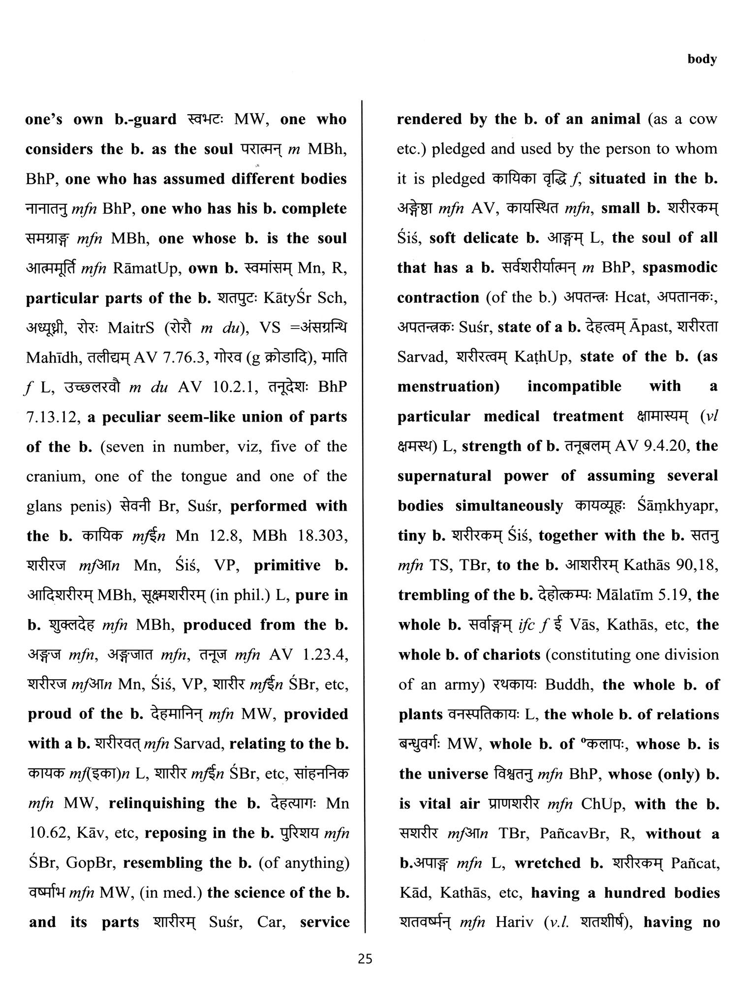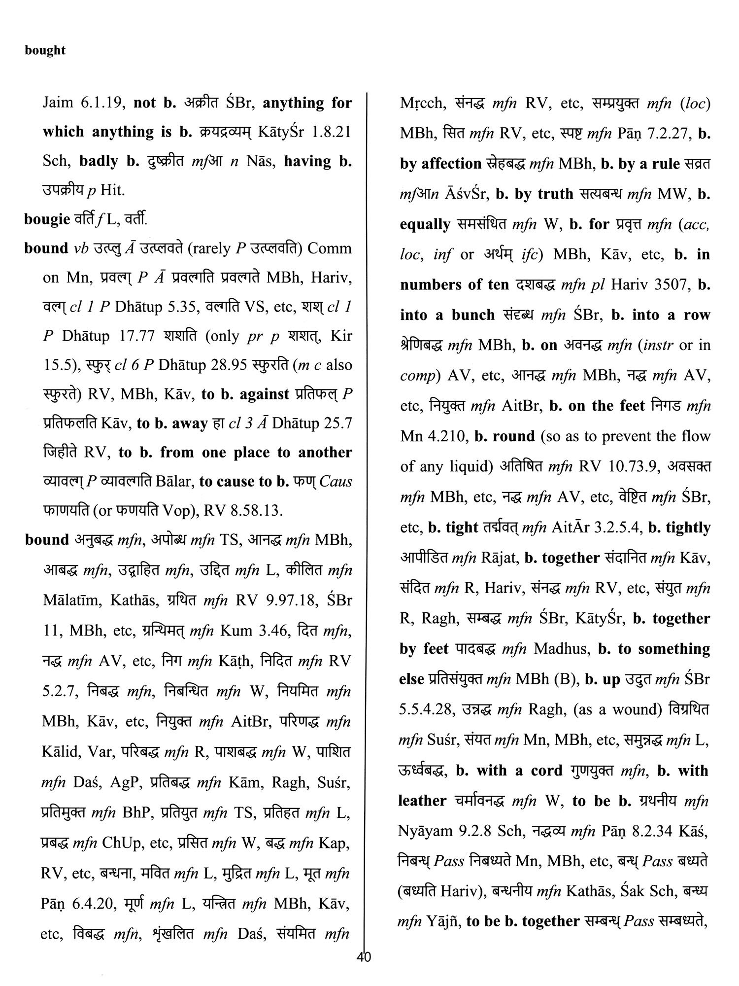 It is the first comprehensive English-Sanskrit dictionary of all the Sanskrit equivalents of an English word. It is all-inclusive and covers the complete linguistic heritage of Sanskrit from the Rgveda down to the eighteenth century. All the roots of the Dhatupathas have been incorporated so that the vast semantic spectrum of Sanskrit vis-a-vis a single English verb can be envisaged in its timeless efflorescence. The rare root du दु (Dhatupatha 22.46) occurs once in the Rigveda and survives in two words in Classical Sanskrit: dura 'distance' and duta 'envoy'. It means 'to go', Davayati 'to make distant' occurs in the Bhattikavya 2.55 which had vowed to use rare words and rare formations of grammar. This root travelled as far as Greece and MW cites three conjugated forms in Greek: duo, duno, deuomai. The innermost sanctum of a temple in Greece was aduton (garbhagrha), literally a place not to be entered (from a 'not' + dutos to be entered' from the root duein 'to enter'). It is spelt 'adytum' in English as a technical term in Greek archeology.