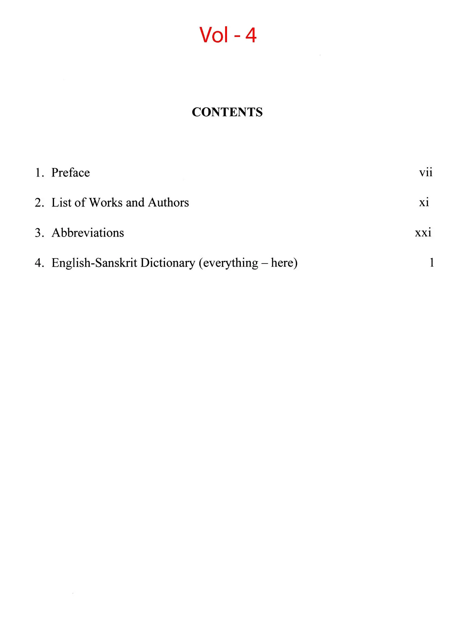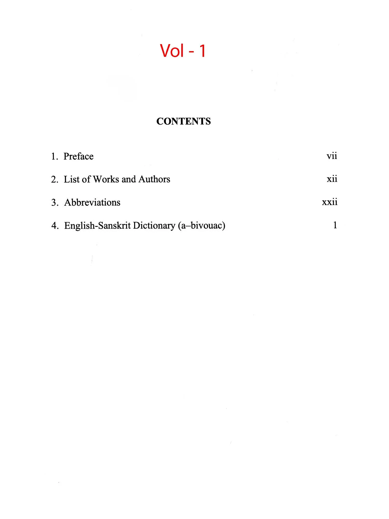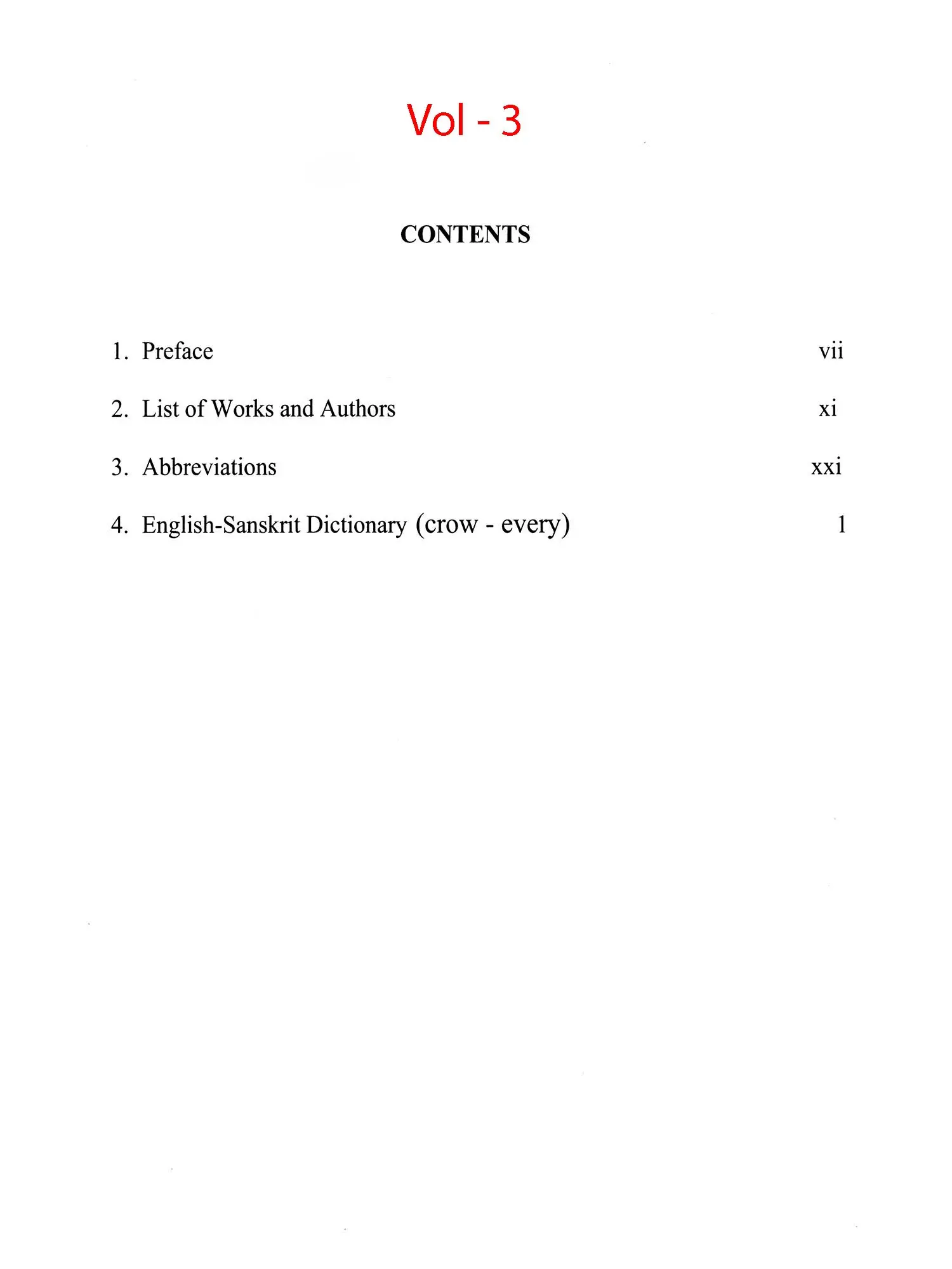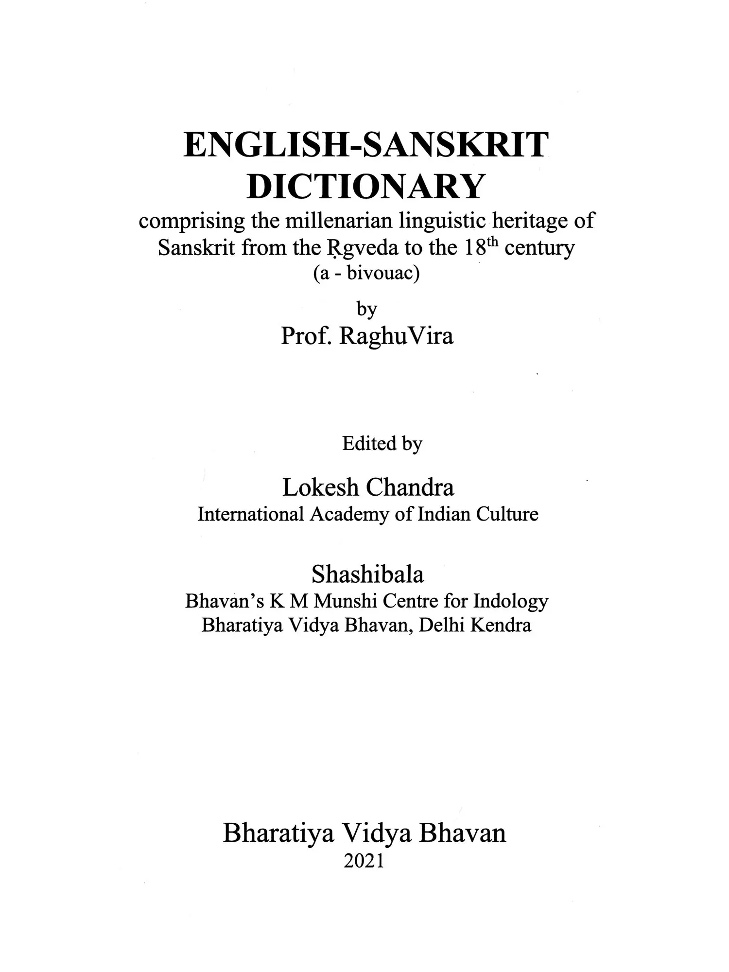 Sanskrit is rich in synonymy and this affluence is fully reflected in the overflow of Sanskrit words for any English vocable. Sir Monier Monier-Williams compiled his magnum opus, A Sanskrit-English Dictionary which appeared from the Clarendon Press in 1899. Prof. Raghu Vira compiled this English-Sanskrit Dictionary to include each and every item from Monier-Williams. This grandfather dictionary which will run to ten volumes was compiled as a basic component for the creation of new words in Indian languages. This dictionary with colossal number of Sanskrit nouns, verbs, adjectives etc. for every semanteme in English ensures that Indian languages will never stand in dearth of fullest expression. Scientific interest demands specialization and infinite ramification of technical terms. This dictionary is a vade mecum for creating terms for humanities as well as for the natural sciences.