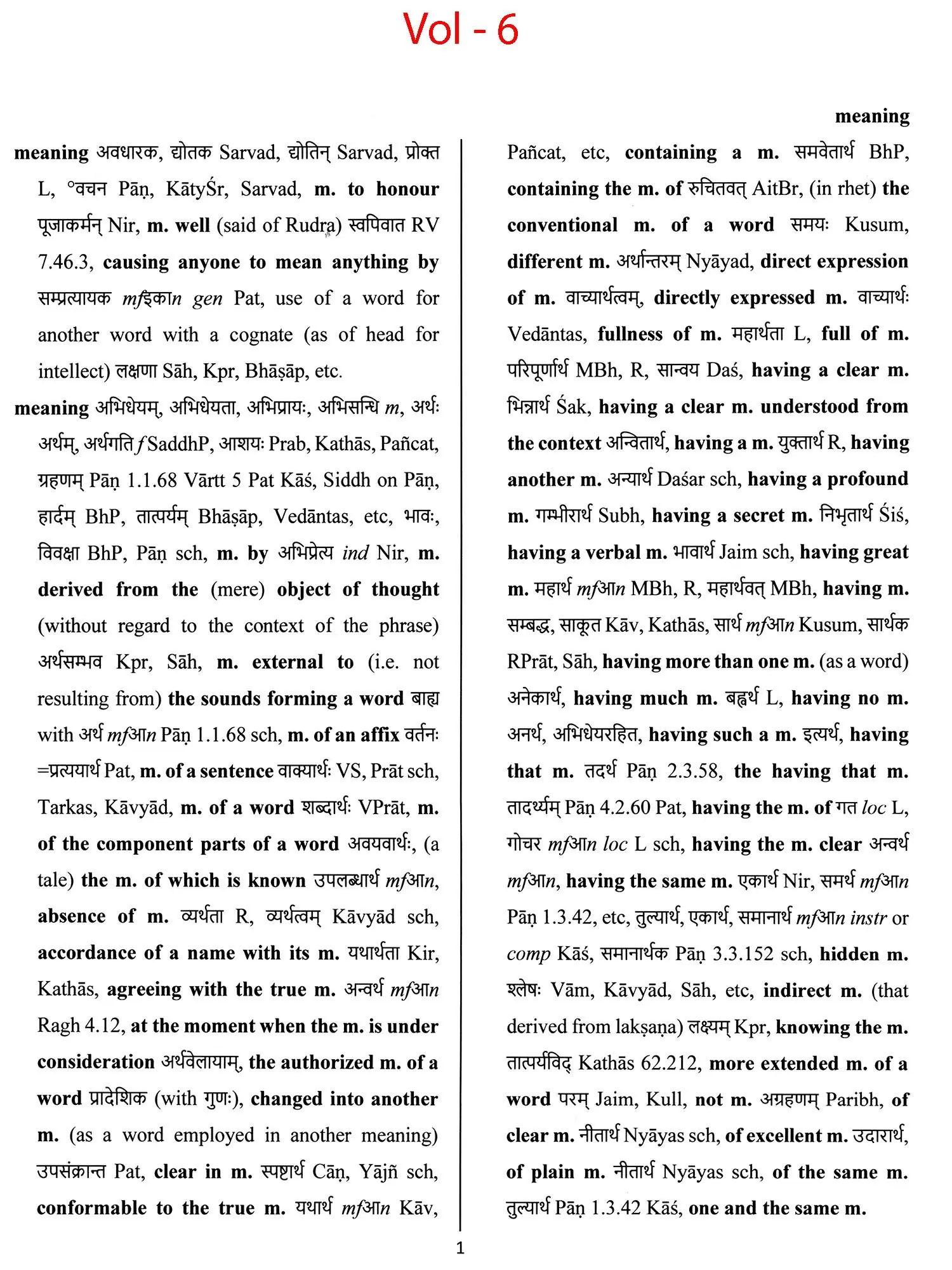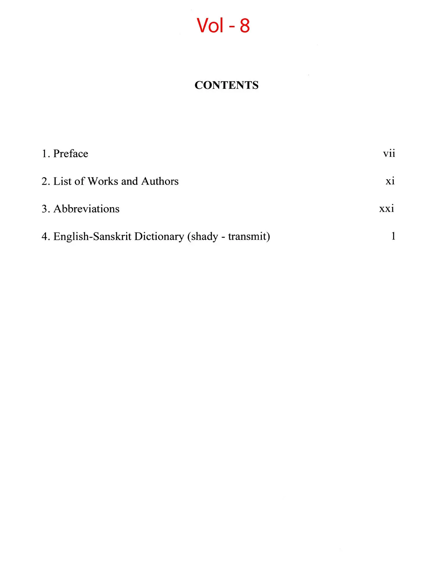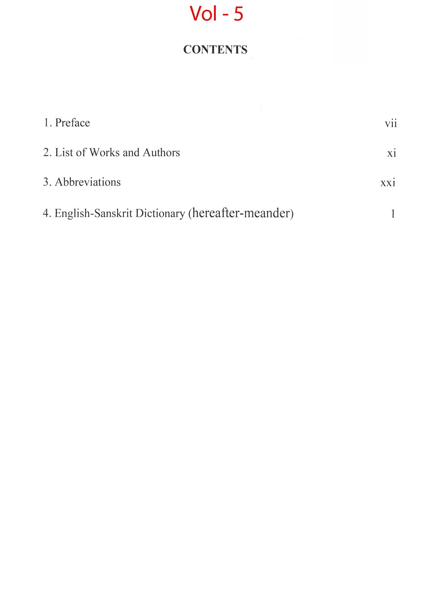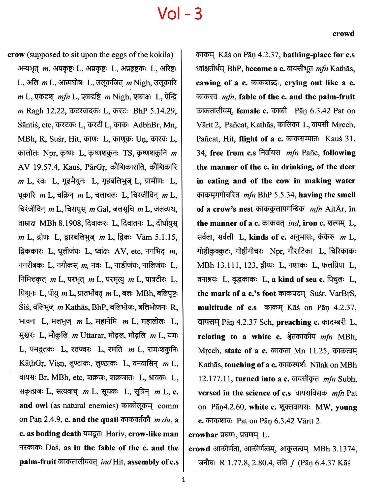 Sanskrit is rich in synonymy and this affluence is fully reflected in the overflow of Sanskrit words for any English vocable. Sir Monier Monier-Williams compiled his magnum opus, A Sanskrit-English Dictionary which appeared from the Clarendon Press in 1899. Prof. Raghu Vira compiled this English-Sanskrit Dictionary to include each and every item from Monier-Williams. This grandfather dictionary which will run to ten volumes was compiled as a basic component for the creation of new words in Indian languages. This dictionary with colossal number of Sanskrit nouns, verbs, adjectives etc. for every semanteme in English ensures that Indian languages will never stand in dearth of fullest expression. Scientific interest demands specialization and infinite ramification of technical terms. This dictionary is a vade mecum for creating terms for humanities as well as for the natural sciences.