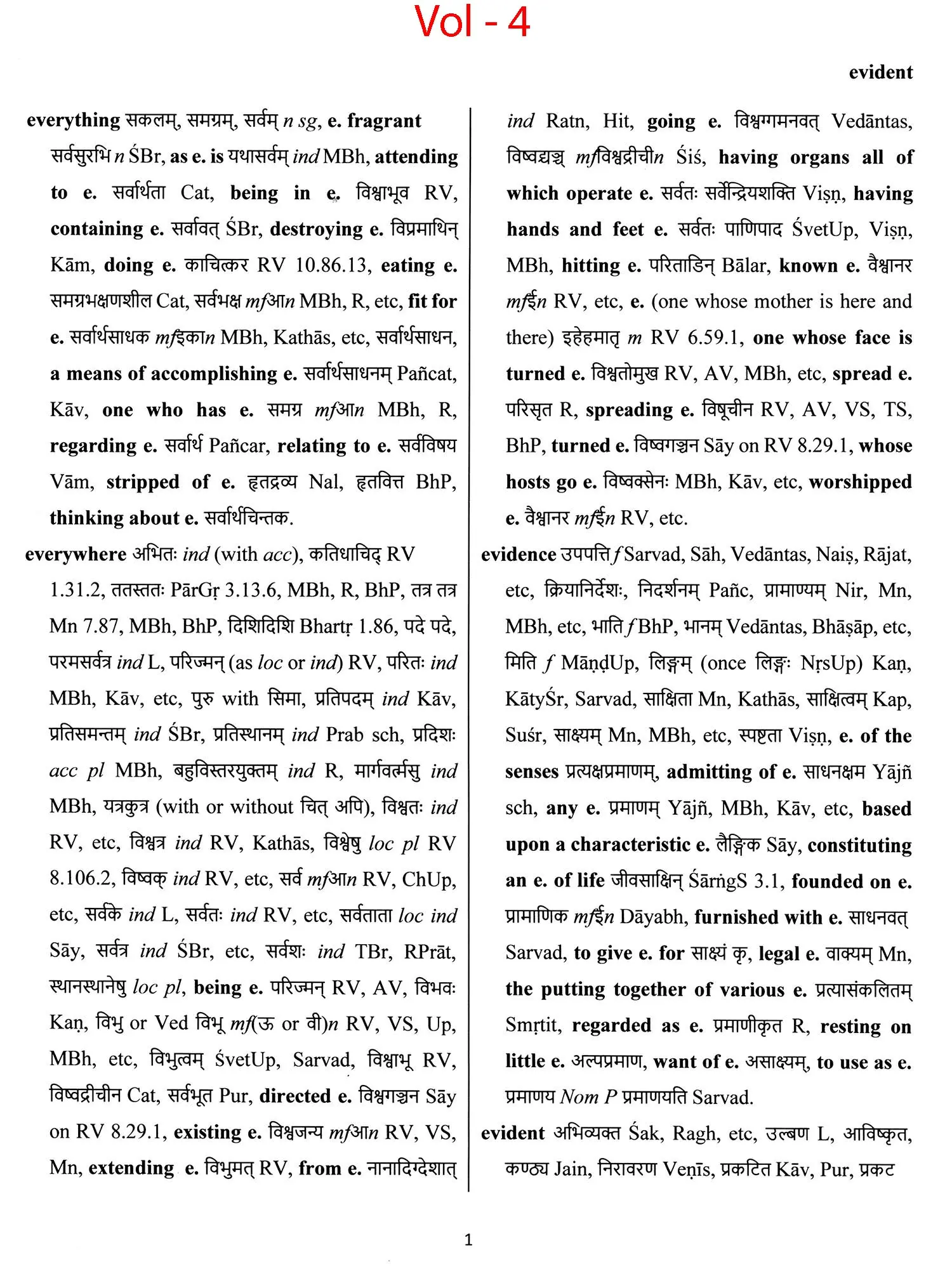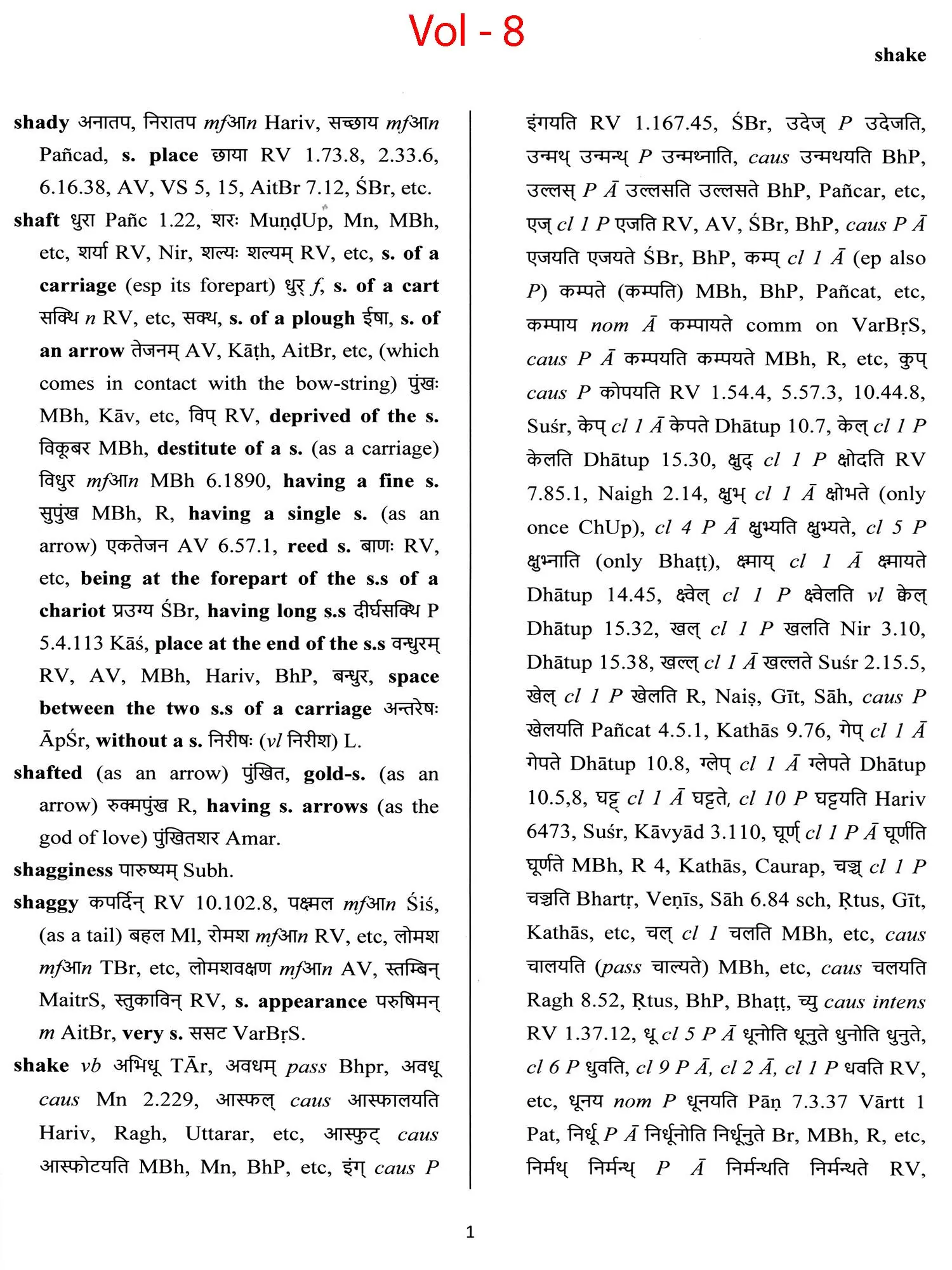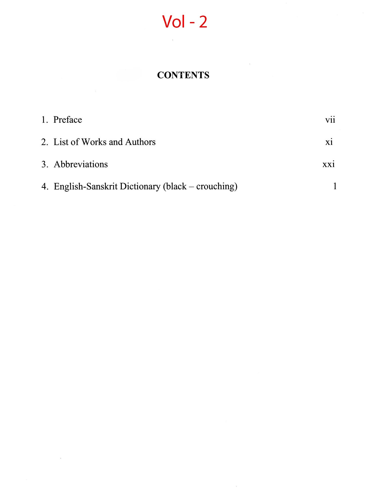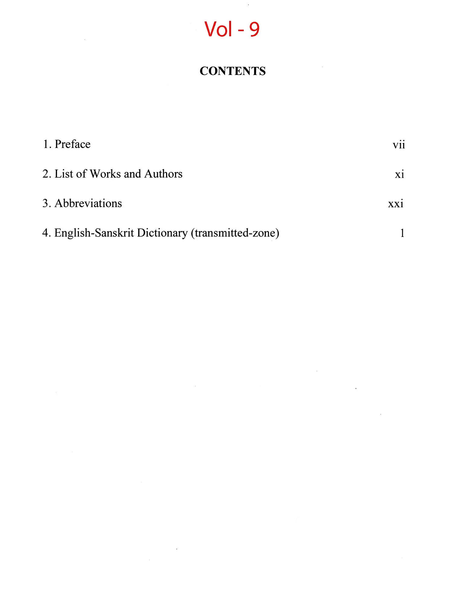 Sanskrit is rich in synonymy and this affluence is fully reflected in the overflow of Sanskrit words for any English vocable. Sir Monier Monier-Williams compiled his magnum opus, A Sanskrit-English Dictionary which appeared from the Clarendon Press in 1899. Prof. Raghu Vira compiled this English-Sanskrit Dictionary to include each and every item from Monier-Williams. This grandfather dictionary which will run to ten volumes was compiled as a basic component for the creation of new words in Indian languages. This dictionary with colossal number of Sanskrit nouns, verbs, adjectives etc. for every semanteme in English ensures that Indian languages will never stand in dearth of fullest expression. Scientific interest demands specialization and infinite ramification of technical terms. This dictionary is a vade mecum for creating terms for humanities as well as for the natural sciences.