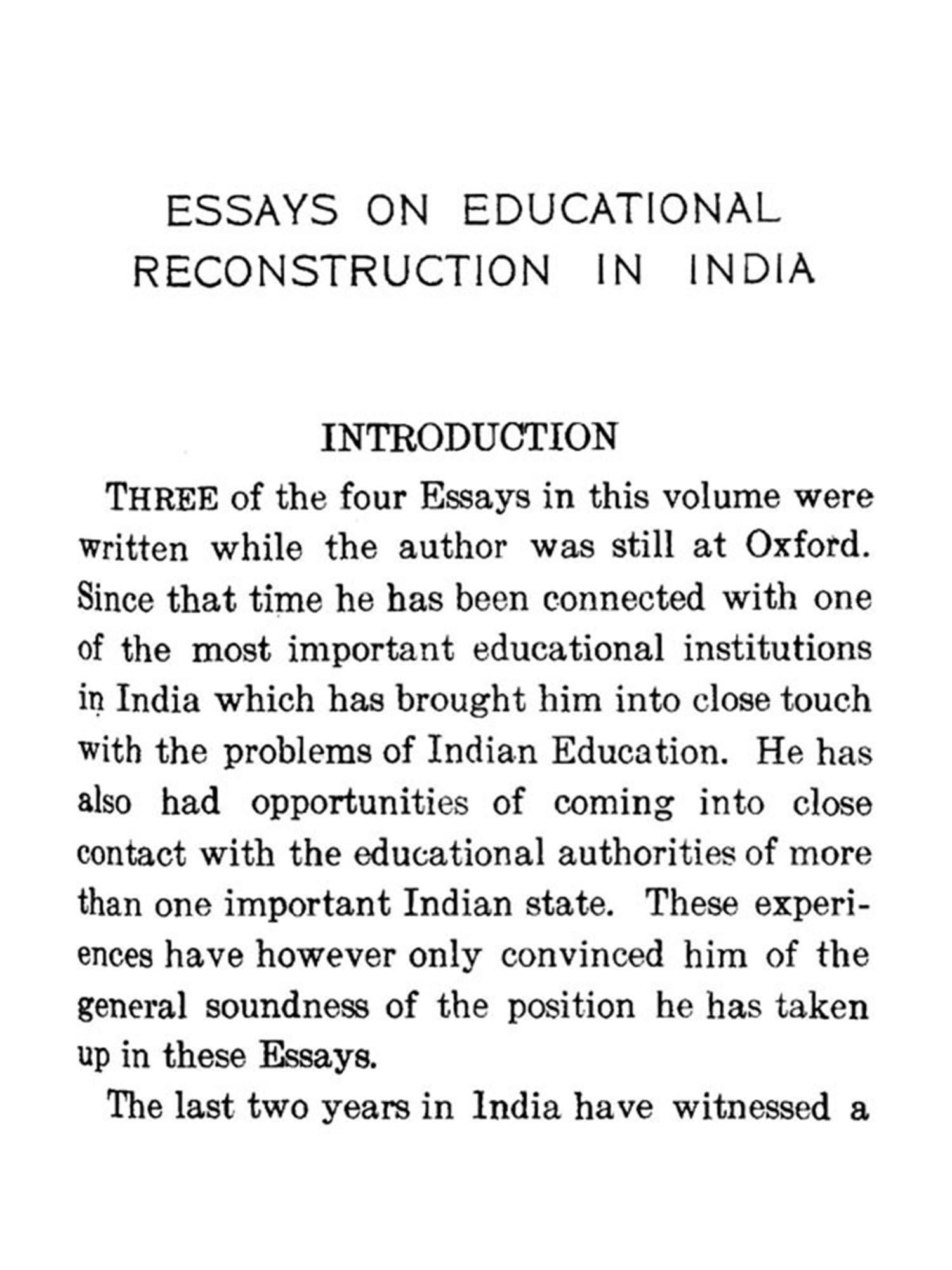 THREE of the four Essays in this volume were written while the author was still at Oxford. Since that time he has been connected with one of the most important educational institutions in India which has brought him into close touch with the problems of Indian Education. He has also had opportunities of coming into close contact with the educational authorities of more than one important Indian state. These experiences have however only convinced him of the general soundness of the position he has taken up in these Essays.