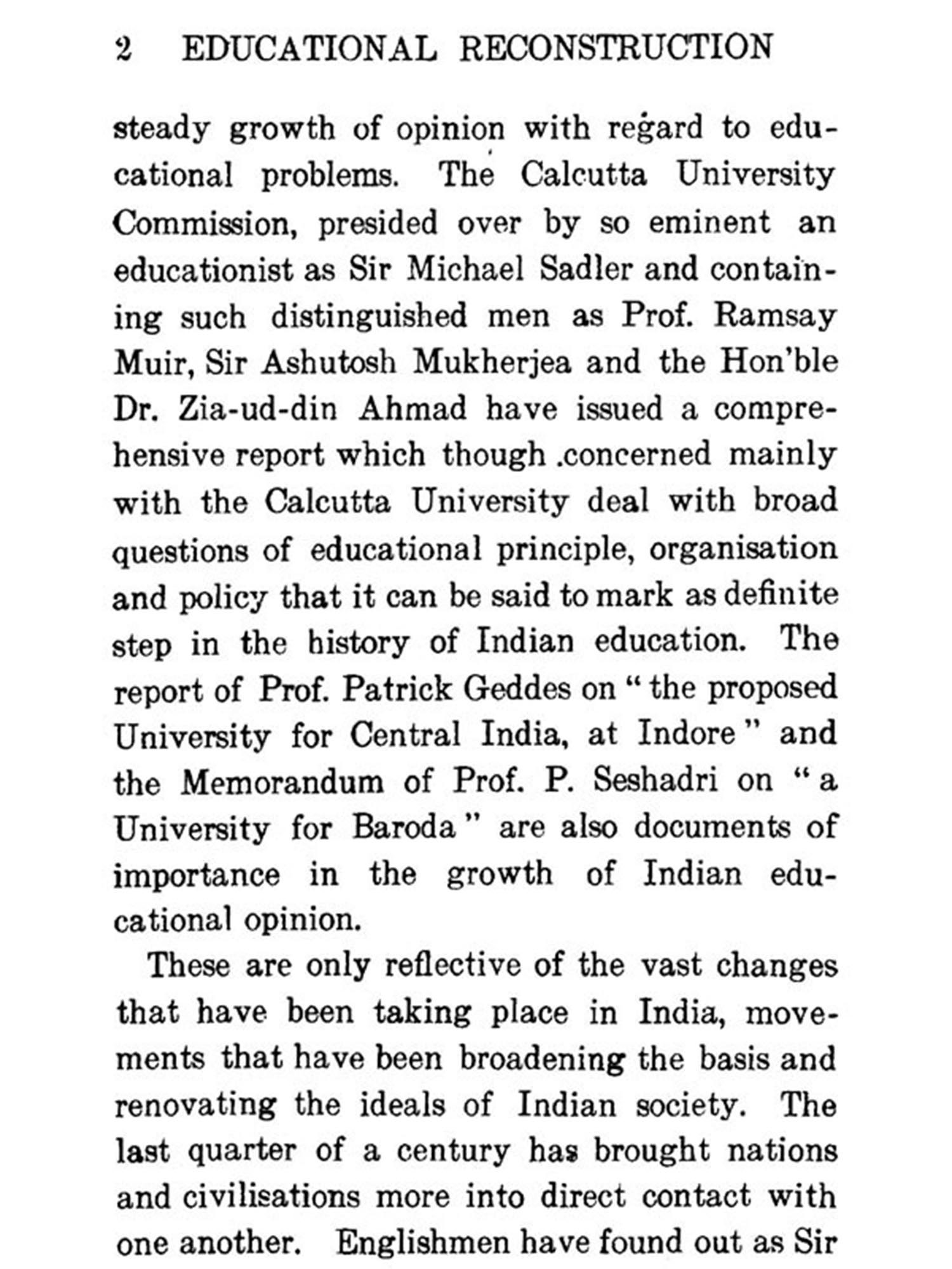 The last two years in India have witnessed a steady growth of opinion with regard to educational problems. The Calcutta University Commission, presided over by so eminent an educationist as Sir Michael Sadler and containing such distinguished men as Prof. Ramsay Muir, Sir Ashutosh Mukherjea and the Hon'ble Dr. Ziauddin Ahmad have issued a comprehensive report which though. concerned mainly with the Calcutta University deal with broad questions of educational principle, organisation and policy that it can be said to mark as definite step in the history of Indian education. The report of Prof. Patrick Geddes on "the proposed University for Central India, at Indore" and the Memorandum of Prof. P. Seshadri on "a University for Baroda" are also documents of importance in the growth of Indian educational opinion.