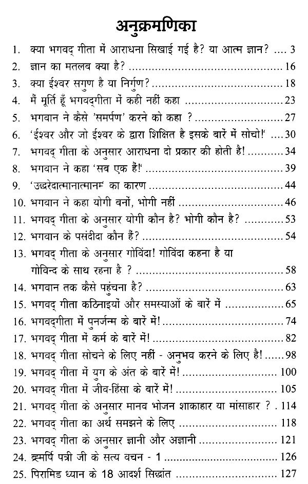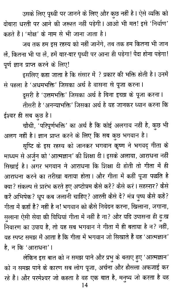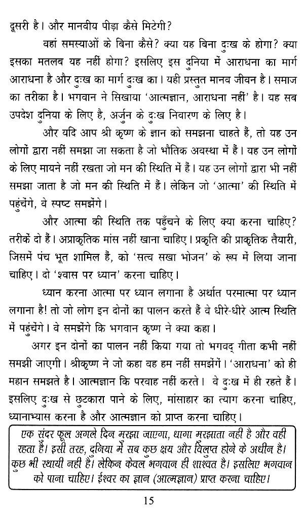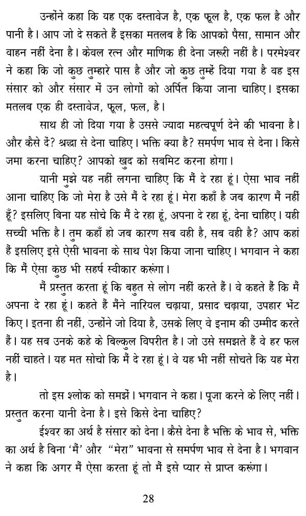 अगर पूजा से सभी समस्याओं का समाधान हो जाता है तो भगवान को धरती पर आने की कोई आवश्यकता नहीं है। सभी नारों के माध्यम से उपदेश देने की कोई आवश्यकता नहीं है। इसलिए, सबसे ऊपर, भगवान ने कहा। अभ्यास महत्वपूर्ण है। भगवान ने भगवद् गीता में जो कुछ भी सिखाया है वह दुख को दूर करने का मार्ग है, मोक्ष का मार्ग है। यही बात सभी पर लागू होती है। ब्रह्मर्षि पत्री जी के मार्गदर्शन में, यह पुस्तक भगवान श्री कृष्ण द्वारा सिखाए गए साधना मार्ग का अनुसरण करते हुए, भगवान श्री कृष्ण द्वारा सिखाए गए ज्ञान के विशाल सागर में सीखे गए कुछ सत्यों को आप तक पहुँचाने का एक छोटा सा प्रयास है। आशा है कि पाठक पड़ेंगे, समझेंगे, अभ्यास करेंगे और आगे बड़ेंगे...।