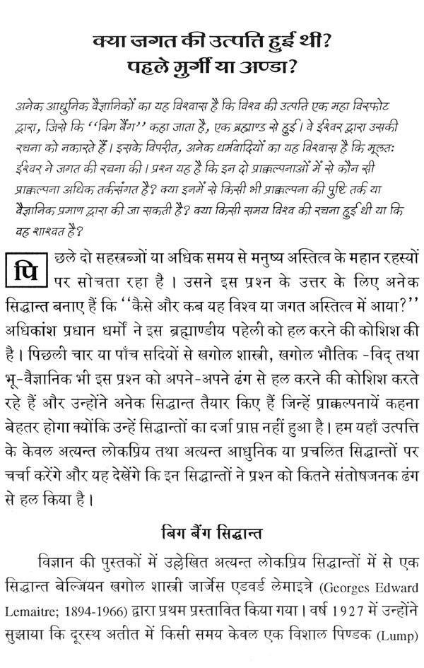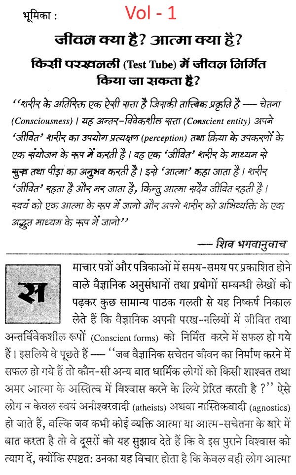 इस पुस्तक के लेखक के मन में बहुत दीर्घ काल से यह भावना रही है कि यदि विज्ञान की विभिन्न शाखाओं के निष्कर्षों पर निष्पक्ष रूप से तथा किसी भी प्रकार की 'भौतिकवादी उप-धारणाओं' (Materialistic presumptions) तथा 'विकासात्मक अभिनति' (Evolutionary Bias) के बिना विचार किया जाय और साकल्यवादी रीति (Holistic manner) से उन्हें सह-सम्बद्ध (correlate) करते हुए उनका अध्ययन किया जाय तो वे विश्व, समय-चक्र, विश्व इतिहास तथा स्व-अभिज्ञ मन (self-aware mind) या आत्मा सम्बन्धी ईश्वर-प्रदत्त ज्ञान का समर्थन करेंगे। चूंकि प्राकृतिक विज्ञान का लक्ष्य भौतिक क्षेत्र में तथा आध्यात्मिक ज्ञान का लक्ष्य आध्यात्मिक तथा सामाजिक-आध्यात्मिक क्षेत्र में सत्य को खोजना है और चूंकि पदार्थ तथा मन या शरीर तथा आत्मा एक-दूसरे पर अन्तःक्रिया करते हैं, अतः लेखक ने यह सोचा कि वैज्ञानिकों तथा अध्यात्मवादियों को मिल-जुलकर ऐसे विषयांगों पर चर्चा करनी चाहिए जो कि दोनों के लिये रुचिकर हो, ताकि 'स्व' (self), जगत् तथा विश्व-वृत्तान्तों का तथा लौकिक एवं पारलौकिक दोनों ही प्रकार के समग्र सत्य का एक सशक्त तथा संगत रीति से सुग्रथित, सम्बद्ध तथा स्पष्ट अवबोध प्राप्त हो सके ।