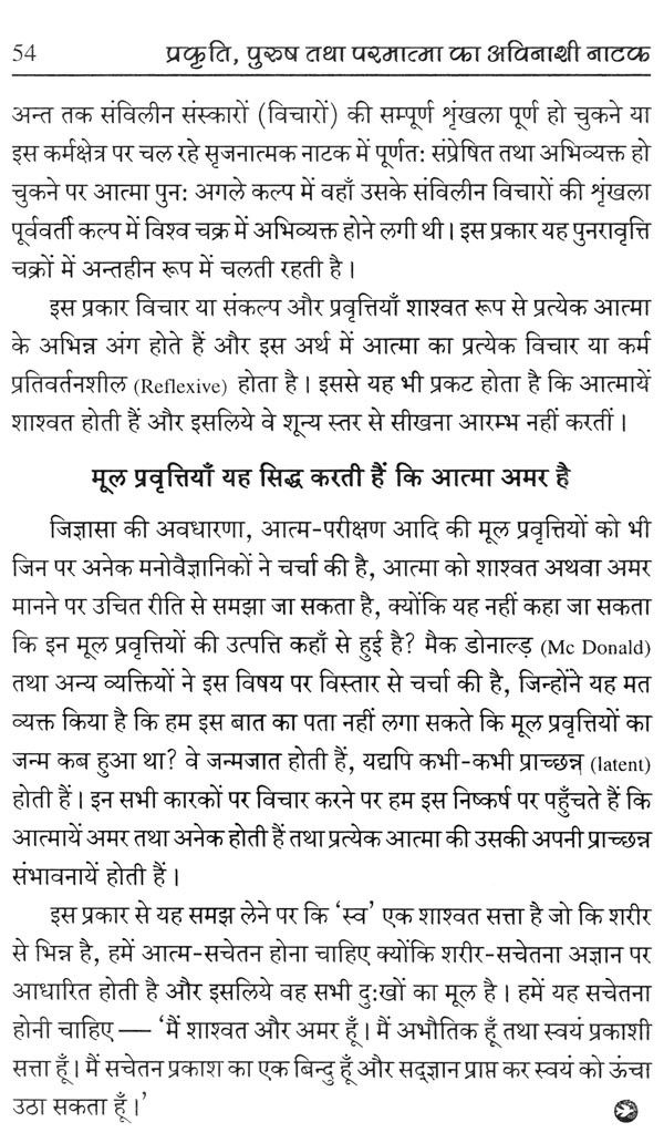 तथापि, लेखक को यह अनुभव हुआ कि उसने यह उपक्रम आरम्भ करने का कोई विशेष प्रशिक्षण प्राप्त नहीं किया है। किन्तु अन्य लोगों के साथ विचारों के आदान-प्रदान की उसकी इच्छा और 'स्व', त्रैलोक्य तथा विश्व-इतिहास के स्वरूप से सम्बन्धित उसके स्वयं के अवबोध ने उसे इस दिशा में कुछ करने के लिये प्रेरित किया। इसके अतिरिक्त, अनेक देशों में विभिन्न विद्या-शाखाओं में पारंगत विद्वानों के साथ लेखक ने जो चर्चायें कीं, उन चर्चाओं ने उनसे उसे यह जोखिम उठाने का कुछ आत्म-विश्वास प्राप्त हुआ चाहे जोखिम जितनी भी बड़ी हो, क्योंकि उसने सोचा कि इससे कम-से-कम उन कुछ अन्य व्यक्तियों को, जो कि अधिक ज्ञान-सम्पन्न हैं, भविष्य में ज्ञान के प्रसार के हित में कोई अधिक सफल उपक्रम करने की प्रेरणा मिलेगी। इसलिये, सेवा की अभिप्रेरणा से. अन्ततः लेखक ने अपनी योजना आरम्भ की। यह बात ध्यान में रखी जानी चाहिए कि लेखक विज्ञान के किसी भी क्षेत्र में पारंगतता का दावा नहीं करता। अधिक-से-अधिक वह यह दावा कर सकता है कि उसने ब्रह्माकुमारी संस्था में इस महान आन्दोलन के संस्थापक से कुछ वर्षों तक कुछ आध्यात्मिक प्रशिक्षण प्राप्त किया है तथा विज्ञान की कुछ शाखाओं का एक निष्पक्ष, 'प्रारम्भिक श्रेणी का' अध्ययनशील छात्र तो वह रहा है। इसलिये, वह विनम्रतापूर्वक यह निवेदन करता है कि इस पुस्तक को ज्ञान के मंथन का कार्य आरम्भ करने के एक छोटे-से प्रयास में वह अन्य लोगों को निमन्त्रित करता है।