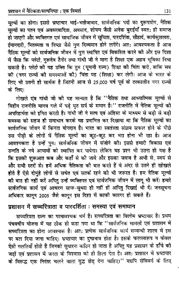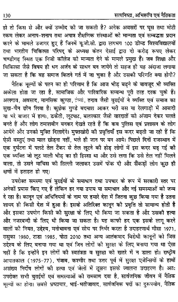 लोक सेवा में व्याप्त भ्रष्टाचार को समाप्त कर लोक उत्तरदायित्व की संस्कृति के प्रसार हेतु सत्यनिष्ठा की एकमात्र पगडण्डी पर चलने की आवश्यकता है। नैतिक अभिरूचि के विकास हेतु न सिर्फ सिविल सेवा के प्रशिक्षण में ध्यान दिए जाने की आवश्यकता है, बल्कि परिवार, समाज और शैक्षणिक संस्थाओं को मानवीय मूल्यों के विकास में इस प्रकार कार्य करने की आवश्यकता है, ताकि सिविल सेवा के भर्ती के चरण में ही नैतिक कसौटियों पर कसे हुए, सत्यनिष्ठ ओज से युक्त तेजस्वी अधिकारी/सिविल सेवक भारतवर्ष को प्राप्त हों।
