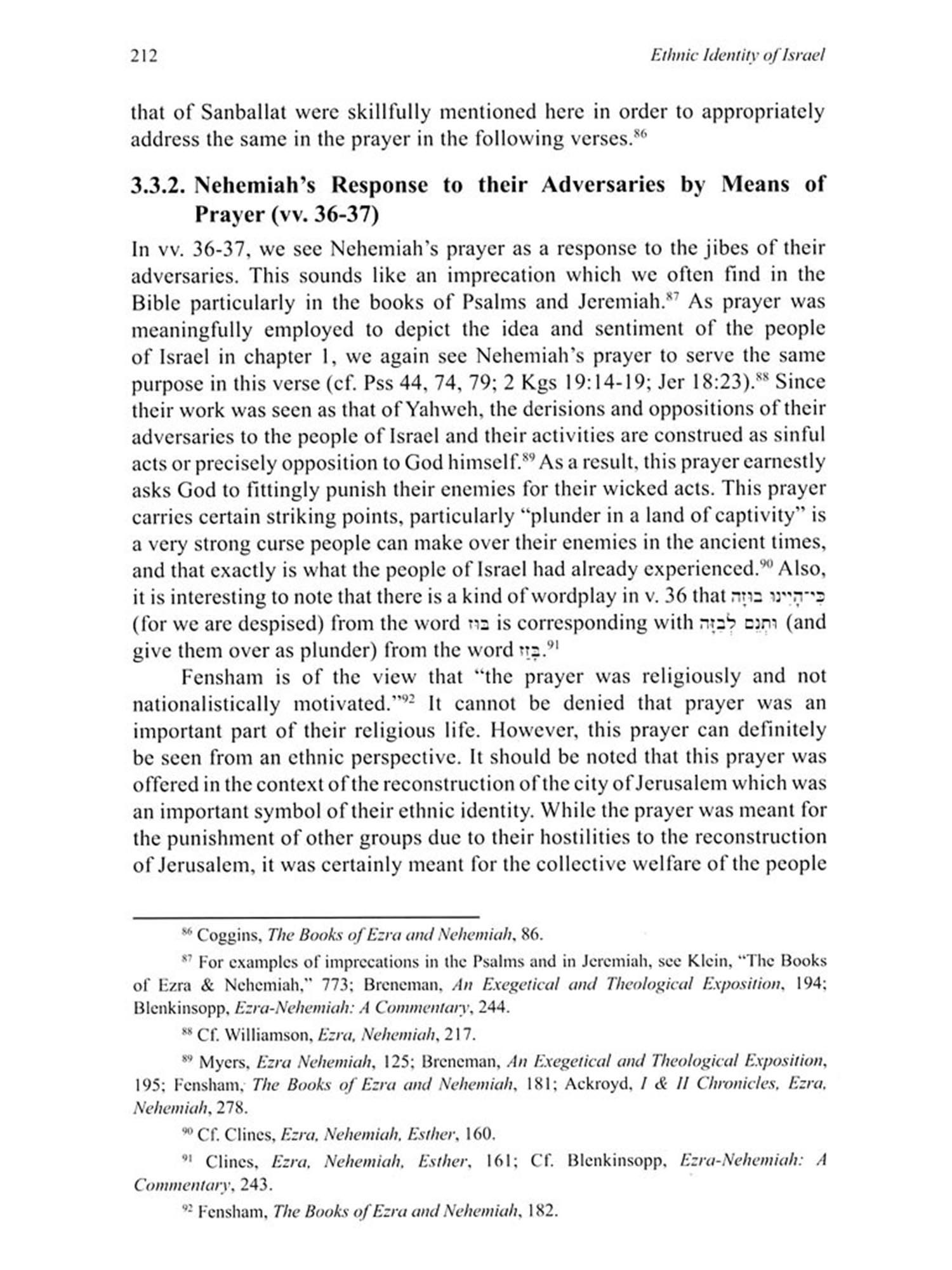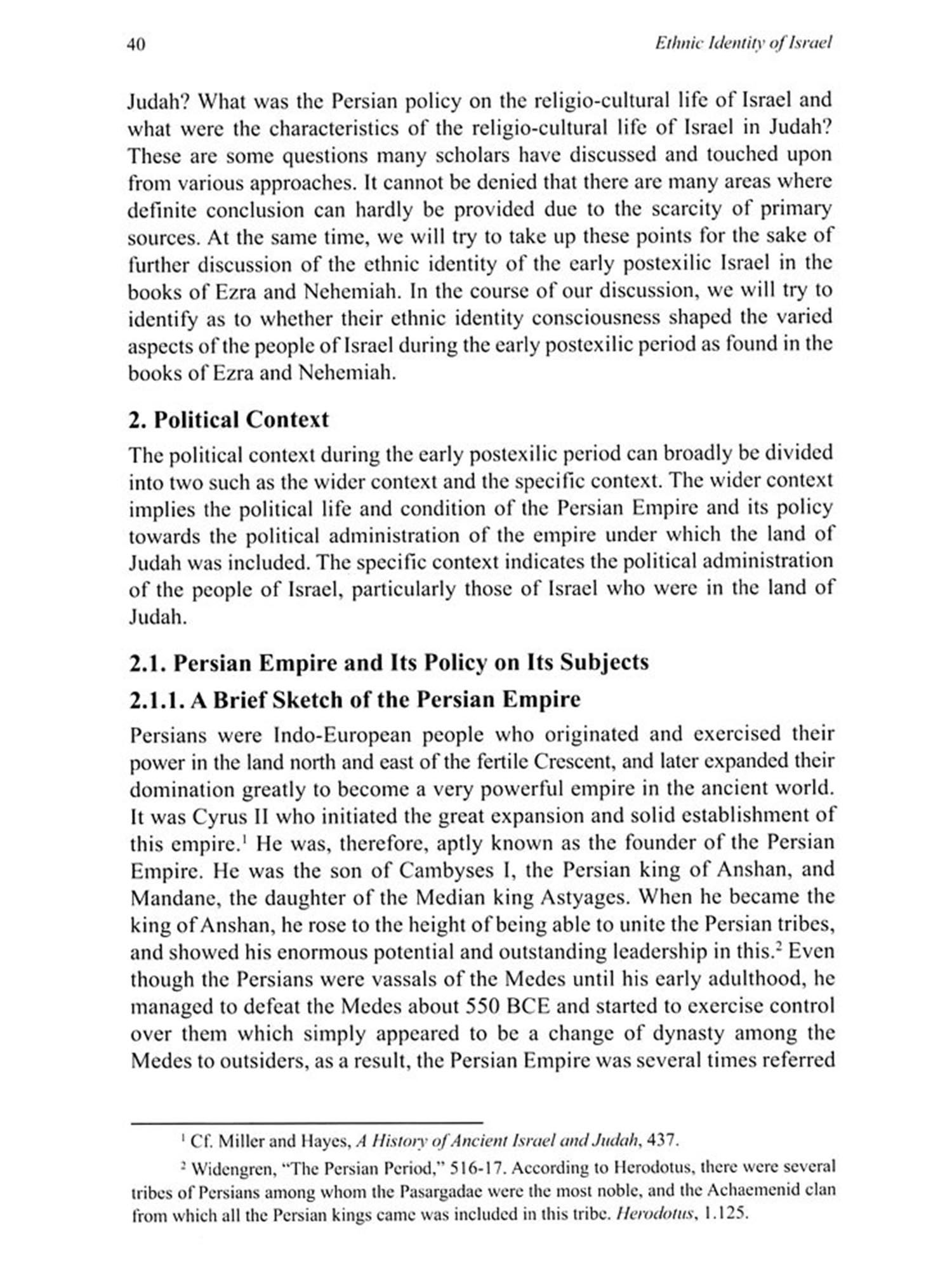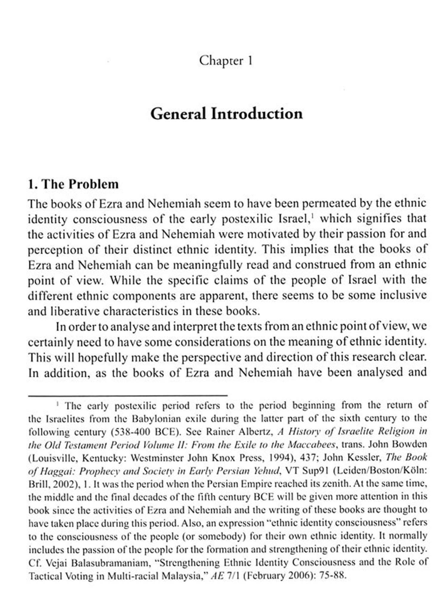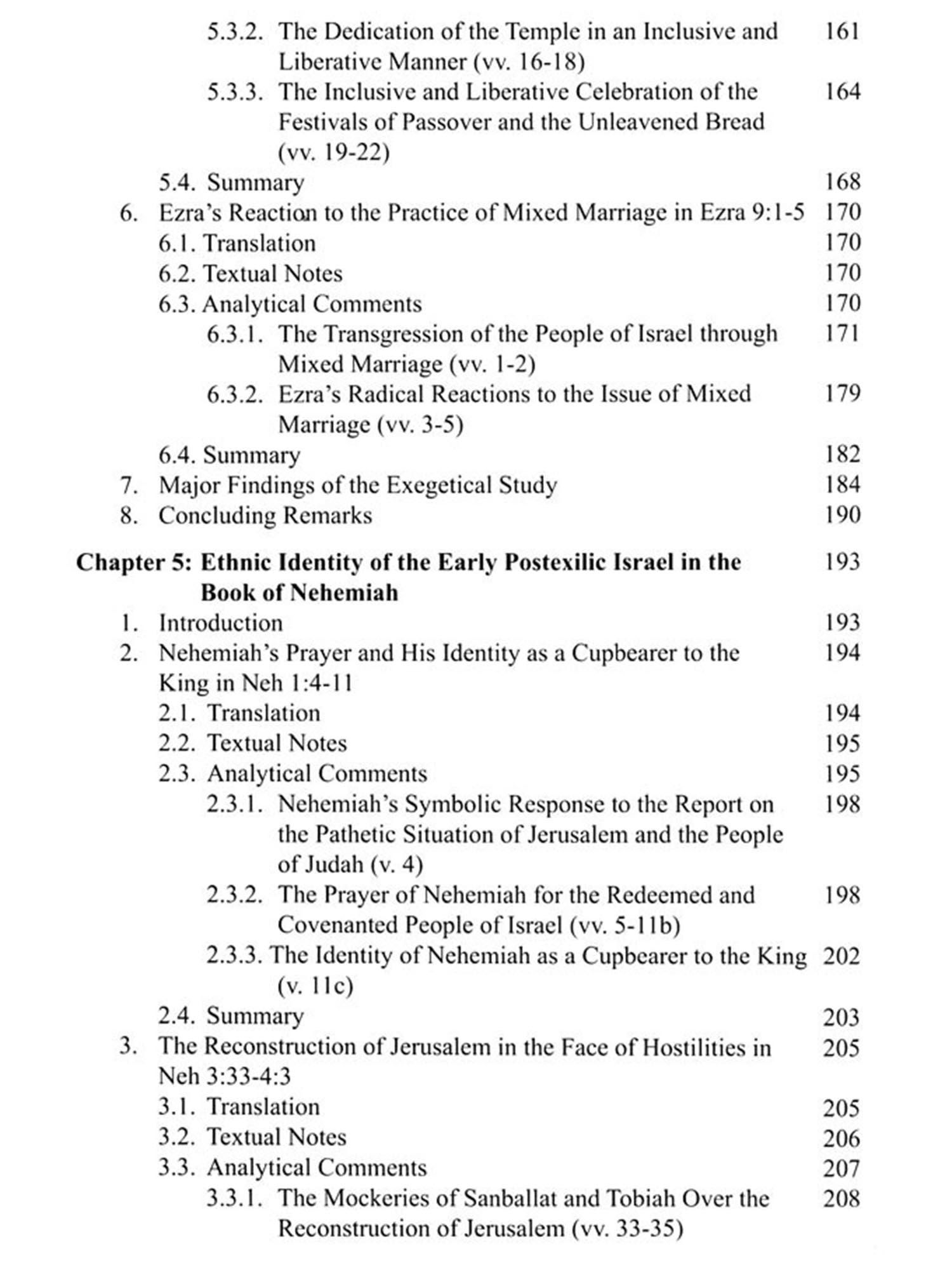 This book is a study of the different issues in the books of Ezra and Nehemiah from the perspective of ethno-symbolism. There is a view that the issues embedded in these books were chiefly shaped by the political factors of the given period, whereas some would think that the socio-economic or religious factors mainly moulded the different issues in these books. Without denying the roles of the mentioned factors, this book takes the ethnic identity consciousness of the early postexilic Israel as the main factor that chiefly shaped the life of the people of Israel and the whole process of the composition of the books of Ezra and Nehemiah. It is observed that the accessible resources in the political, socio-economic and religio-cultural life were selectively, situationally and subjectively utilized to form and stabilize the ethnic identity of the early postexilic Israel. It is also maintained that while the different issues were employed specifically in moulding the people of Israel, there are certain inclusive and liberative aspects that shaped these books and their narratives.