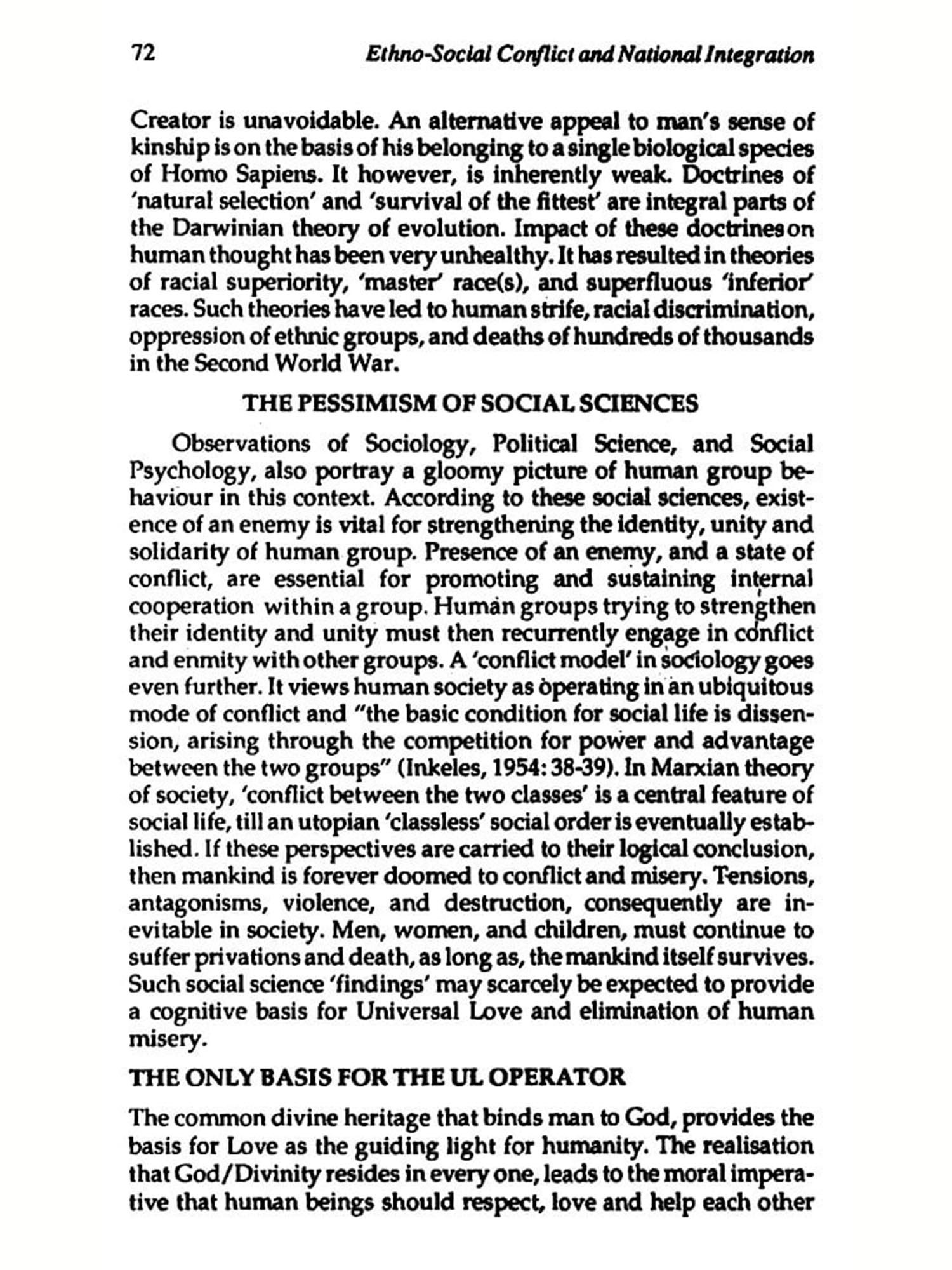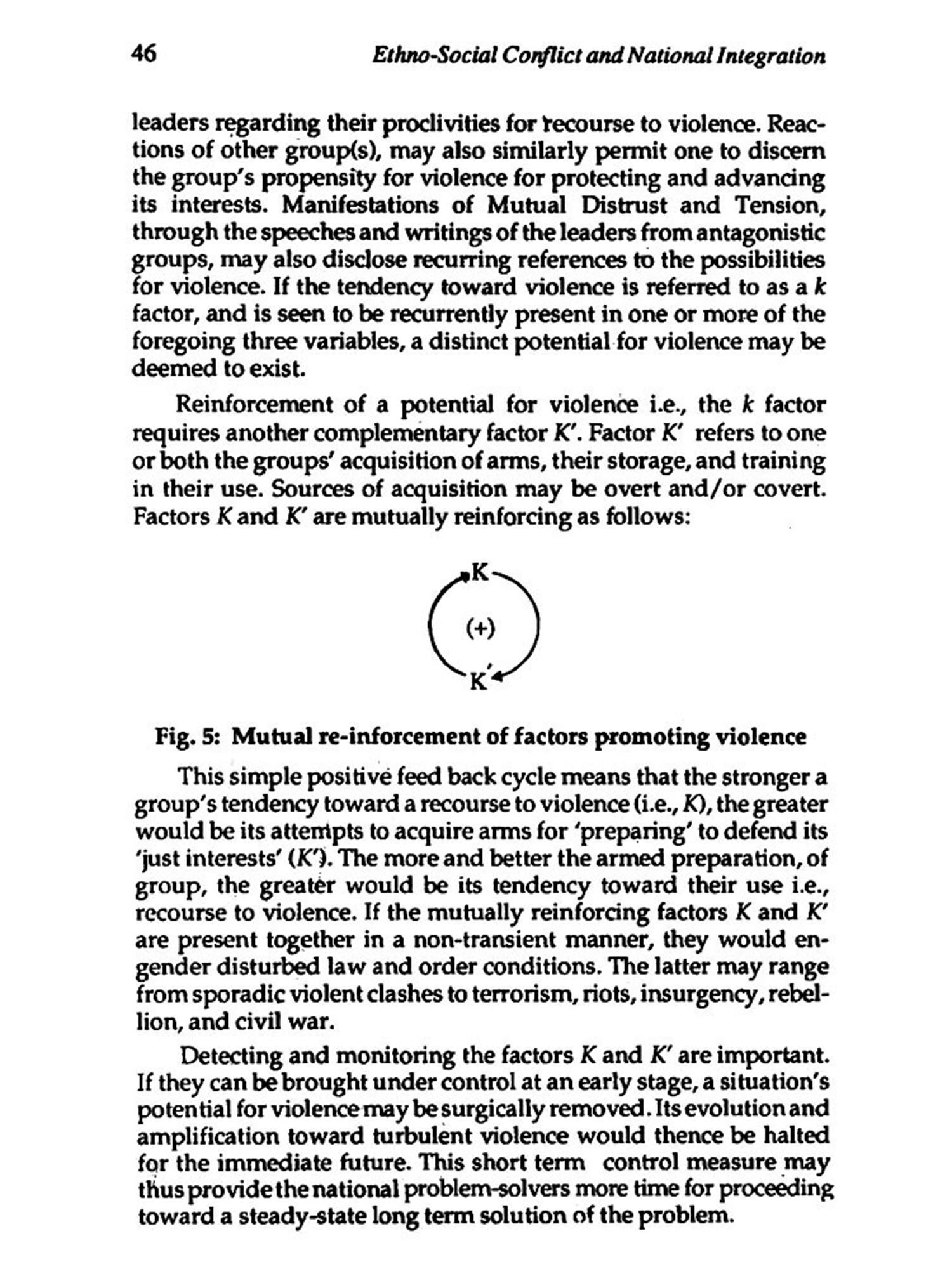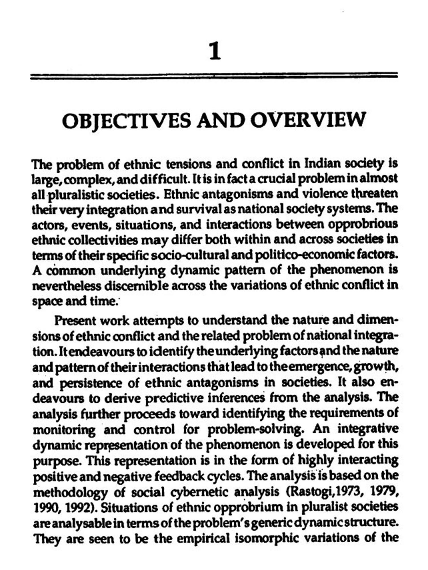 Short term and long term policy measures for the resolution of the problem are identified from its dynamic multi-cyclical structure. Explanation, prediction, monitoring, and control, of the problem situation emerge as inter-related phases of an unified pattern of social cybernetic analysis. The analysis enables one to uncover the 'what', 'why', 'how', 'when' and 'what needs to be done' aspects of ethno-social conflict and its obverse of national integration. On account of its grim and dark nature, inter-group conflict is also viewed as part of the larger problem of human misery and suffering in social systems. The lasting solution of the problem is thence seen to be embedded in the solution of the larger problem of human misery.