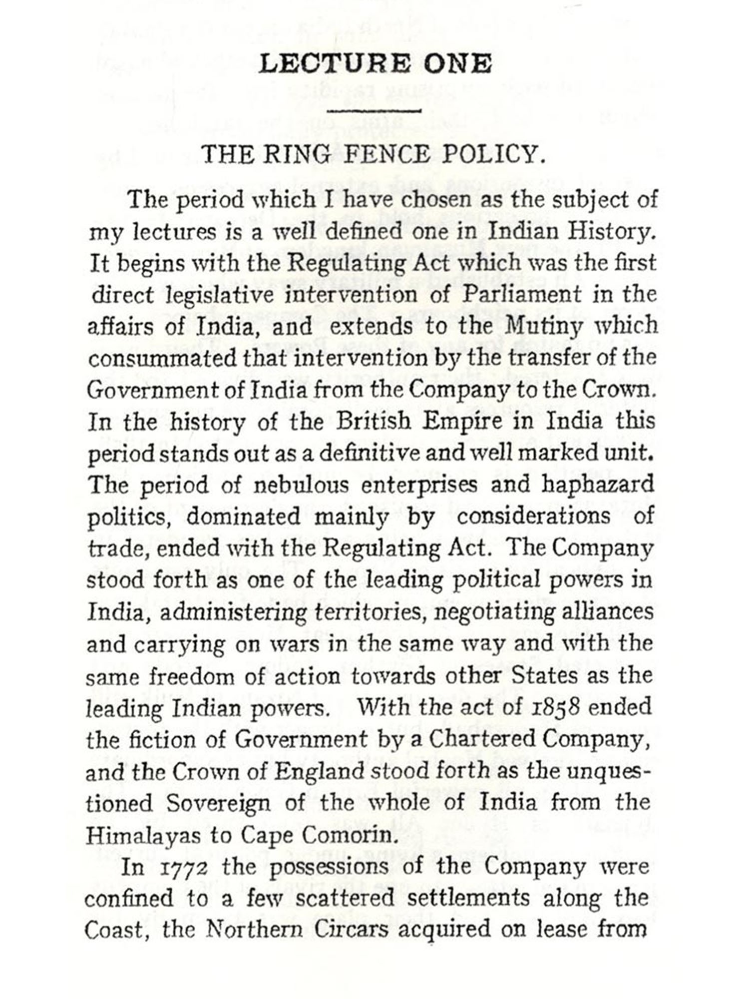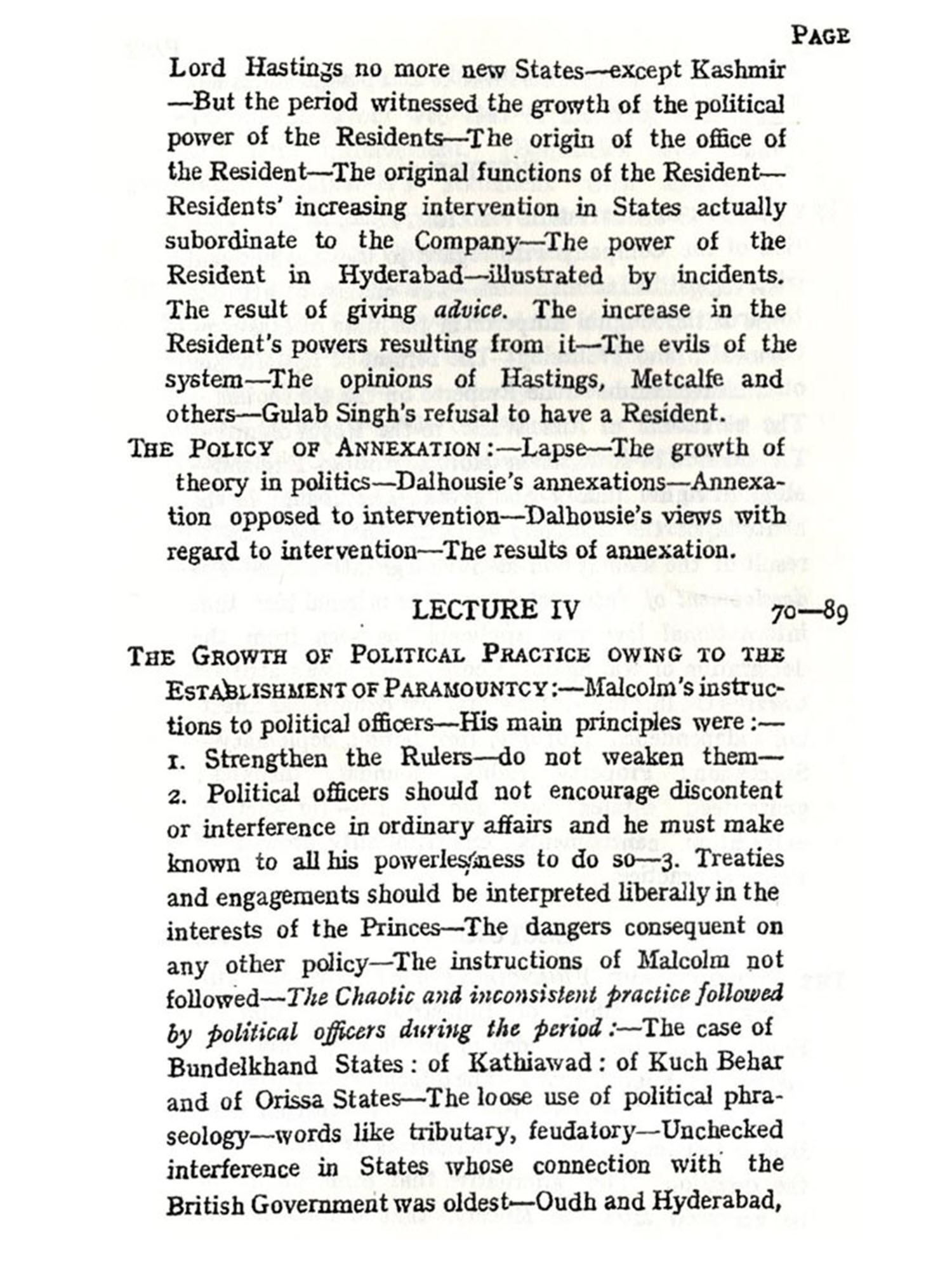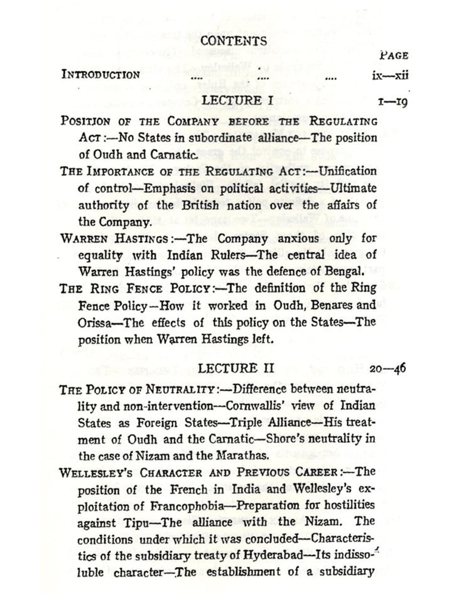The subject I have chosen for these lectures is entitled the Evolution of British Policy towards Indian States from 1774 to 1858. I should like to make it clear at the very start that these lectures are not meant to cover the history of the period indicated. My purpose is only to trace the gradual evolution of a definite policy towards Indian States. It is therefore only with an aspect of British Indian history that I am concerned. It is true that the aspect I have chosen is not only an important aspect but one that provides the clue for the interpretation of the general policy of the Company. This may seem to be an extravagant claim, but when it is remembered that the relations with Indian States constituted the foreign policy of the Company, and the establishment of the British Empire in India outside Bengal was the gradual outcome of that policy, the claim will no doubt be granted by all fair-minded critics.
