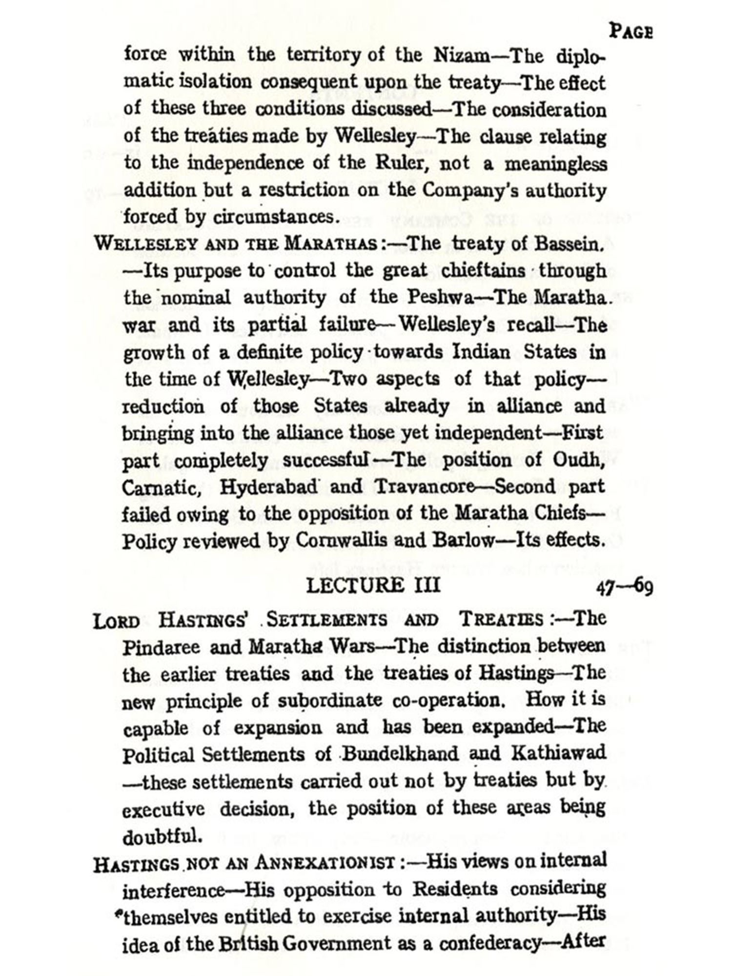 Thus there is no dearth of published material for a connected study of British policy towards the States for the period which we have selected. But so far no one has attempted it. Nor do I claim that these lectures provide such a study. In so short a course as 6 lectures it is impossible to attempt anything more than an outline; but I hope that outline would be sufficiently clear and would bring out the essentials of a policy which by the circumstances of Indian historical growth was at all times complicated by numerous side-issues and the widely differing temperaments and character of the Governors-General and of the administrative officers entrusted with the conduct of that policy, but which none the less had a significant unity from the very beginning.