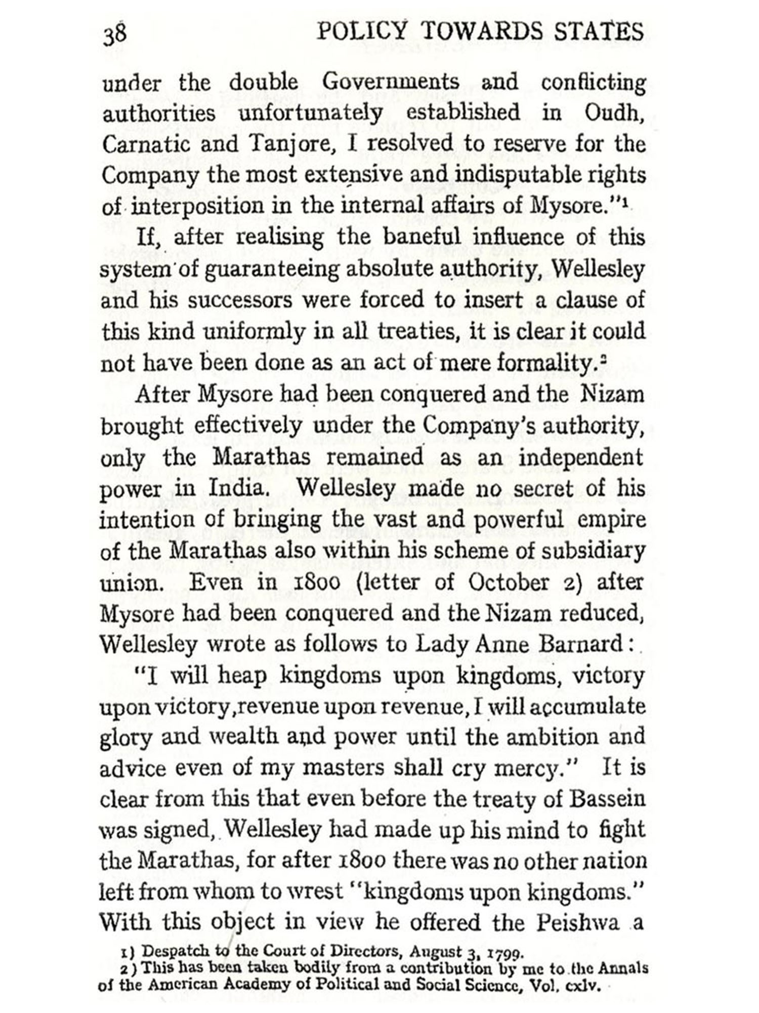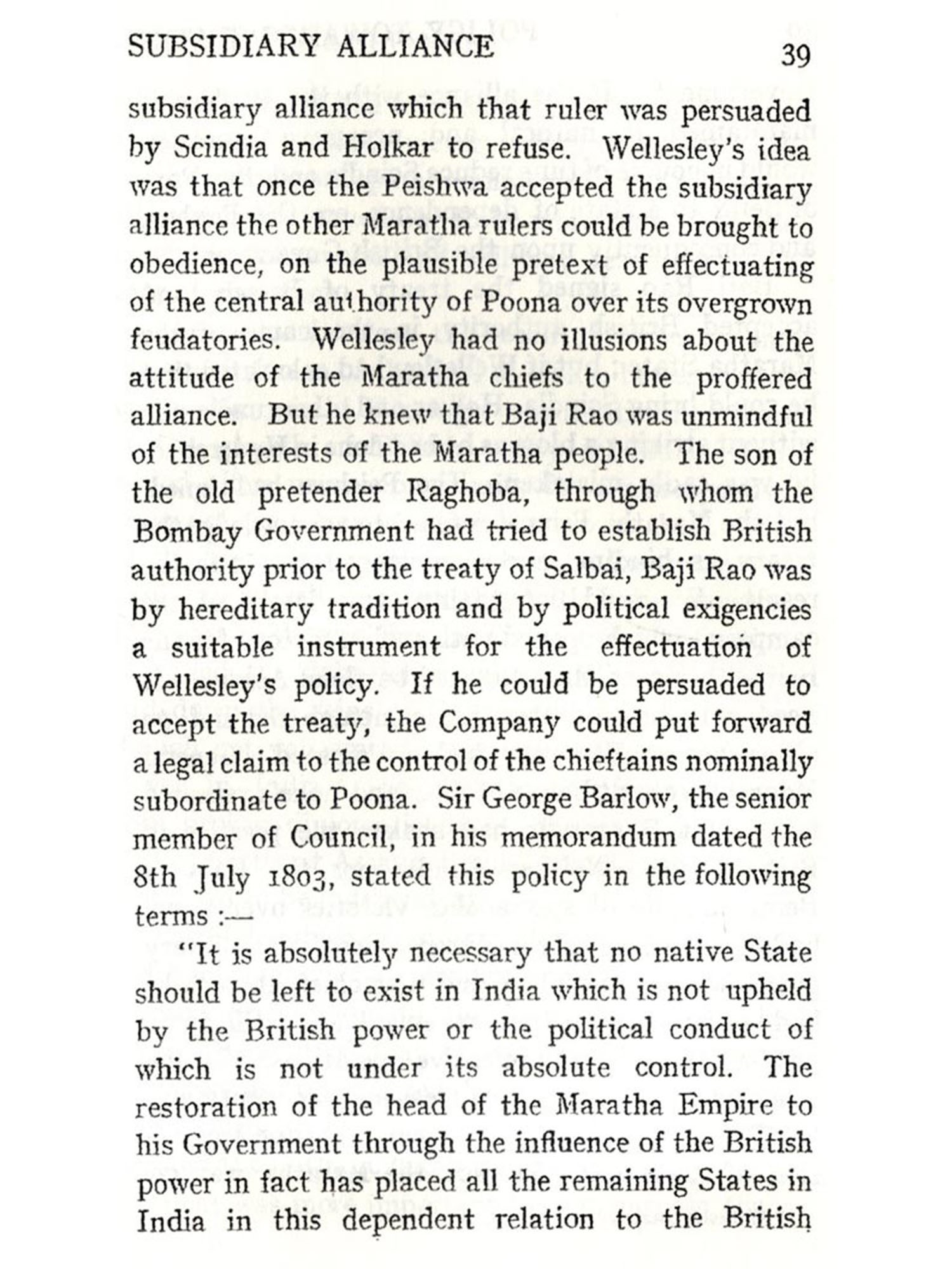 Though the importance of this aspect of Indian history is therefore undeniable, so far it has been neglected both by our historians and by our Universities. Of isolated events and incidents, or in relation to individual States, we have many admirable monographs. Thus with regard to the relation of the Company with Hyderabad, we have Brigg's excellent book, 'The Nizam, his history and relation with the British Government,' and Frazer's 'Nizam, our Faithful Ally. With regard to the Gaekwar again there is an interesting monograph by Colonel Wallace entitled the 'Gaekwar and his realtions with the British Government. Hope's 'House of Scindia, Cunningham's 'History of the Sikhs,' Basu's 'Story of Satara' and numerous other books deal with the relations of the British Government with individual States. The State papers of Gwalior have been arranged by Parasnis and published under the authority of Scindia's Government. The pecuniary transactions of Messrs. Palmer & Co., can be read with interest in the blue book published by the East India Company, and there are numerous parliamentary papers dealing with Oudh, Carnatic, Baroda, Hyderabad and Mysore. The general problem of subsidiary alliance is dealt with by B. S. Jones in a book entitled 'Papers relating to the progress of British power in India and the system of subsidiary alliance.' From the point of view of different Governors-General also there is much material available dealing with their administration. Warren Hastings wrote a long and detailed justification of his policy towards the States. The policy of Wellesley was defended in enthusiastic memoranda by his distinguished brother the Duke of Wellington and in our own days by Sydney Owen. But the best interpretation of his policy is contained in his own despatches and in the Wellesley manuscripts preserved in the British Museum.