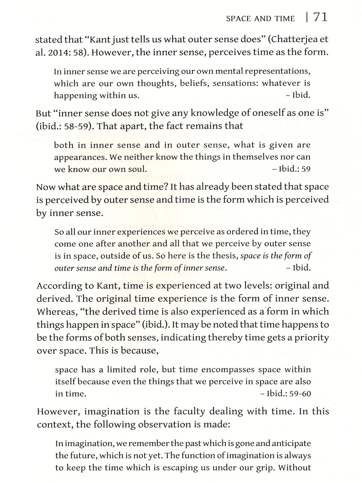 Space is perceived by outer sense and time in the form of inner sense. Both (space and time) cannot exist in themselves but that exist in us (human beings have representations of space-time). This is viewed by conscious human being subjectivity as time and the former is perceived objecting as space.