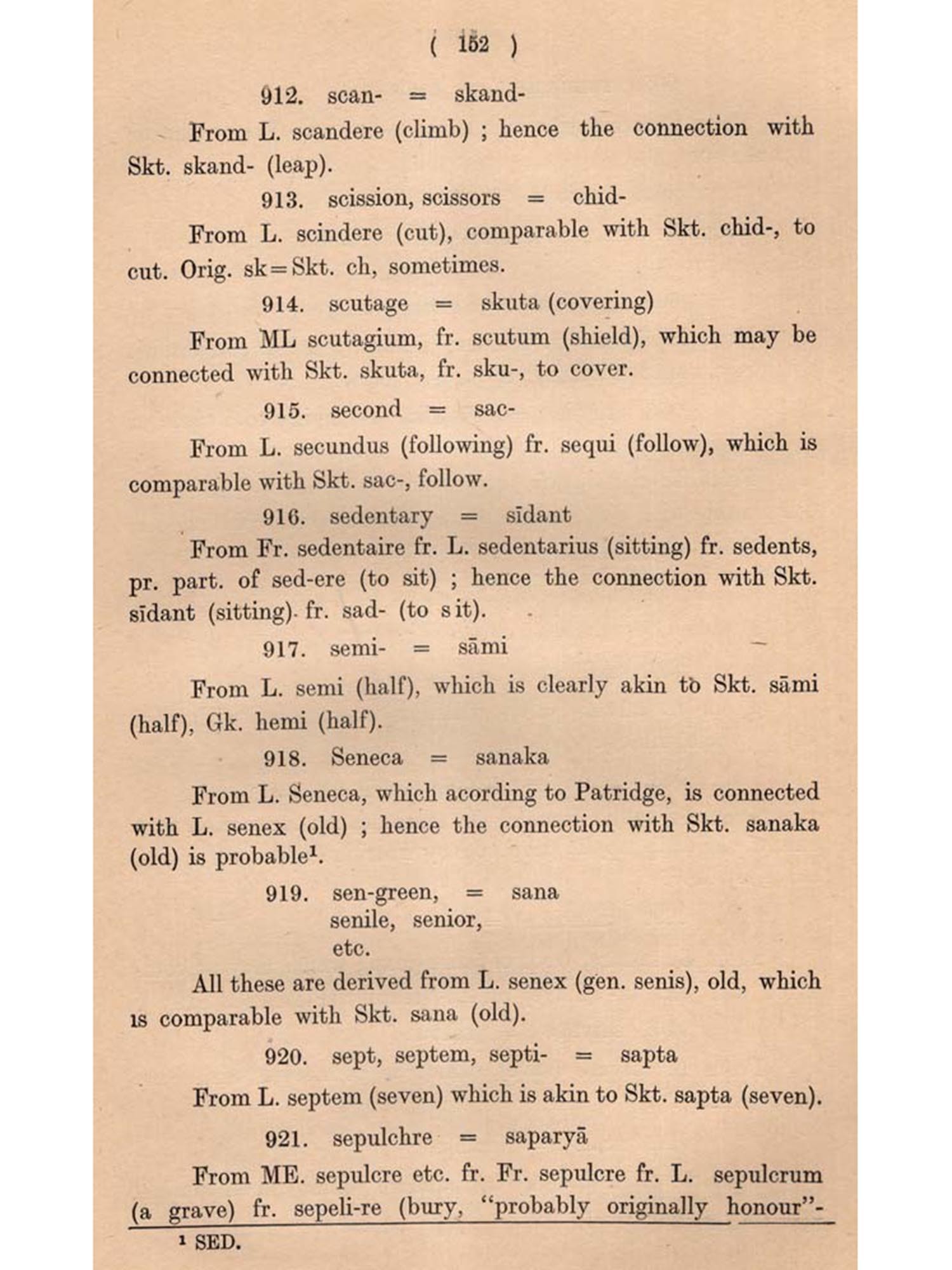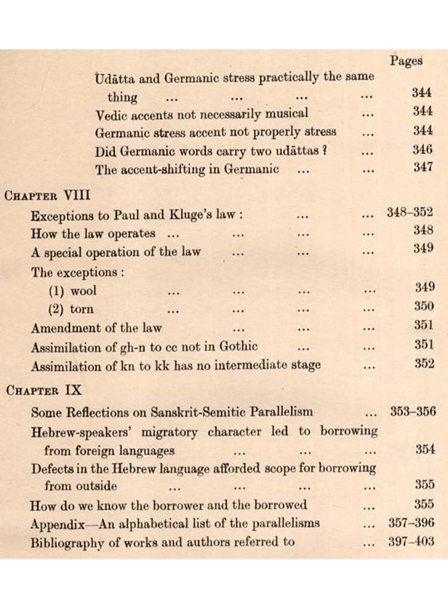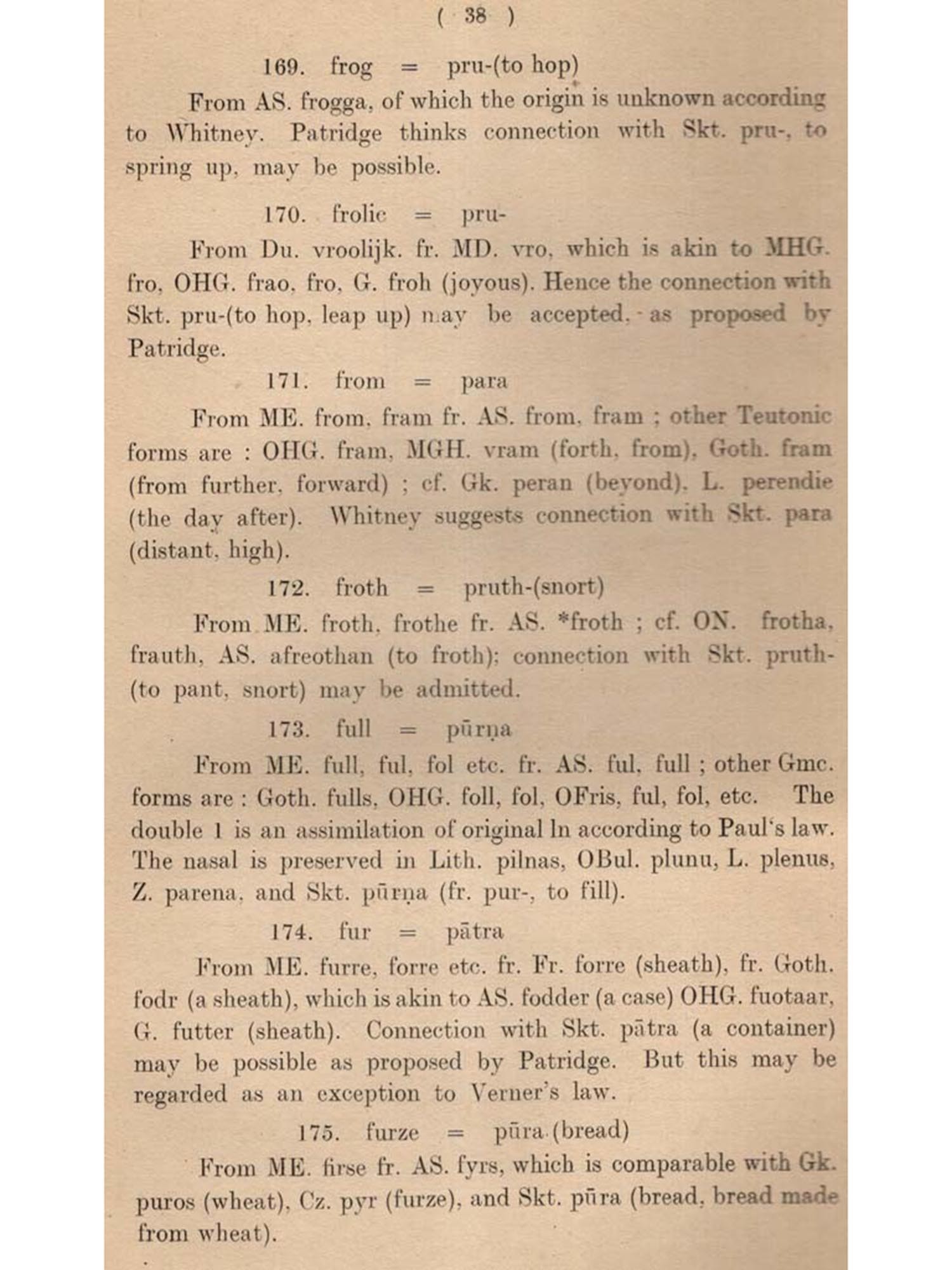 The present undertaking is intended to fulfil this need, bringing to the fore all the English and Sanskrit words which are cognate (connected, related, allied, kindred, akin, parallel, comparable). Besides cognate words, cases of borrowing by each other or from a third source have also been noted as constituting another class of common vocabulary. Another object behind this compilation of English and Sanskrit cognates is to see whether such a collection has any bearing on the Science of language. As will be evident from the following pages, a number of such bearings have come to our notice. These mainly relate to some Phonetic Laws.