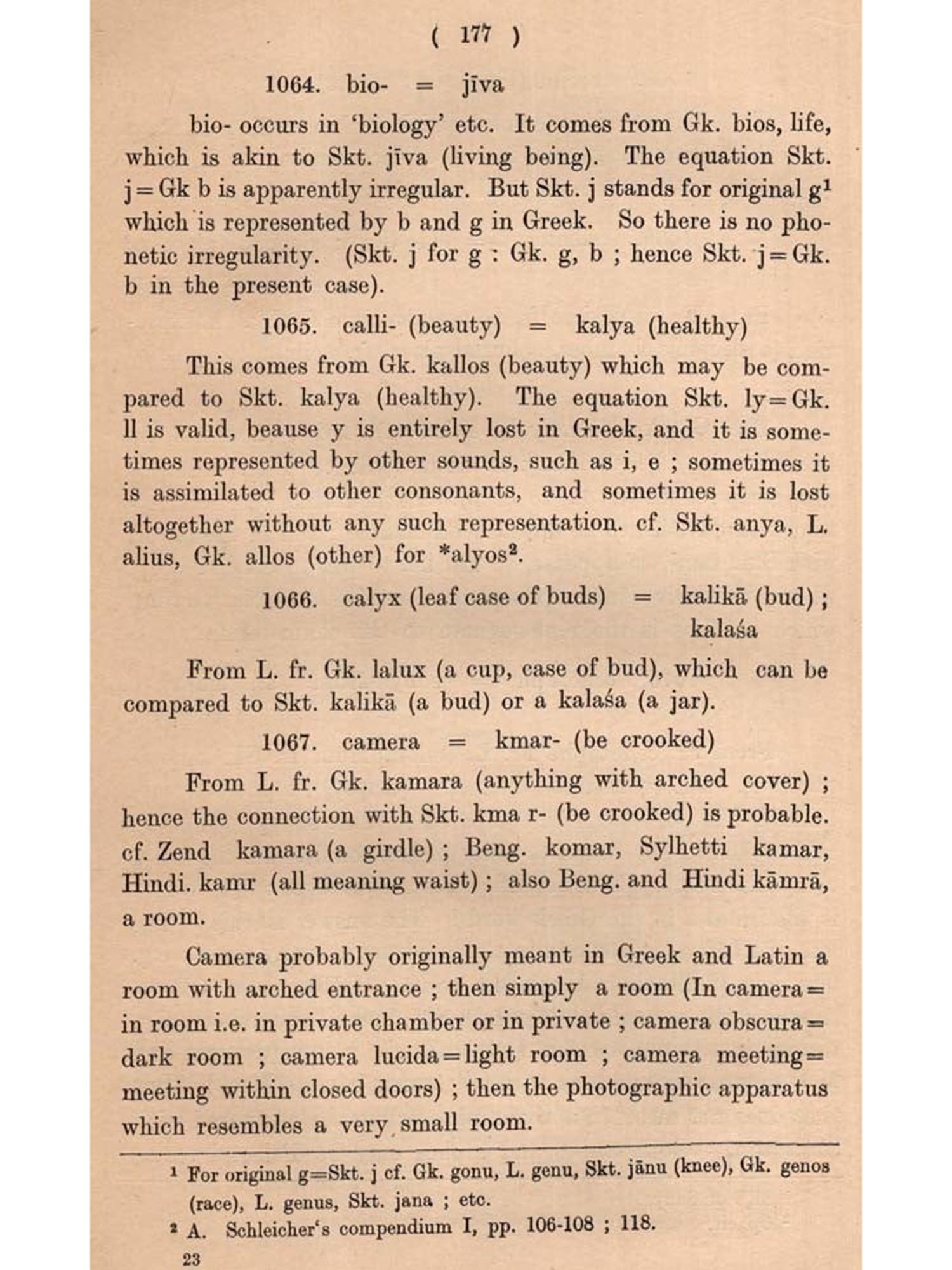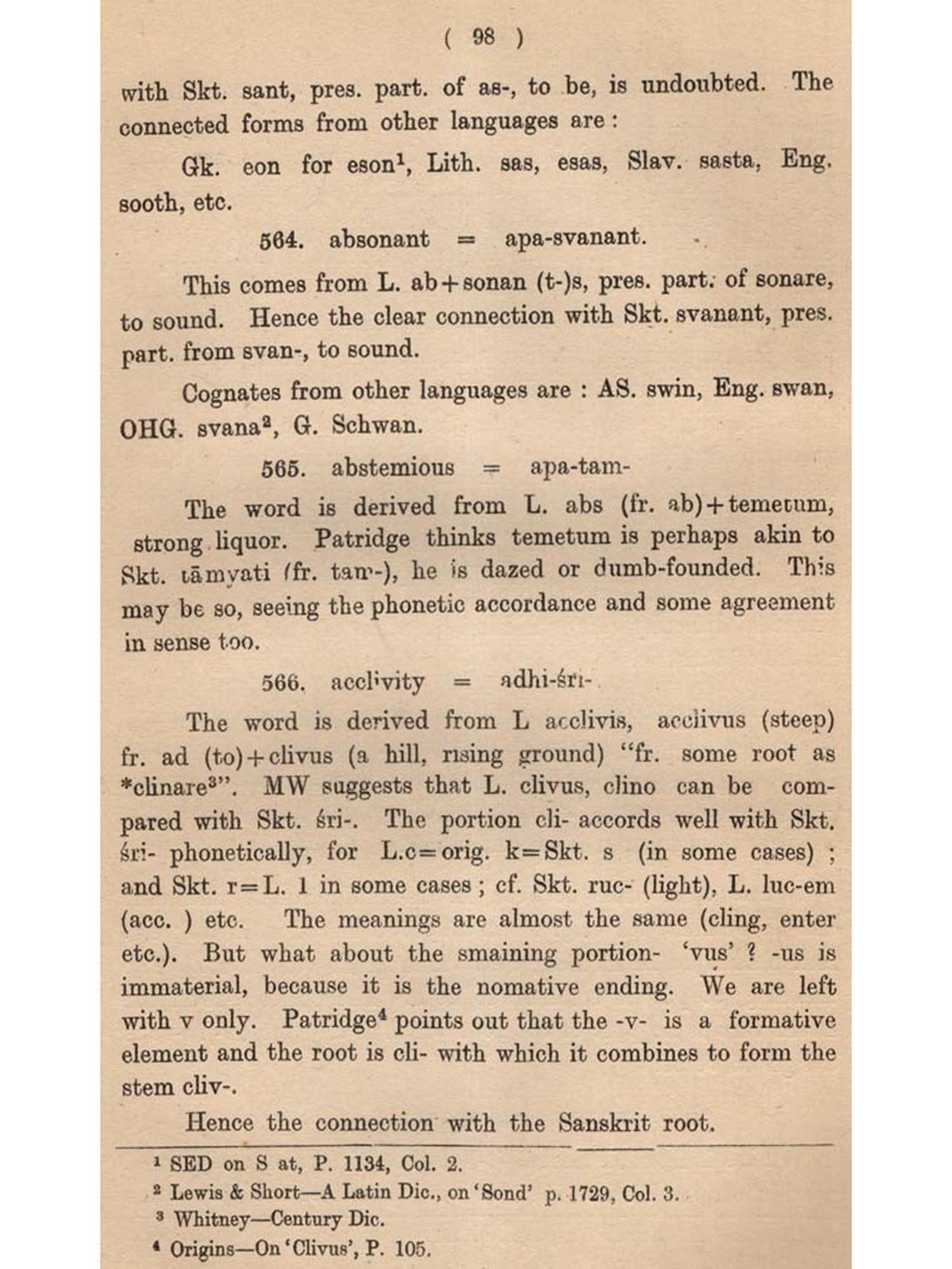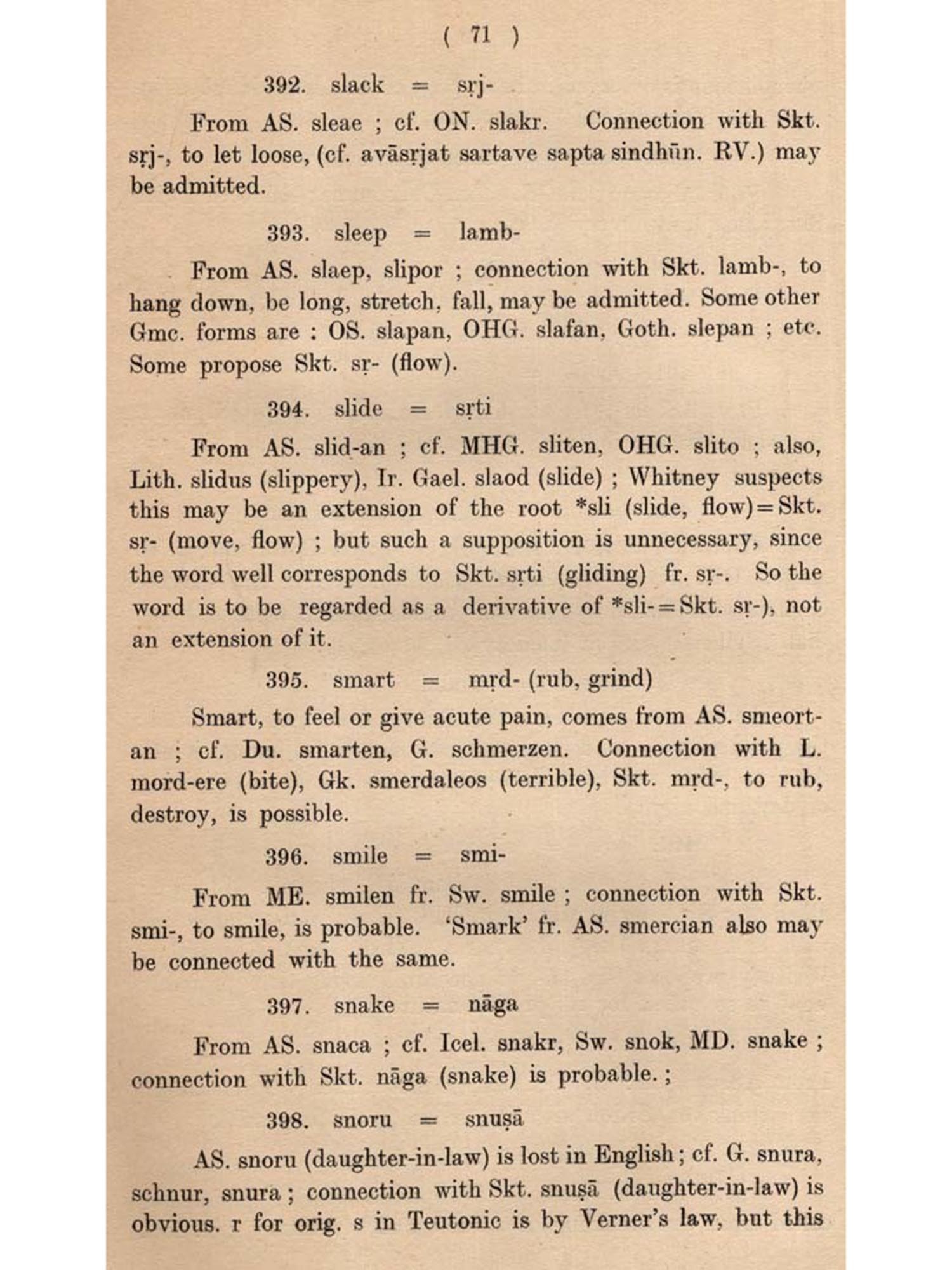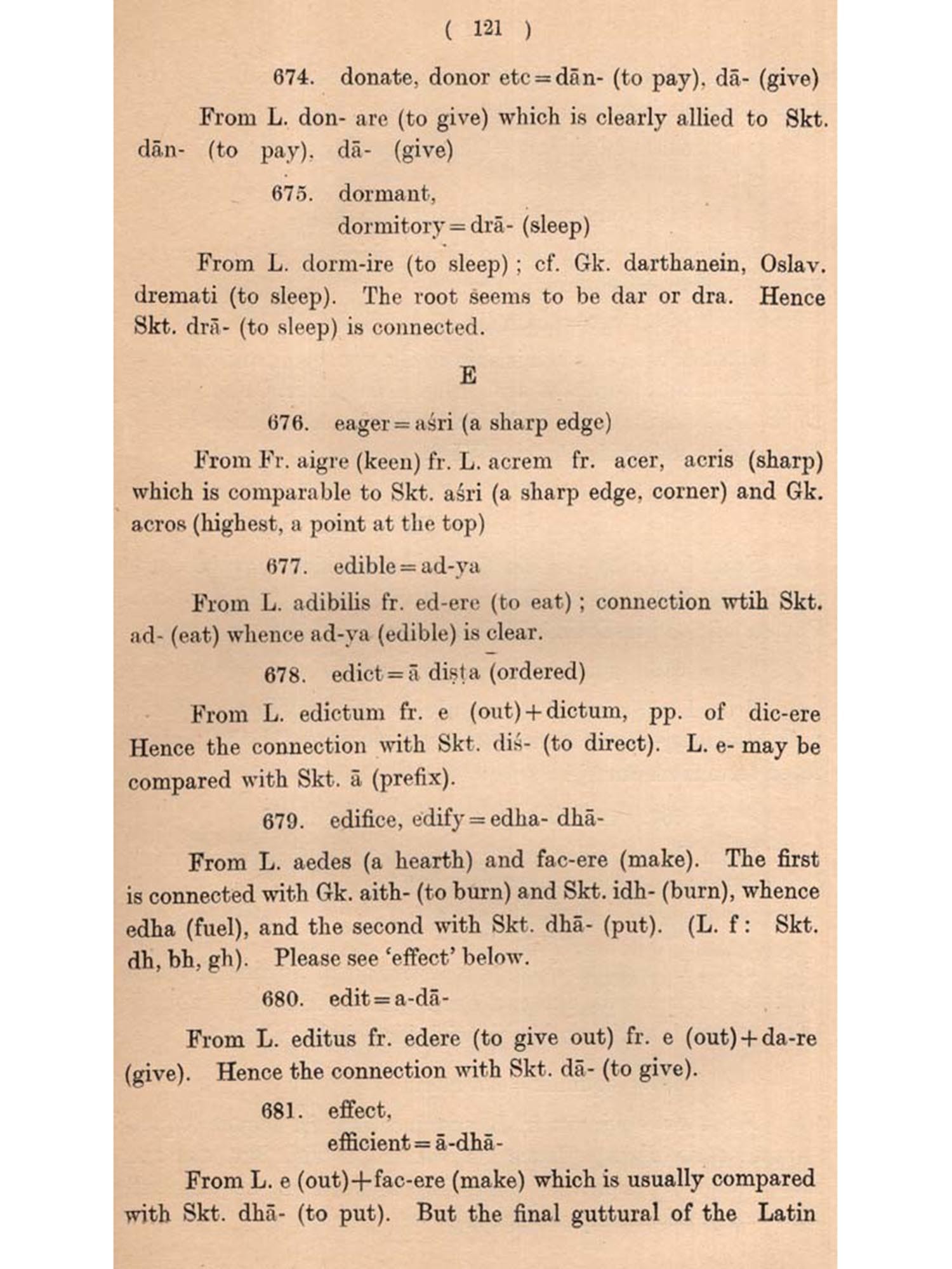The present undertaking is intended to fulfil this need, bringing to the fore all the English and Sanskrit words which are cognate (connected, related, allied, kindred, akin, parallel, comparable). Besides cognate words, cases of borrowing by each other or from a third source have also been noted as constituting another class of common vocabulary. Another object behind this compilation of English and Sanskrit cognates is to see whether such a collection has any bearing on the Science of language. As will be evident from the following pages, a number of such bearings have come to our notice. These mainly relate to some Phonetic Laws.