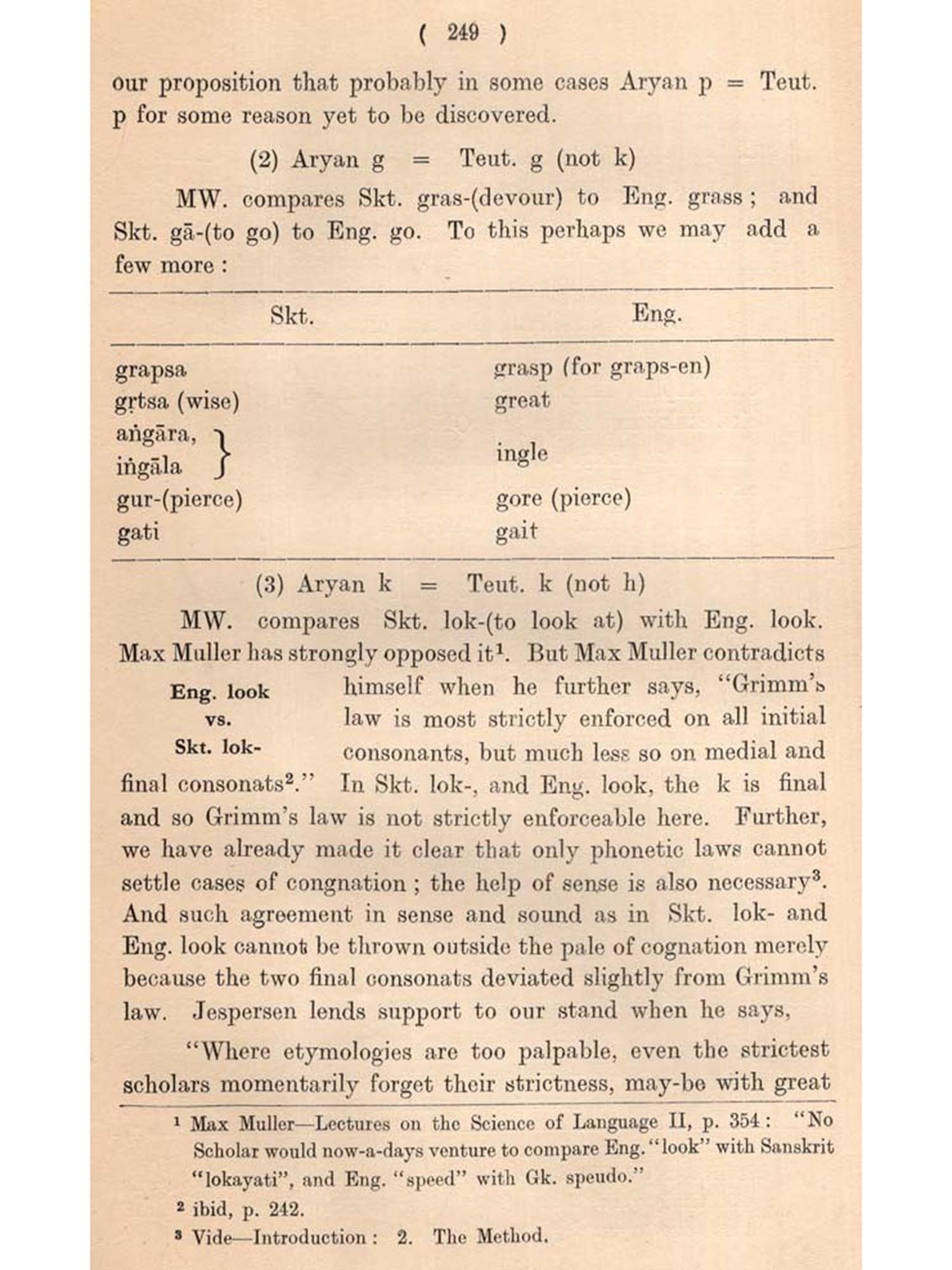 As is known to the student of language, Sanskrit, Greek, Latin, Teutonic (or Germanic), Slavonic etc. constitute the great Indo-European family of languages supposed to have been derived from a common parent tongue which is long extinct. Of these Teutonic is split up into a numer of languages of which English is one. Sanskrit and English are therefore sister or related langages, or languages of common origin. Hence common vocabulary between them is expected.