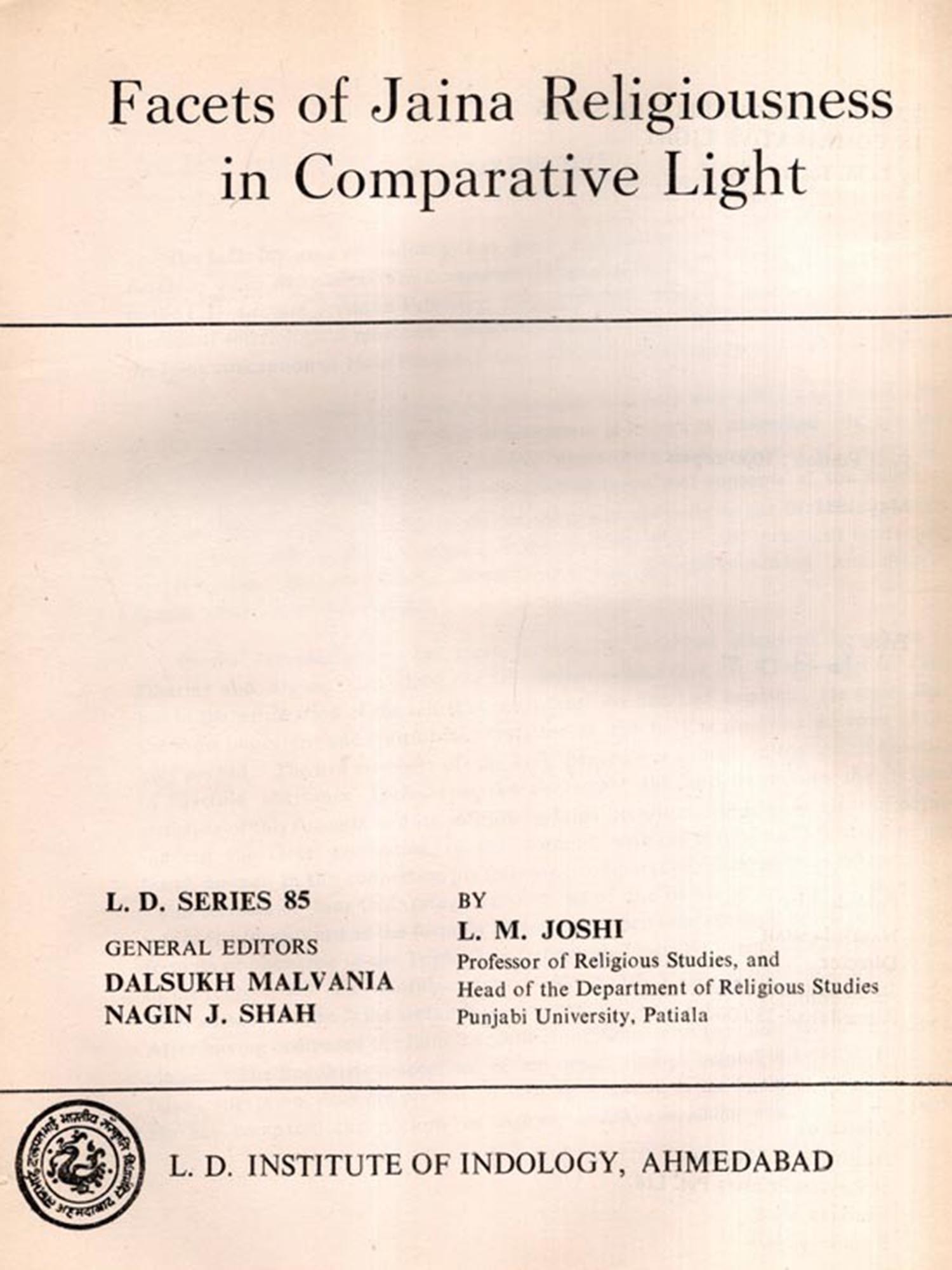 The L.D. Institute of Indology has great pleasure in publishing three lectures on Facets of Jaina Religiousness in Comparative Light, delivered by Prof. Dr L. M. Joshi in the L.D. Lecture Series in February, 1981. The first two lectures are devoted to themes of soteriological reflection (anupreksa) in Jainism. The third lecture expounds the Jaina conception of Holy Pentad-Arhats, Siddhas, Acaryas, Upadhyayas and Sadhus.