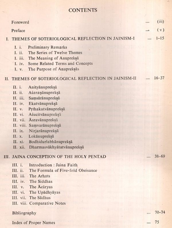 An attempt has been made in the first two chapters of this slender volume to discuss the meaning and function of twelve anupreksas. The third chapter seeks to elucidate philosophical, ethical and devotional aspects of the Jaina doctrine of the holy pentad (pancaparamesthin).