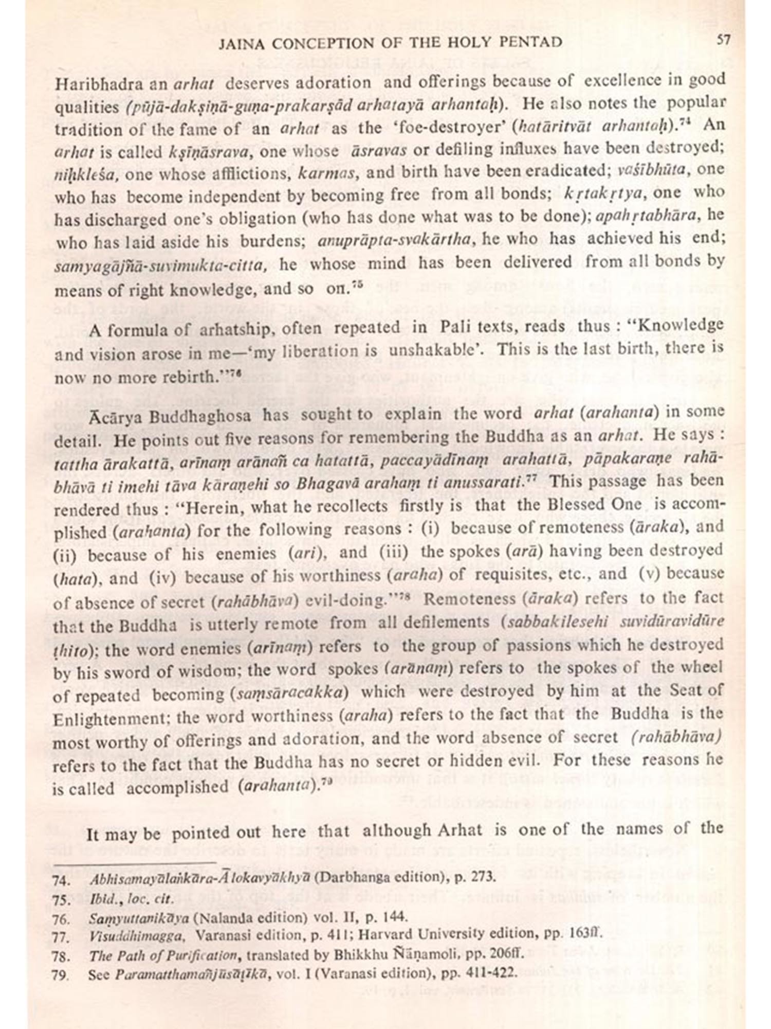In the Introduction to the third lecture, Dr. Joshi has discussed the essence of Dharma and argued that there can be Dharma without God. It is faith-not in God but in the purification of the self that constitutes the heart of Jainism. He states that the most important and fruitful manifestation of this faith is the Jaina doctrine of the holy pentad. The five members of the holy pentad are adored in the sacred formula of 'fivefold obeisance (panca-namaskara-mantra): the author reviews the textual structure of this formula and its position in Jaina literature. He is quite right in pointing out the close association of this formula with the formula of four-fold refuge (catuh-sarana). In this connection his following comparative observation is note-worthy. "This formula of four-fold refuge reminds us of the Buddhist formula of three-fold refuge (tri-sarana) just as the formula of five-fold obeisance reminds us of the Buddhist formula of obeisance to the Triple Gem (tri-ratna). In the Buddhist instance the number of the refuges and the adorable ones is the same; there are only three saranas and three ratnas. In the Jaina instance the saranas are four while the adorables are five." After having compared the Jaina conception of Arhat with the Buddhist one, he concludes: "The Buddhist conception of an arhat, though helpful in understanding the Jaina conception, does not present an exciting parallel to the figure of a tirthankara". He has compared the notions of acarya, upadhyaya, sadhu and guru found in the Buddhist, Jaina and Brahmanical traditions and clearly pointed out degrees of agreement and difference. Importance of the institution of guru in Tantric Buddhism, Natha school and Santamata is brought to our notice. Comparative Notes at the end of this lecture deserve special attention. His study of original Sanskrit, Pali and Prakrit texts has given freshness and lucidity to the interpretation and exposition of the old texts.