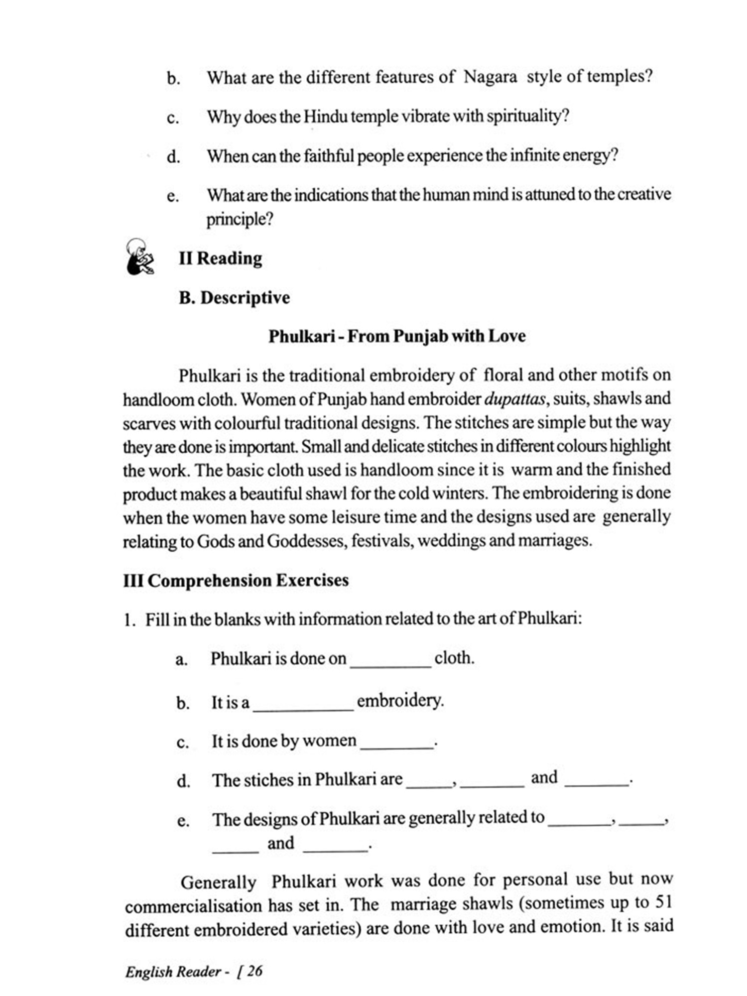 Uniformity has been maintained in all other aspects such as using authentic materials, pictures, colour-scheme, layout, etc. to encourage the students to participate actively in the language learning process. The introduction of grammatical items in context would help them in identifying the usage of language in real-life situations. Communicative activities would help them use language in real-life situations with peers, teachers and other at large.