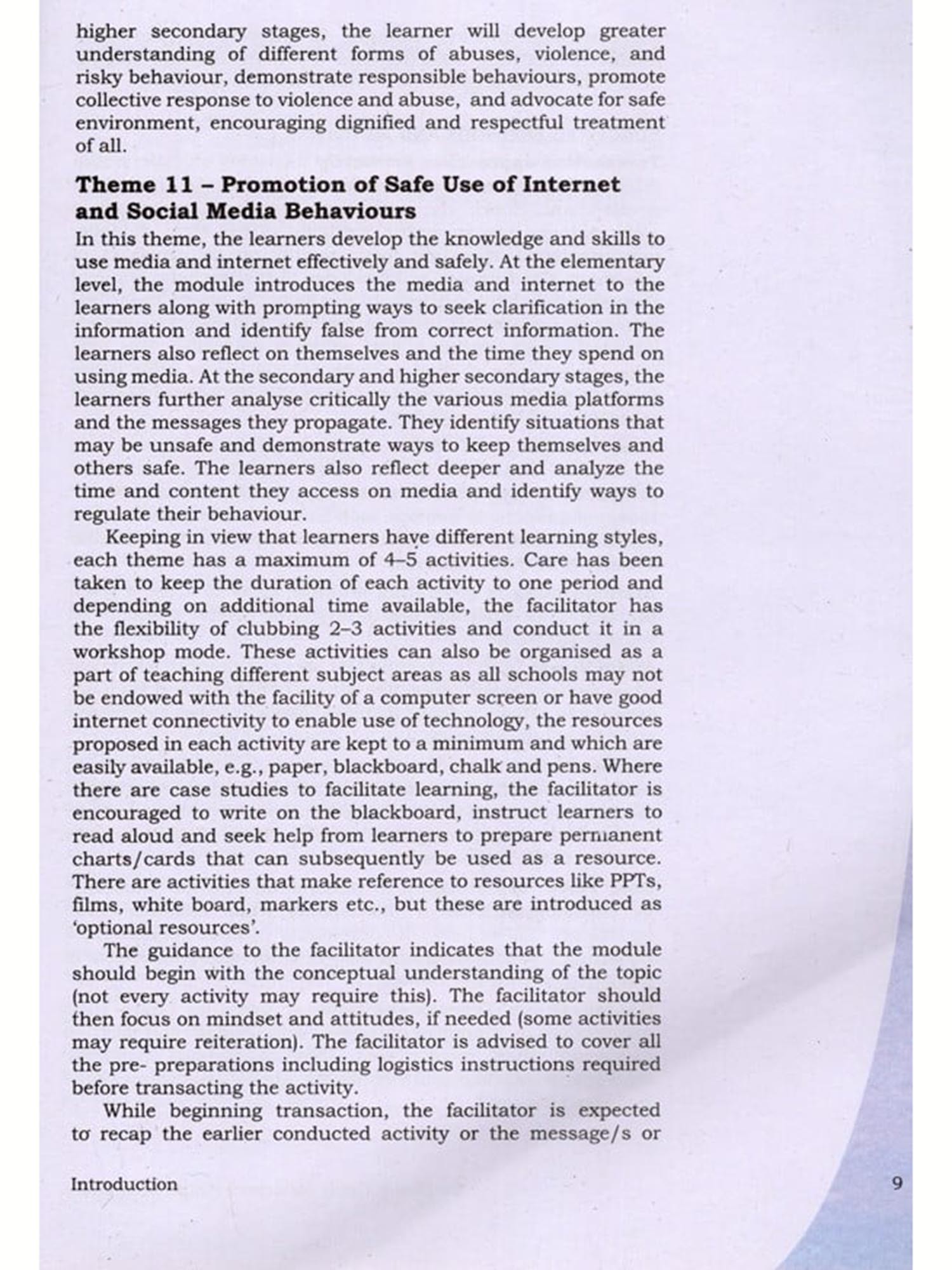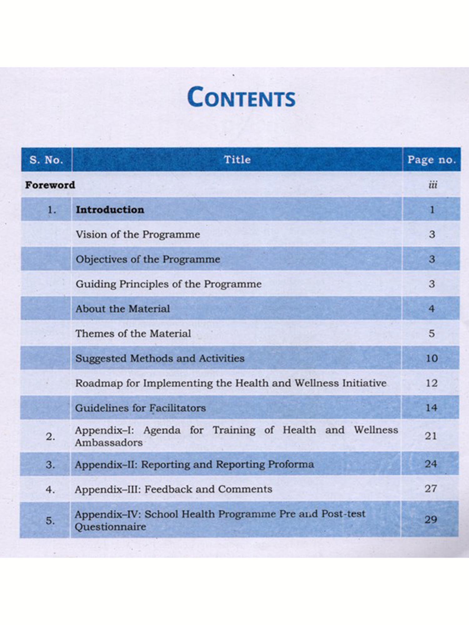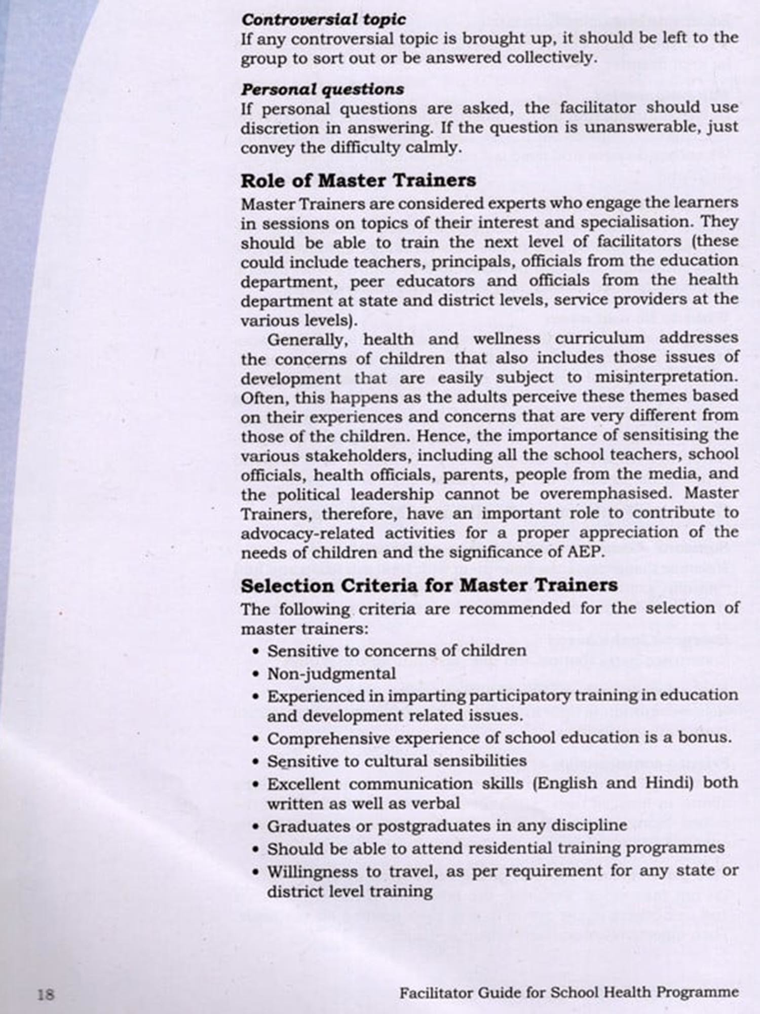 This Facilitator Guide includes the rationale, vision, objectives of School Health Programme. It also discusses in brief the eleven themes covered in the Training and Resource Materials, suggested methods and activities to facilitate the transaction of life skills based education by the teachers to children of upper primary to secondary stage using interaction methodology in schools. Road map for the implementation of this programme, role of various stakeholders, agenda for training of teachers and feedback in terms of pre and post test are also part of this Guide.