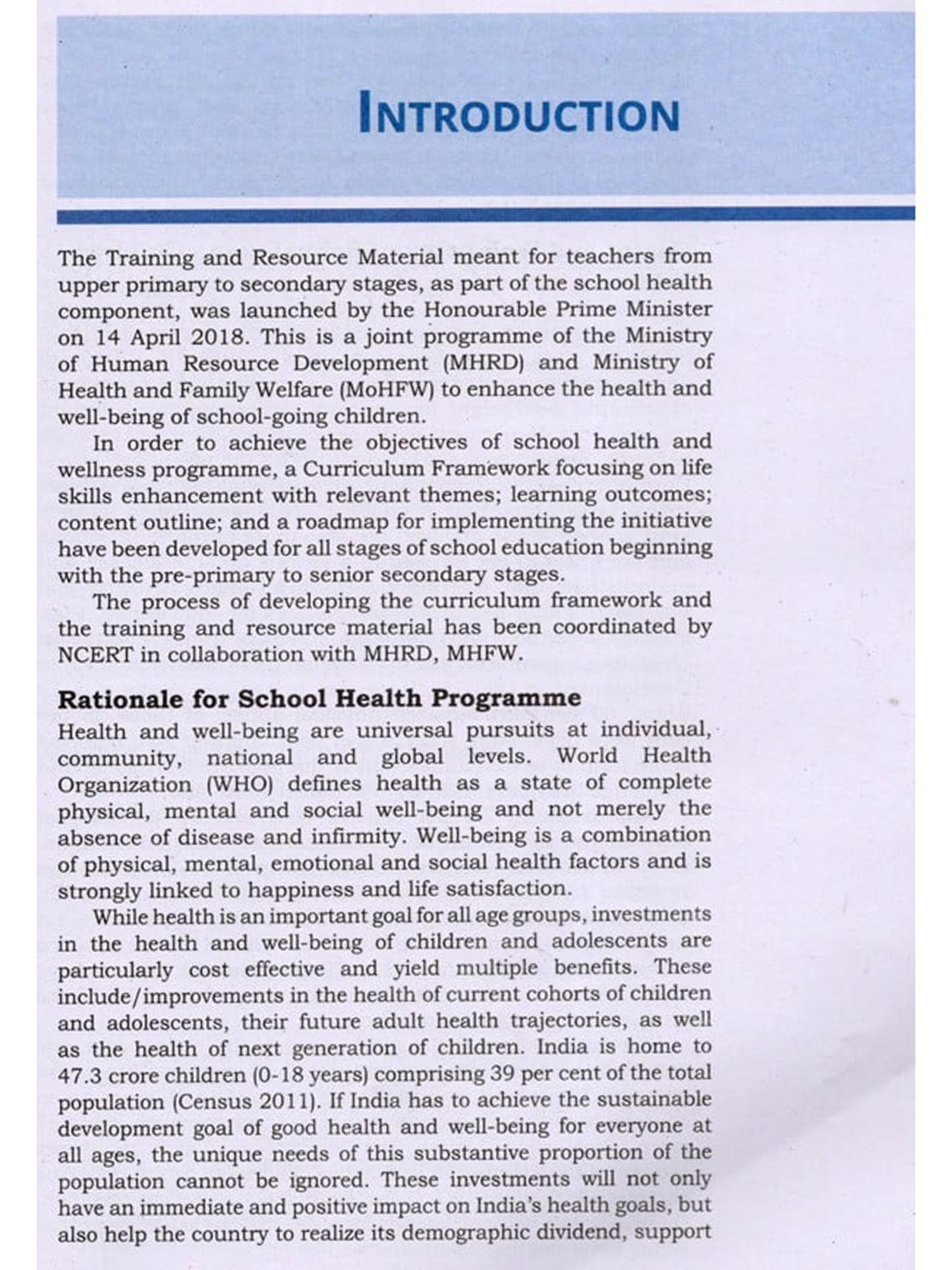 The Ministry of Human Resource and Development and Ministry of Health and Family Welfare has assigned National Council of Educational Research and Training (NCERT) the task to prepare curriculum and training material and facilitator guide related to health and wellness of school going children as a part of the Ayushman Bharat, which is a flagship programme of the Government of India.