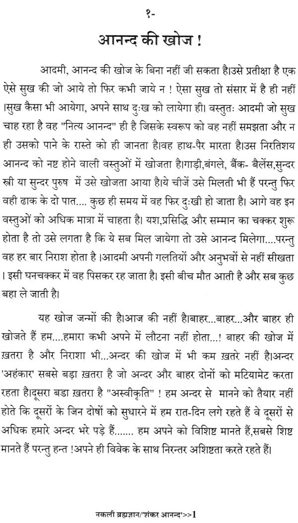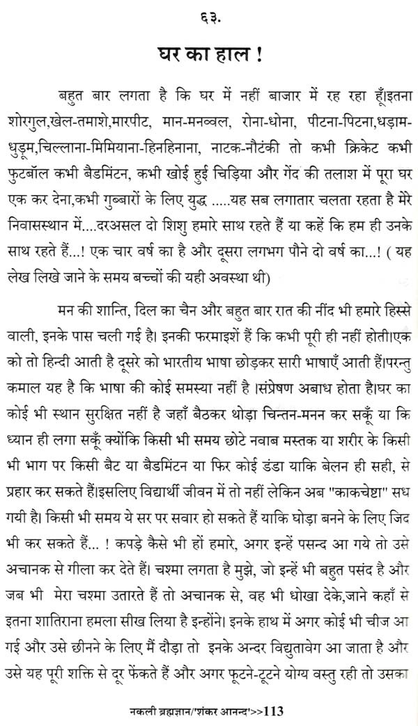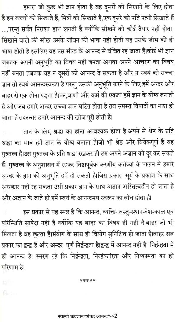 'नकली ब्रह्मज्ञान', पिछले बारह-तेरह सालों के दरमियान फेसबुक पर लिखे गये छोटे-छोटे लेखों का संग्रह है। अन्दर या बाहर जब जो घटता था उसे कभी-कभी फेसबुक पर भी लिख देता था हलाँकि यह हमेशा नहीं ही होता था। अभी कुछ दिन पूर्व यह विचार आया कि क्यों न इसे पुस्तकाकार कर दिया जाये.... विचार साकार हुआ और पुस्तक आपके हाथ में है।समय विचार परिवर्तित और परिवर्धित भी होते रहते हैं। चूँकि पुस्तक में पूर्व के विचार संकलित हैं अतः यह अवश्यंभावी है कि आज के समय में लेखक के कुछ विचारों में आंशिक परिवर्तन भी हो सकता है, यह एक स्वाभाविक स्थिति है। पुस्तक में संकलित सभी लेख एक दूसरे से सम्बन्धित न होकर बल्कि पूर्ण स्वतंत्र हैं। लेखों का कलेवर कोई छोटा तो कोई बड़ा हो गया है, इसके पीछे तात्कालिक चिंतन कारण है। जब जो बात कही गयी पूरी कही गयी, कभी आवश्यकतानुसार शब्द अधिक हो गये तो कभी कम शब्दों में बात में बात पूरी हो गयी। पाठक किसी भी लेख से पढ़ने की शुरुआत कर सकते हैं; लेखों का कोई क्रमविशेष स्थापित नहीं किया गया।