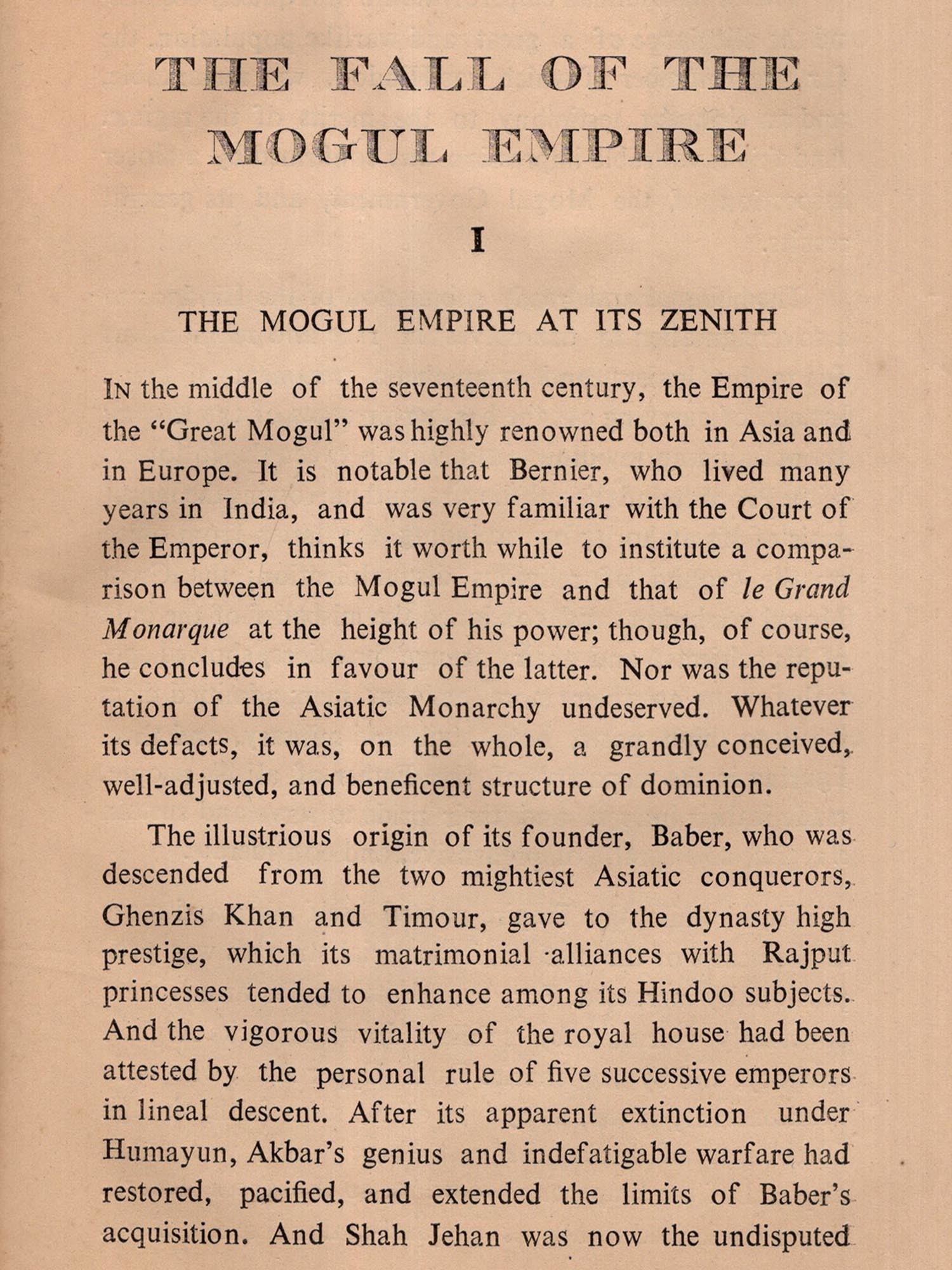A common impression is, that, as is so often the case in the East, the decline and fall of the Mogul Empire were due to the degeneracy of its Sovereigns. But it is the object of this book to show that it was irretrievably ruined in the reign of Aurungzib, a monarch of great ability, energy, and determination, but lacking in political insight, and a bigoted Mussulman.