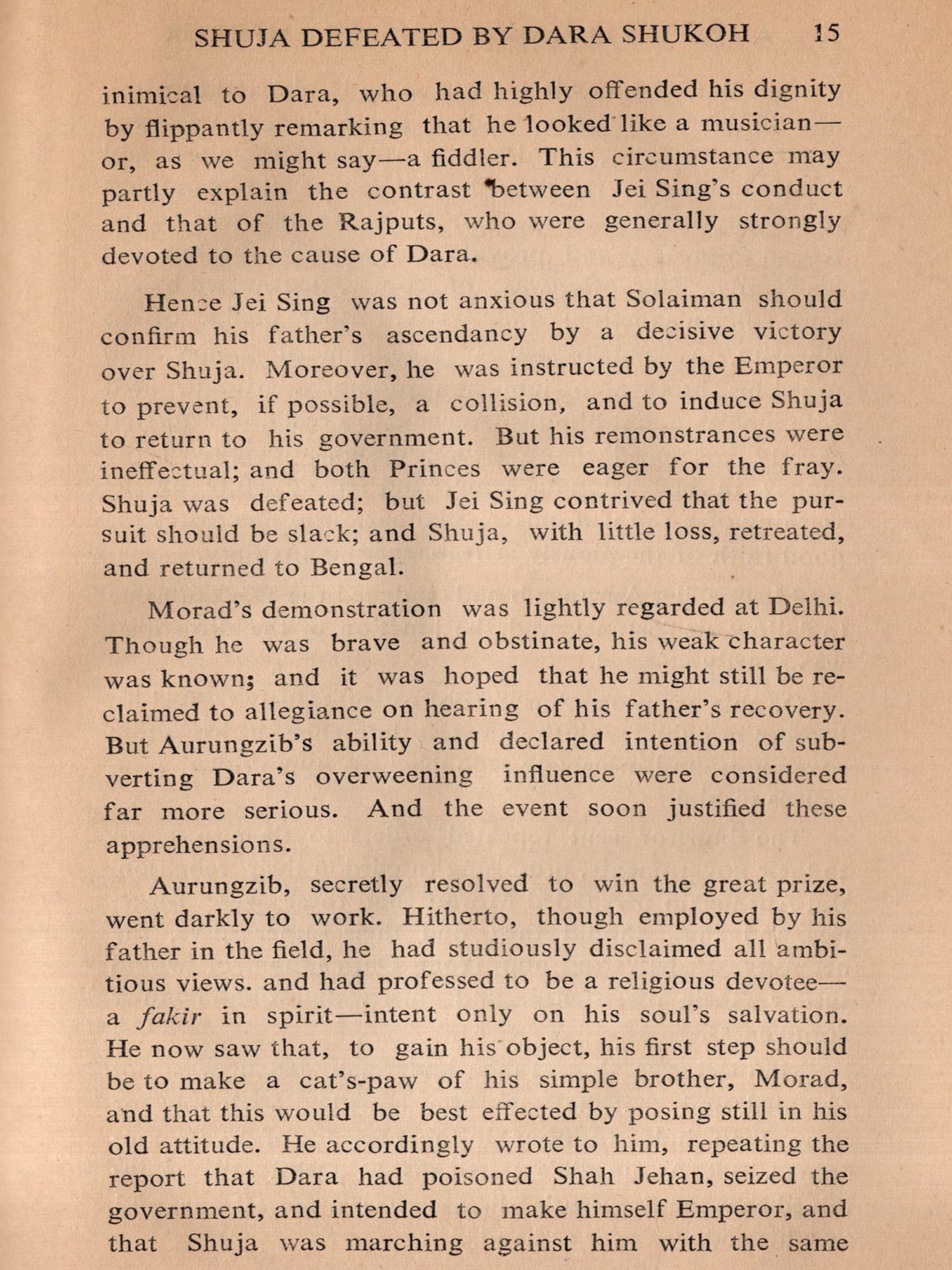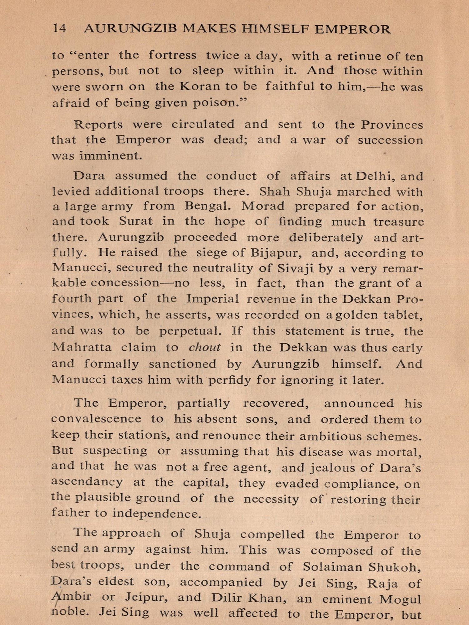For the neferious process by which Aurungzib cleared his way to the throne I have followed Manucci, a Venetian in Dara's service, whose Storia do Mogor has been lately translated and edited by Mr. William Irvine.