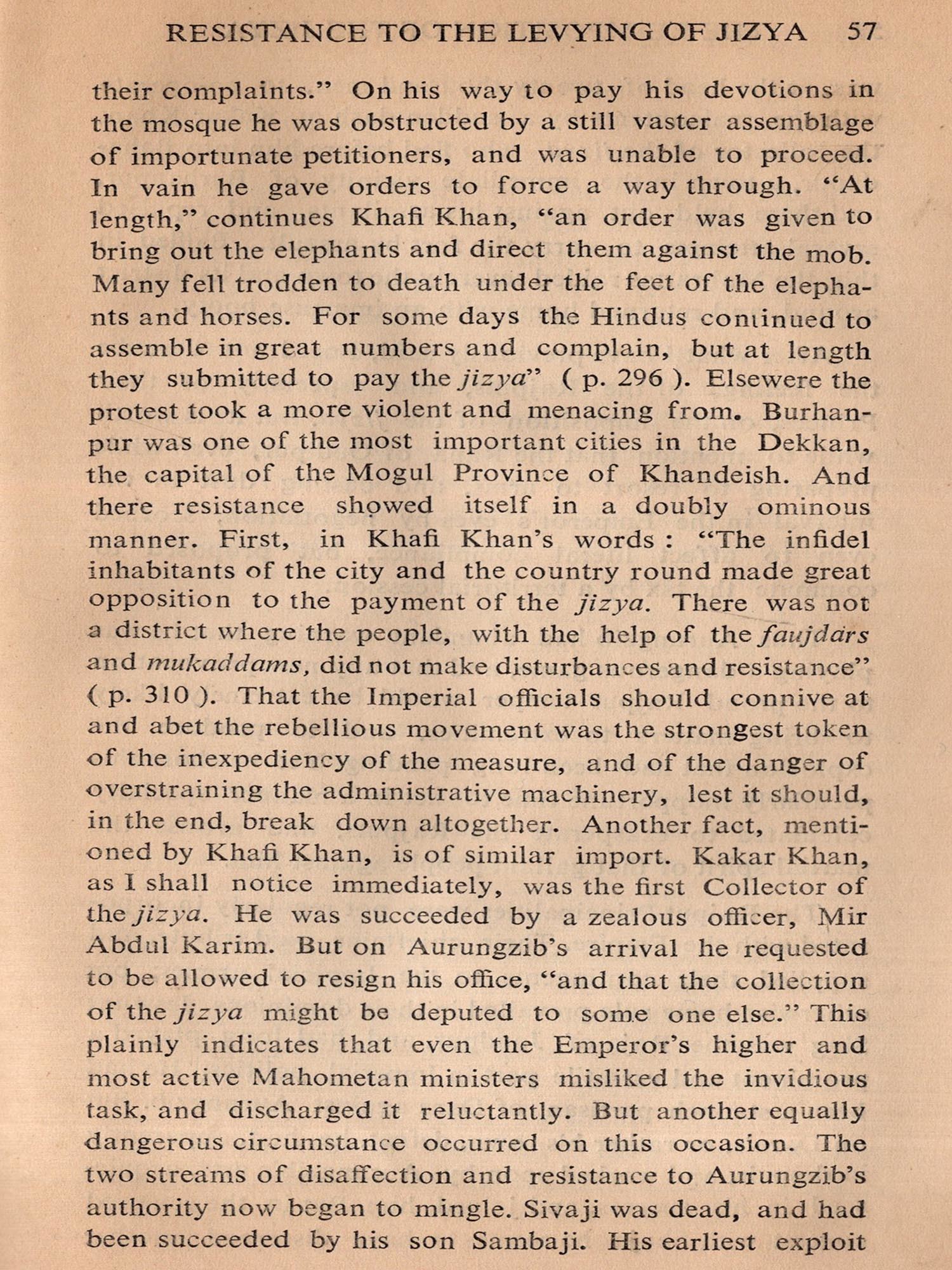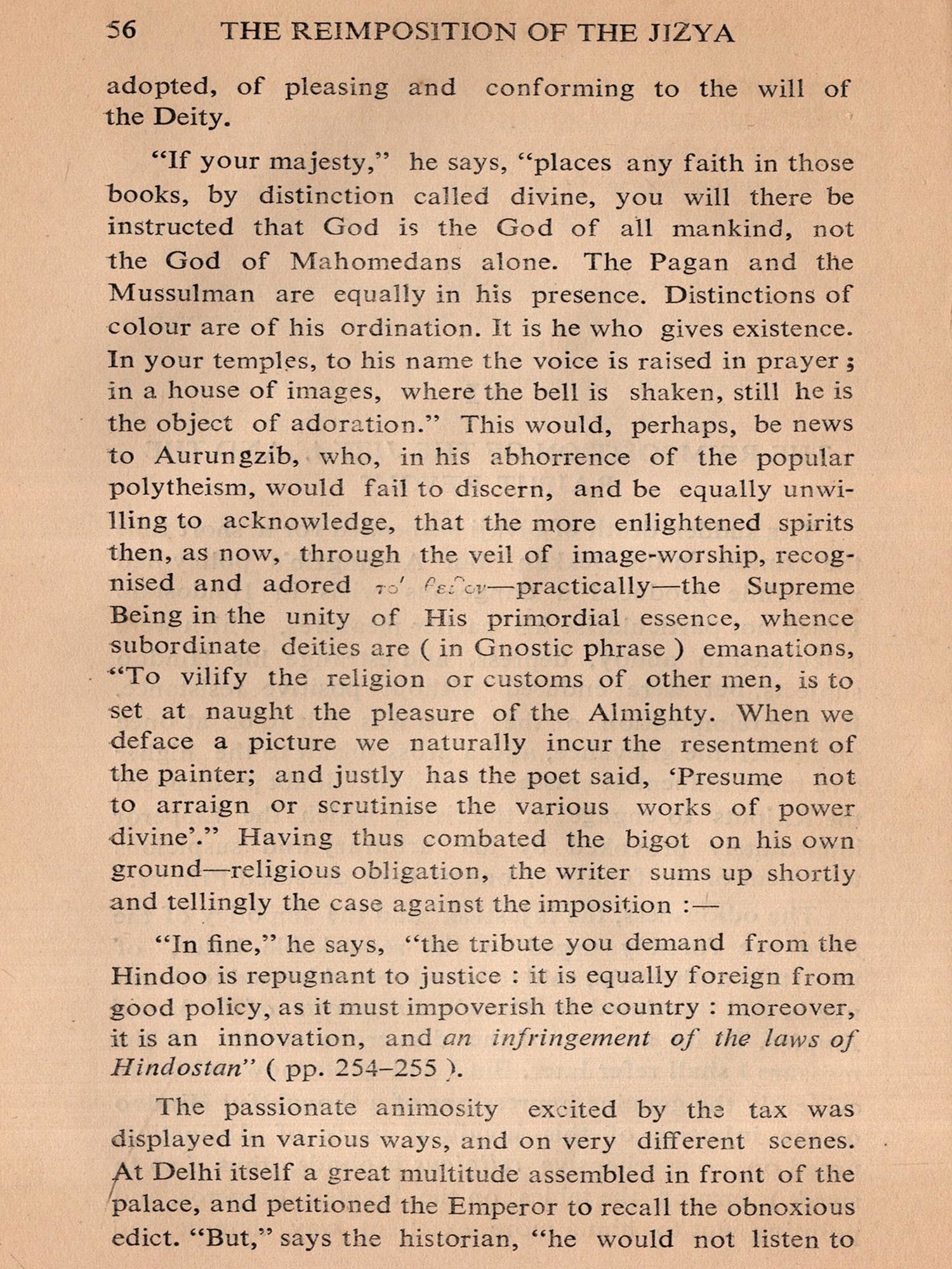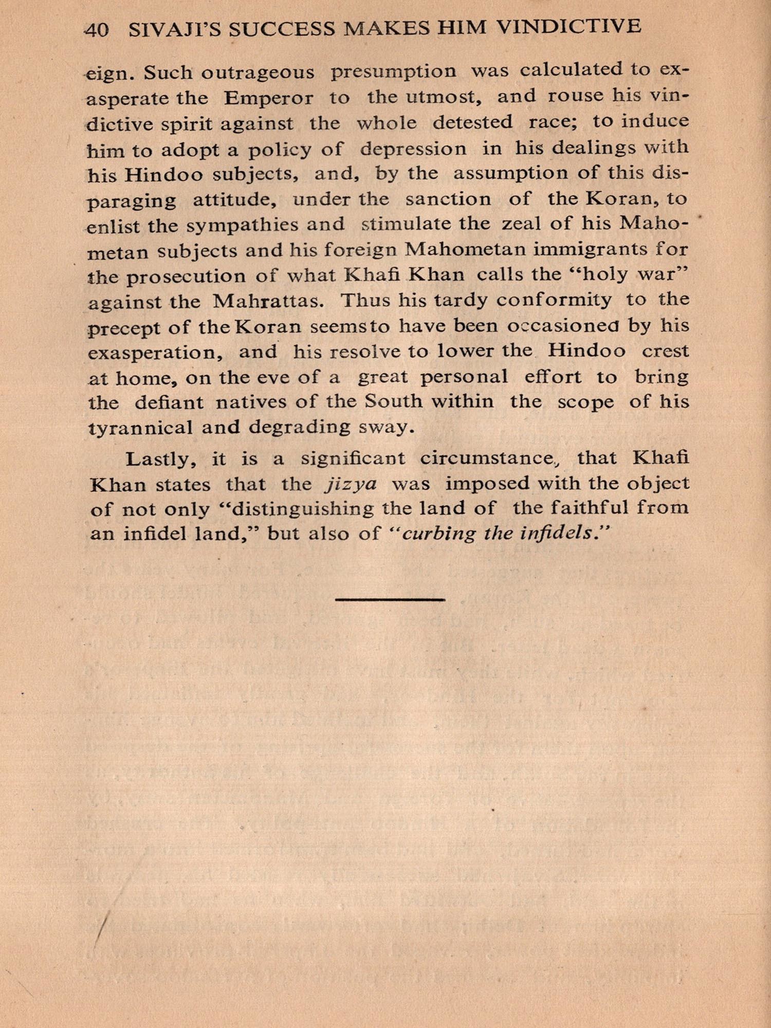 He struck the first mortal blow by reversing Akbar's wise and generous policy of ignoring distinctions of race and religion, and reimposing the jizya, or poll-tax, on his Hindoo subjects; whereby he estranged them, and turned the noblest and most warlike of them-the Rajputs, hitherto the staunchest supporters of the throne-into deadly and persistent enemies.