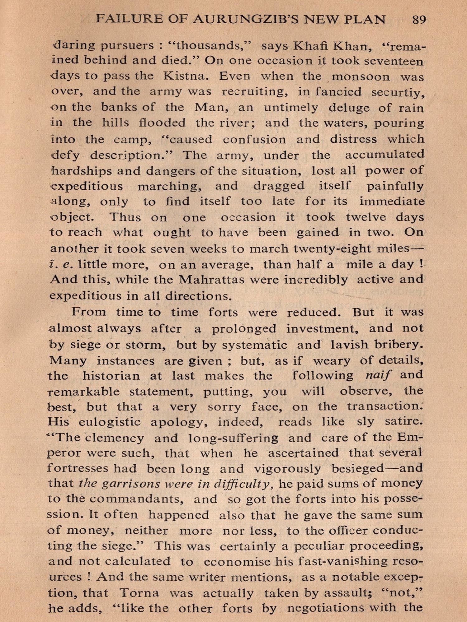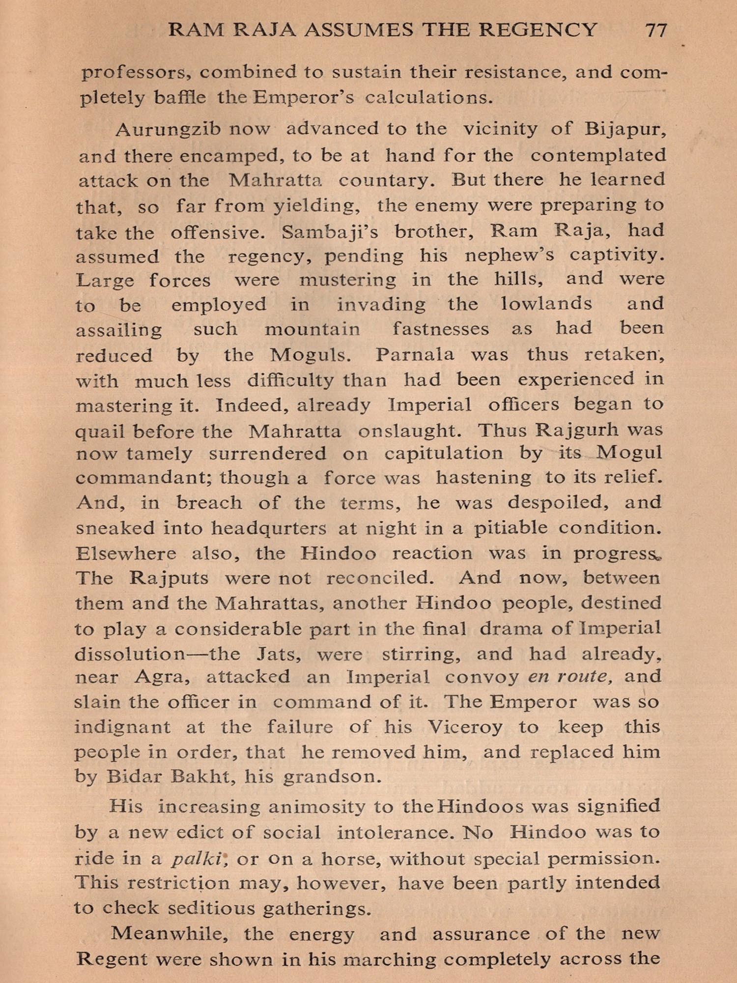 The account of the reigns of Aurungzib and his successors, to the final settlement of Nizam-ul-Mulk in the Dekkan, has been taken from the standard history, of Khafi Khan, translated by Professor Dowson, and inserted in the 7th volume of The History of India from its own Historians. This author served under Aurungzib in the Dekkan.