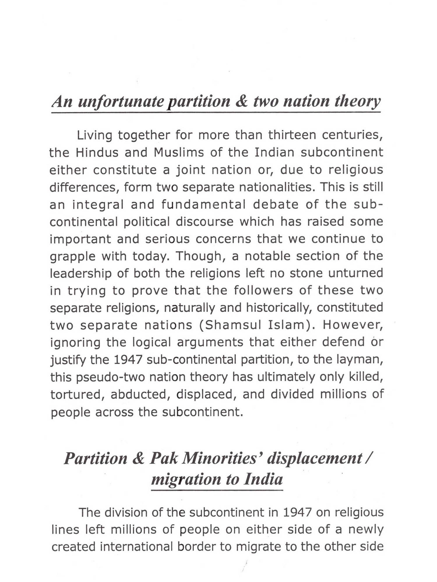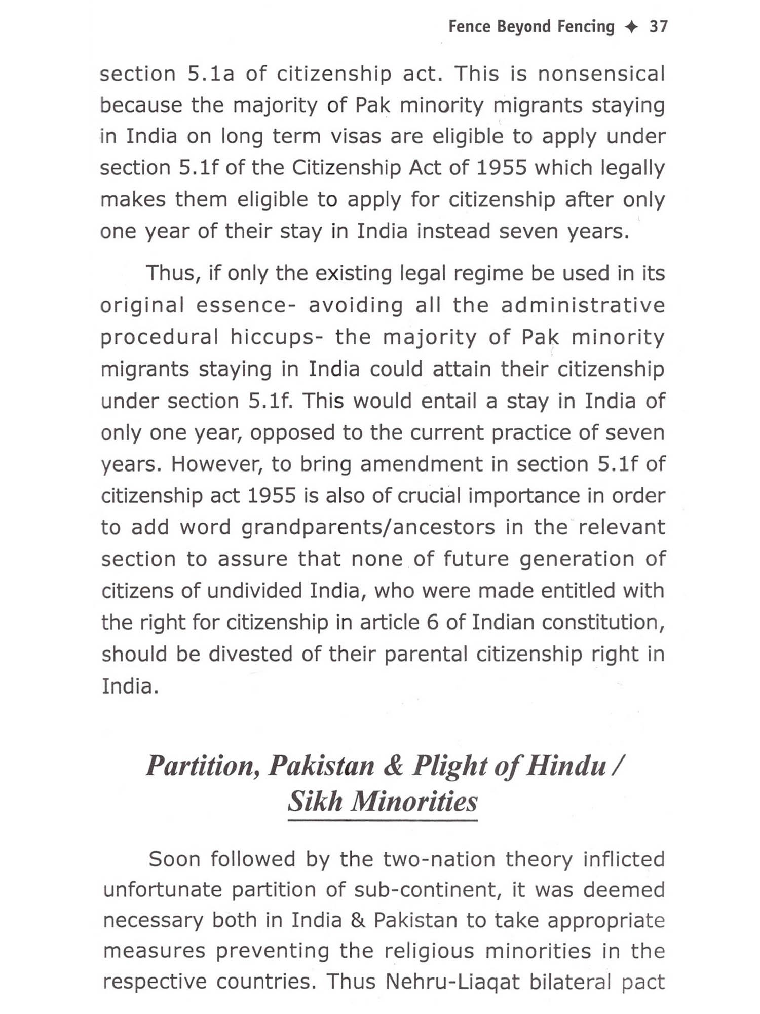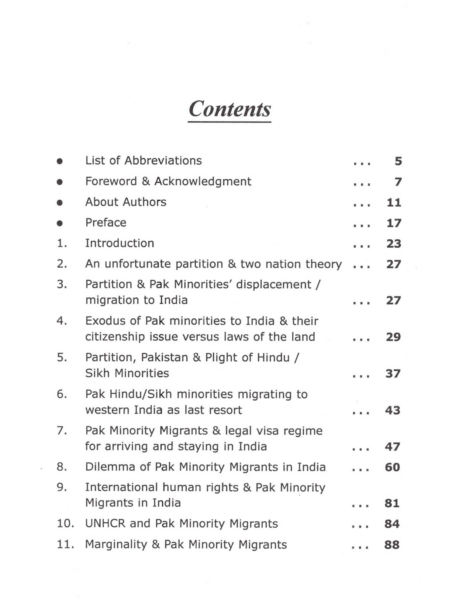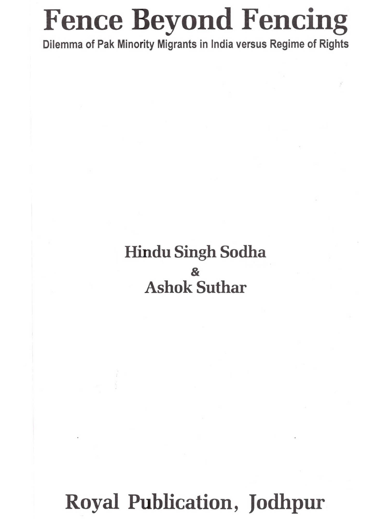 I began working as a human rights activist in the late nineties, fighting for pre and post citizenship rights for the Pak migrants badly suffering in India. With the passage of time, our efforts have translated into a movement which has garnered much attention in the local media. Despite the work I have done thus far, taking into account the extreme scarcity of human and economic resources, the cause has been largely ignored by both national and international authorities. Amid the prolonged and relentless struggle, I sometimes feel despair observing the uncooperative and often ignorant attitudes of important officials who should have otherwise addressed this crucial human rights issue of Pak migrants in India. Nevertheless, the setup of SLS/UJAS as the leading representative of the refugee community continuously inspires me and lets me hope that we will emerge as a major player in political discourse on this topic. First of all I must congratulate and thank Ashok Suthar for coauthoring this book and paving the way to render the organized work for migrants. I also extend my hearty blessings to him for being the foremost in the line of newly coming young and educated migrants to serve in this noble cause. I must also acknowledge and be ever indebted to all of those whose researched or published work we either referred to or used in this book. I pay gratitude to Prof. (Dr.) Satay Narayan as well for taking out his time to write a preface of the book. I must thank Divya Sharma too, for writing in about author section of the book. Furthermore, I am obliged to Monica Gillis, who is currently engaged with UJAS for her academic assignment, for reviewing and editing the language of the book. And last but not least, I must acknowledge the many individuals without whose contribution this book would have not been compiled and published. I hope that this book will serve as a reader-guide for all of the national and international authorities mandated to bring lasting solutions to the lives of anguished Pak migrants in India. Minorities in Pakistan are neither safe as nationals in Pakistan nor as migrants in India. India is not a signatory to the 1951 Convention relating to the Status of Refugees and therefore does not have a uniform national policy ational policy to protect refugees. Due to very strained Indo-Pak relations, it is difficult for religious minority groups of Pakistan to secure a safe passage to India to get refuge, asylum, or citizenship. Currently, no voice is being raised at the international level about the ethnic cleansing, oppression, and human rights violations of these groups neither in Pakistan nor in India, their country of asylum. In India these migrants have to wait at least seven years in order to be eligible for citizenship, during which they have to stay on visas. In the meanwhile, the migrants from Pakistan cannot: leave the city their visa is registered in, easily enroll their children in schools, access healthcare facilities, purchase SIM cards for their phones, rent or buy a home or shelter, access home utilities, obtain a driver's license, open bank accounts, set up businesses in their name, etc. They face harassment and exploitation until they receive citizenship, demonstrating India's indirect denial to receive, rescue, and rehabilitate this marginalized minority group coming from Pakistan. Sadly, no other institution working on human rights issues has come forward to address the concerns of this neglected group of migrants. In fact, UJAS is the only formal forum in India that exists to highlight the plight of these disenfranchised people. Hindu Singh Sodha should be praised on establishing SLS/UJAS which has endeavored to lead the migrants' movement and raise a voice for the rights of these migrants in India. However, Hindu Singhji believes that the addition of recent migrant Ashok Suthar a young development professional-to his team at a very crucial time adds to the future worth of his virtuous goal. Hindu Singh Sodha and Ashok Suthar created this book in the hopes that it will draw attention to the constantly overlooked issue of Pak migrants in India. The book strives to present the dilemma of Pak minority migrants in India versus 'Regime of Rights'. It is a desk review of relevant legal frameworks, mainly legislation, policies, and practices associated with Pak refugees in India. The book as a whole envisages discouraging the discouragement policy of Indian governmental authorities to welcomingly receive the persecuted Pak migrants in India. It also aims to establish migrant-friendly public perceptions and convince national and international authorities on the prevalence of the human rights violations of these religious minority groups in Pakistan and India. Hopefully, this book will persuade concerned officials in India to devise an effective roadmap that will permanently solve the issues regarding pre and post citizenship rights of Pak minority migrants in India.