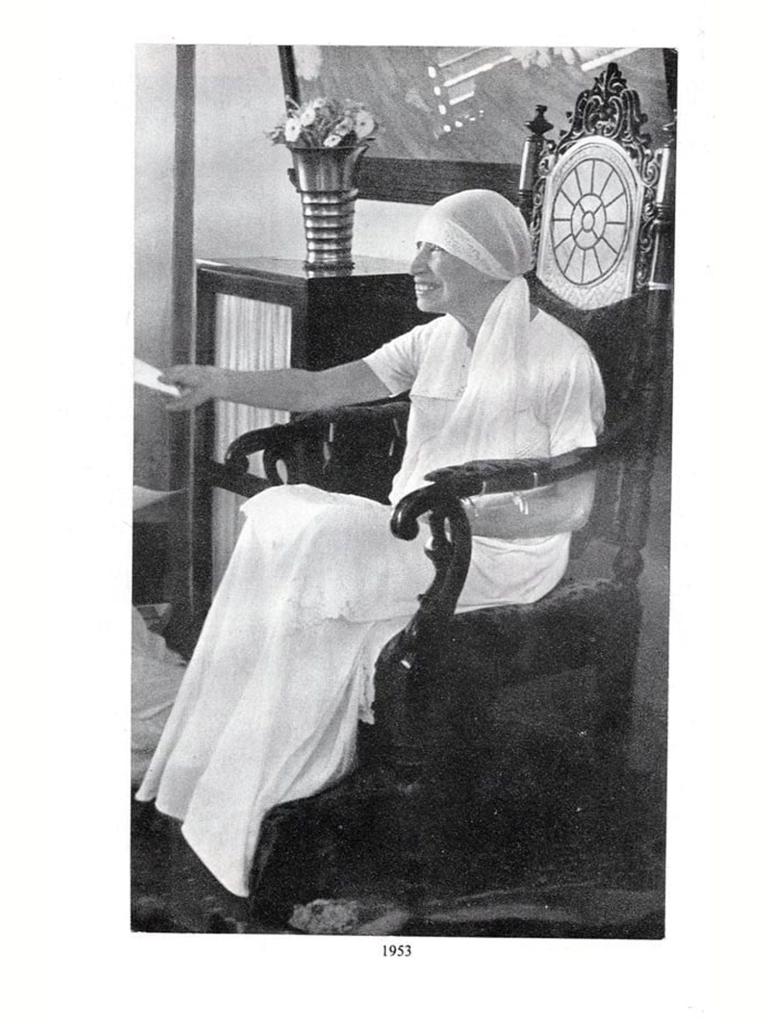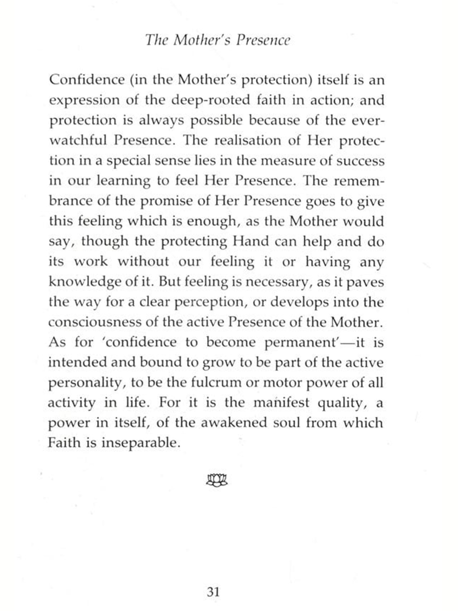 He was conscious, every minute, of the rare fortune of living at this moment the like of which comes hardly once in a thousand years in the history of the earth. For he experienced and knew that the Mother is not simply a spiritual personality, a Saint; neither a Yogin who has arrived at the summits of spiritual realisation. She is not even an Avatar of the traditional conception, a Power or Part of the Divine incarnated in human form. He saw and recognised in Her a conscious embodiment of the whole Divine, a living Murti in whom are present all the Four Personalities of the Adya sakti spoken of by Sri Aurobindo as presiding over the course of the Earth's Evolution. He invoked in Her Person Maheshvari, Mahakali, Mahalakshmi, Mahasaraswati and got their response in an unmistakable manner. In Her he adored his Ista Devata, Sri Lalita Tripura Sundari, and surrendered his entire Sadhana to Her. Times without number he let me feel and get an inkling into the working of the Mother's Love, Force and Grace in his inner and outer life. Once he confided to me, with deep emotion: