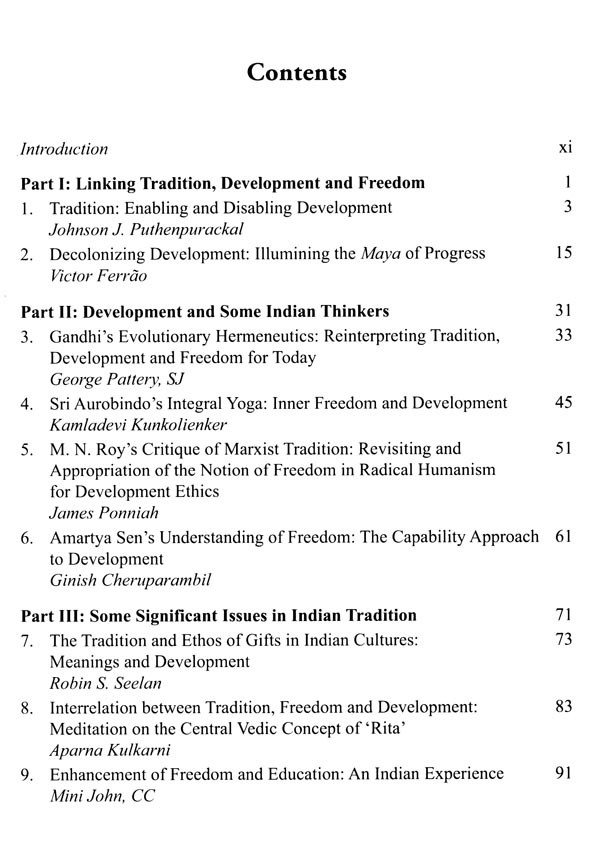 The articles in this volume are contextual, hermeneutical and philosophical. Since they are contextual, we deal with the issues mainly from Indian perspectives. So the articles are necessarily multi-disciplinary. It takes into account the cultural and religious diversity and ambiguities of contemporary India. It is also hermeneutical, since most of the articles attempt at appropriating the perennial wisdom of India for the current situation. These articles are philosophical, since they analyse, critique the situation of tradition, freedom and development. These articles reflect on the depth of tradition that India is proud of, the vigour and vitality of its democratic spirit and the longing for its integrated and holistic development. It is hoped that these articles will contribute to the ongoing discourse on modernity, development, tradition and freedom prevalent in the academic circles in India.