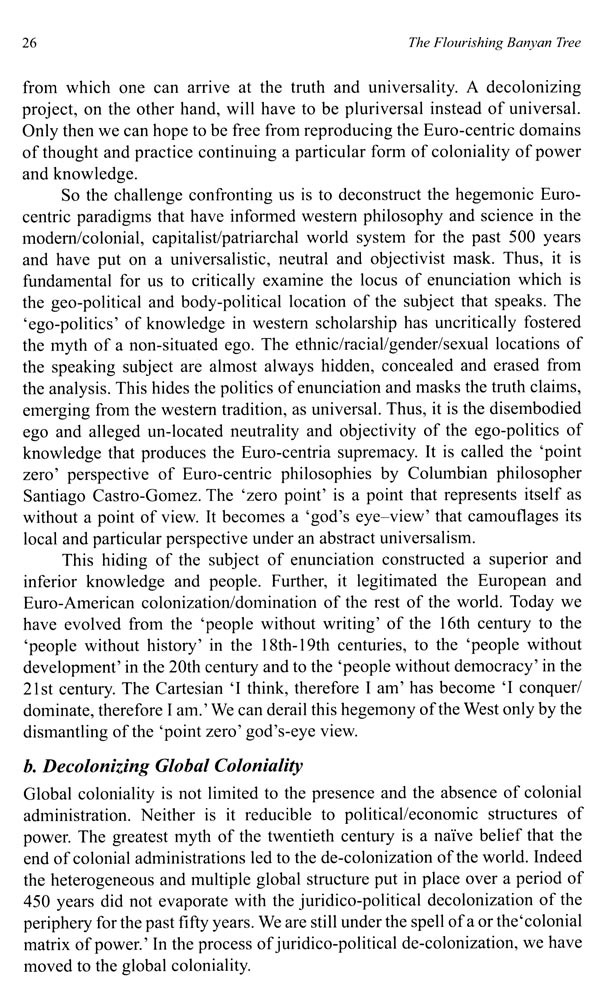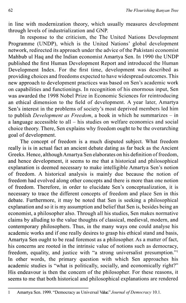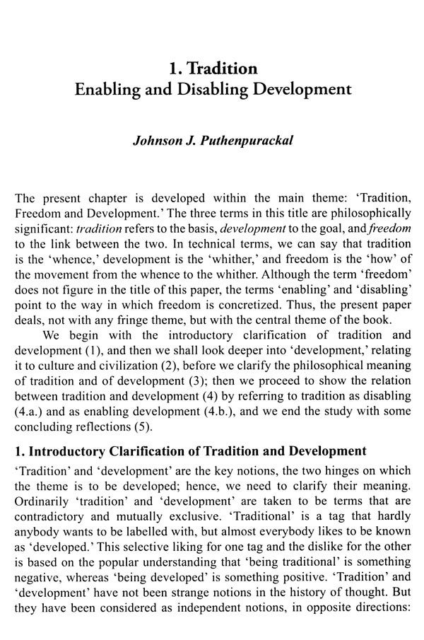The articles in this volume are contextual, hermeneutical and philosophical. Since they are contextual, they deal with the issues mainly from Indian perspectives. So the articles are necessarily multi-disciplinary. They take into account the cultural and religious diversity and ambiguities of contemporary India. As hermeneutical, most of the articles attempt to appropriate the perennial wisdom of India, interpret them and make them relevant for the contemporary situation. Finally, these articles are also philosophical, since they analyse, critique and enhance the rich and related notions of tradition, freedom and development. The authors hope to offer alternative or deeper and enriching ways of looking at the phenomena of freedom, tradition and development.