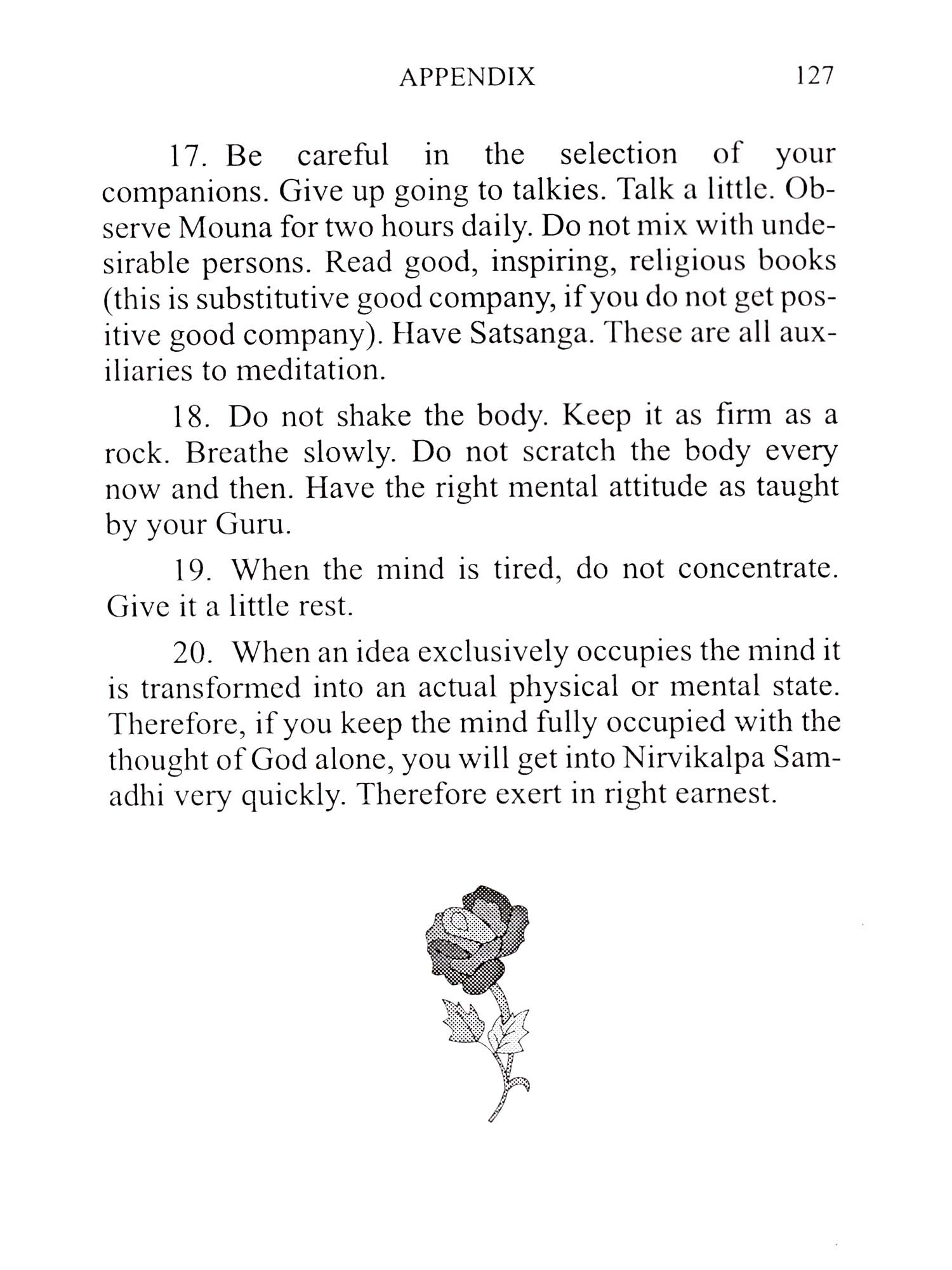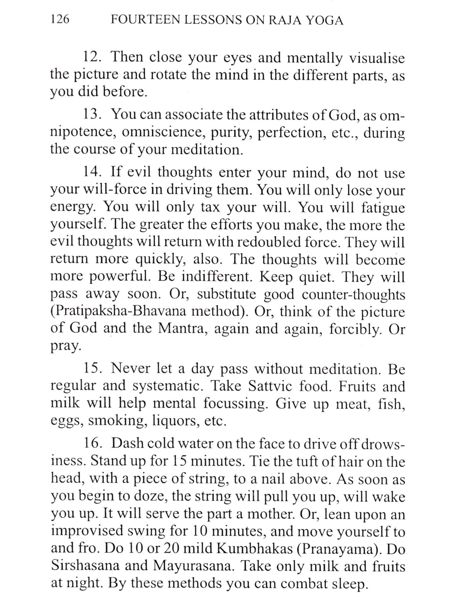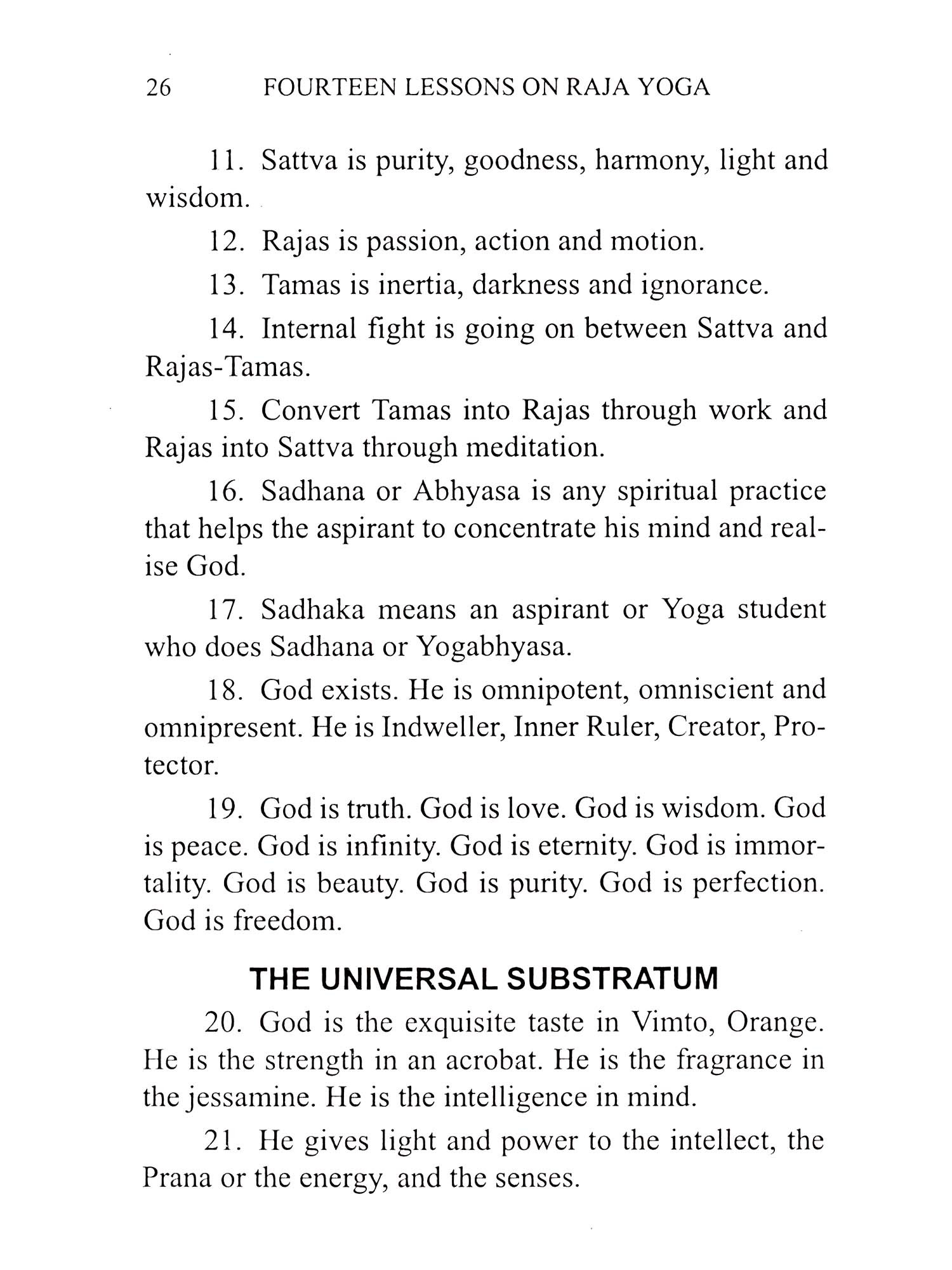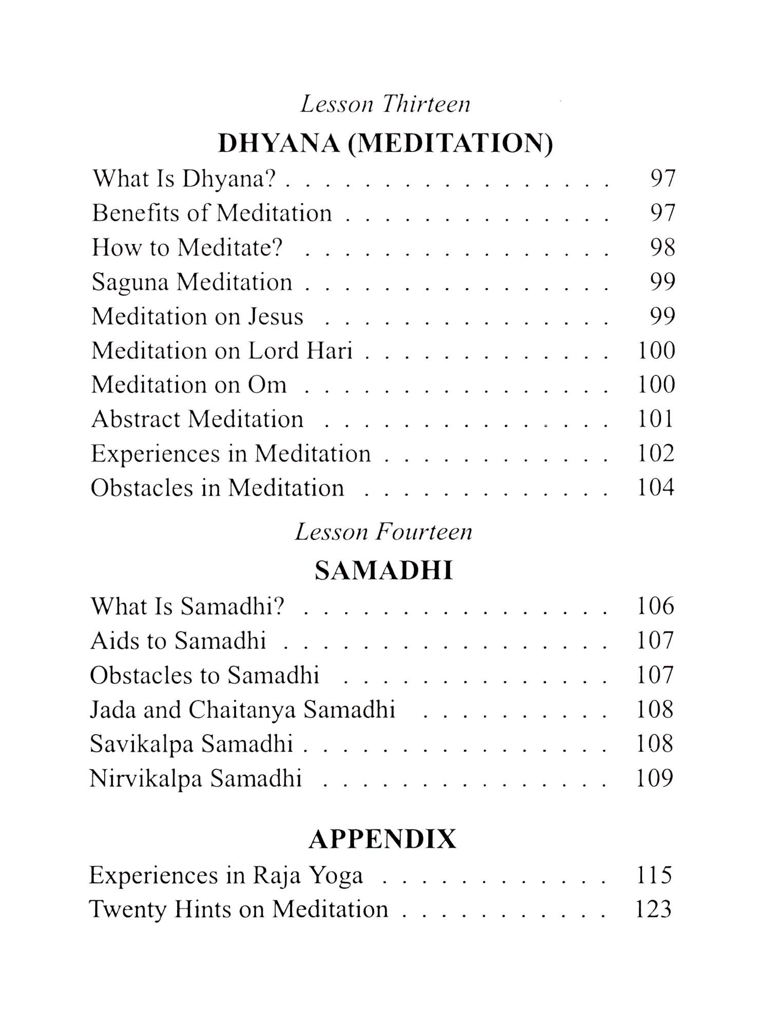 The fourteen elementary lessons on Raja Yoga are meant for the seeker who said, ‘-Yoga is my ideal, but I know not whether it is a kind of mystic esoterism of the psyche, or a process of acquiring supernatural feats coveted by early mortals.’ Here is, consequently, a comprehensive, clear and succinct exposition of the wonderful, psycho-analytical and highly rational system of Raja Yoga, which goes a long way to dispel wrong notions of its true nature, and emphasise its extraordinary value in the emolument of true happiness and an integral development of the personality of man. Here is found an enumeration of Patanjali’s octagonal system which begins with ethical discipline and ends with the final dissolution of individual perception in the cosmic consciousness-whole. Auxiliary notes have been added to this to specie’ the qualifications required of a Yogic student, the diet to be chosen, the process of harmonising the mental modifications, etc. Added to these is an exposition of the Philosophy of Om which provides a basis for the practice of concentration and meditation. To refresh your memory and to help summaries each lesson, questions have been given at the end of every lesson. No impossible methods are advocated herein. No one need forsake his or her avocation to pursue the path of Yoga. No sectarian doctrine hovers round its objectives. No allegiance is demanded to a particular cult. The science of Raja Yoga is universal, it is applicable to all. Here indeed is shown the way to live a full and happy life to one’s own personal advantage and usefulness to others.
