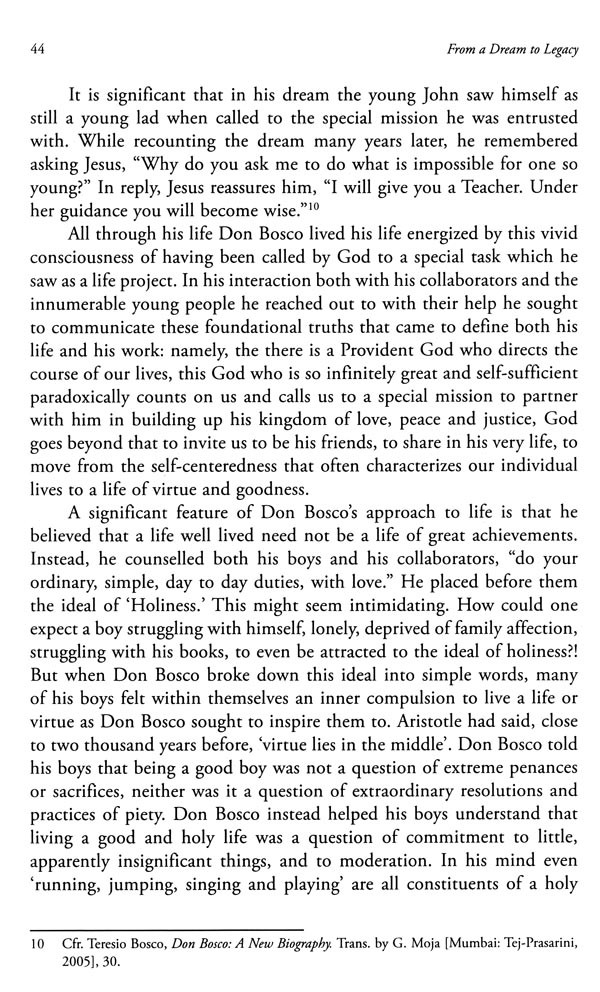 From A Dream To Legacy by Jacob Palaparambil examines the transformative journey of St. John Bosco, guided by a profound dream he experienced at the age of nine. Rooted in Don Bosco's Preventive System, the book frames this dream as a guiding framework for addressing contemporary challenges through love, reason, and empathetic understanding, countering violence and discord. With a rich array of perspectives - scriptural, theological, ethical, psychological, and pedagogical - the book underscores the dream's timeless significance. It explores its historical context, its contributions to virtue ethics, and its profound implications for leadership and peacebuilding. Prioritizing action over contemplation, the book inspires readers to embrace a vision of transformative love and grace. It calls for a commitment to shaping societies where compassion prevails, and human potential aligns with divine purpose.