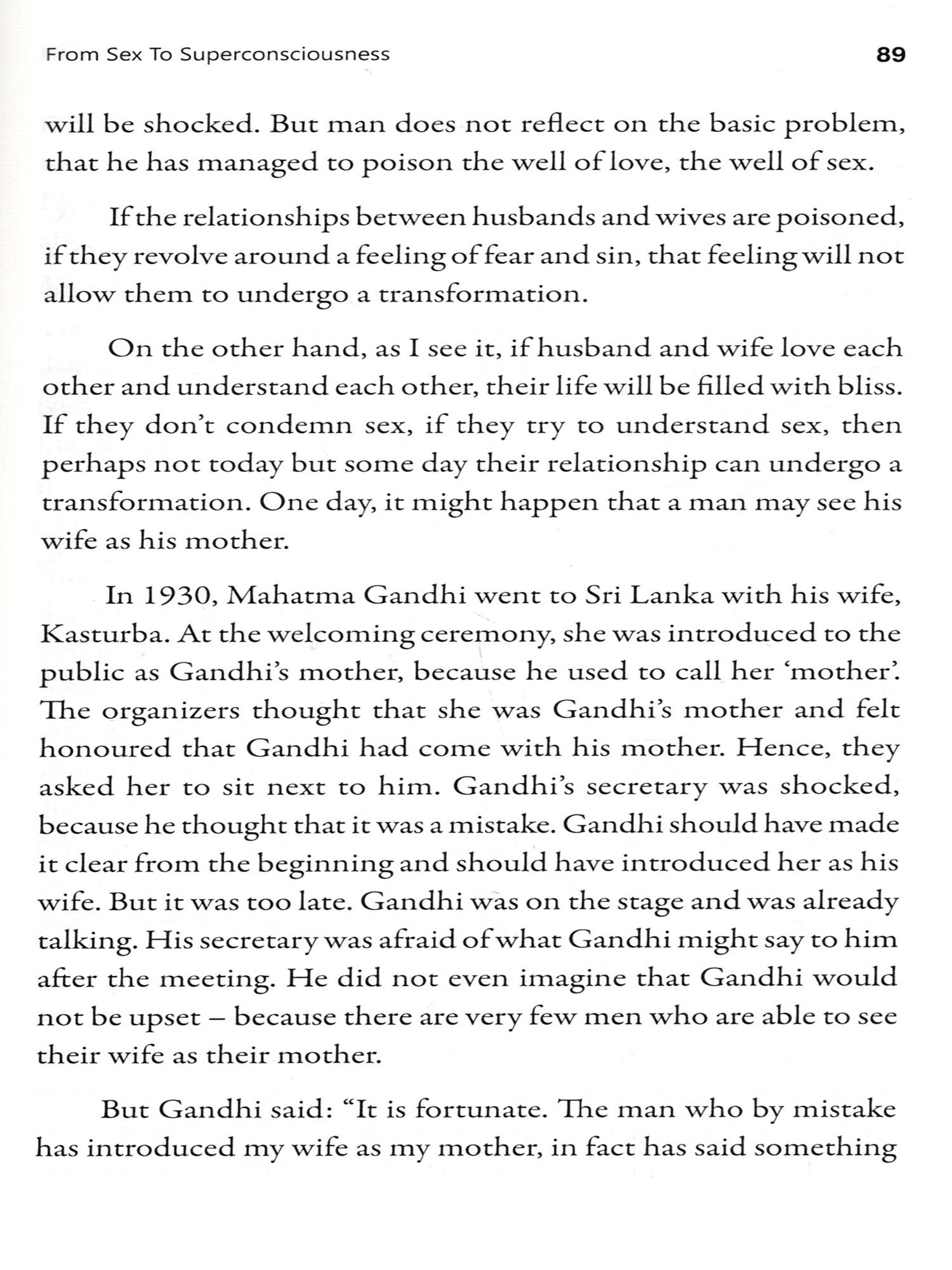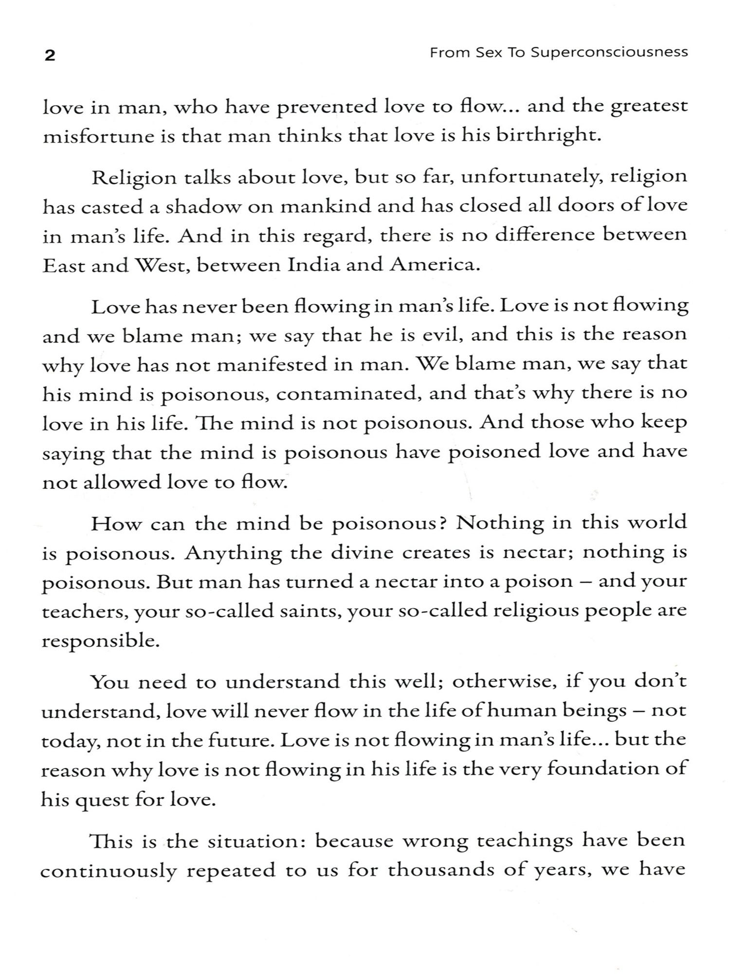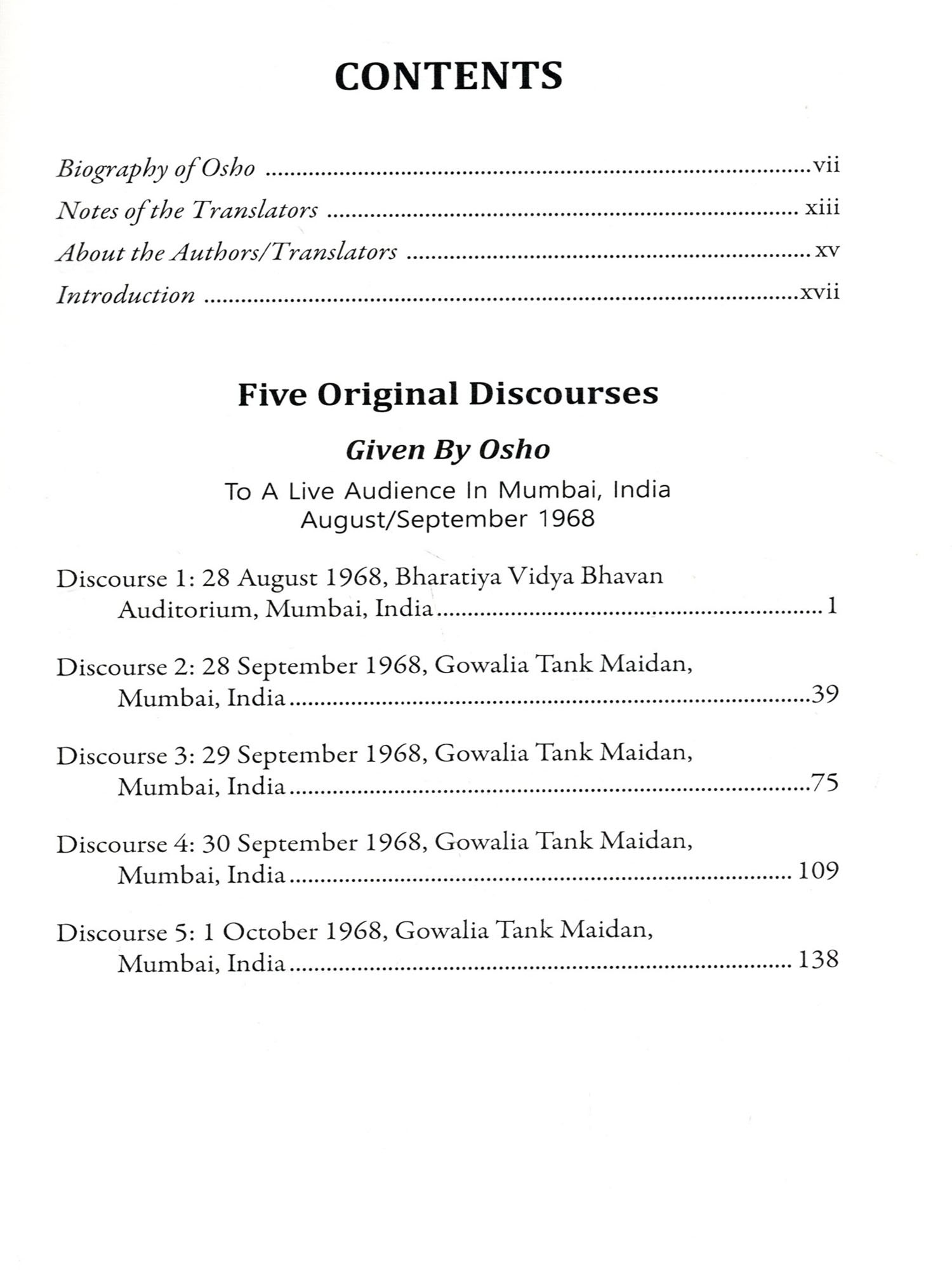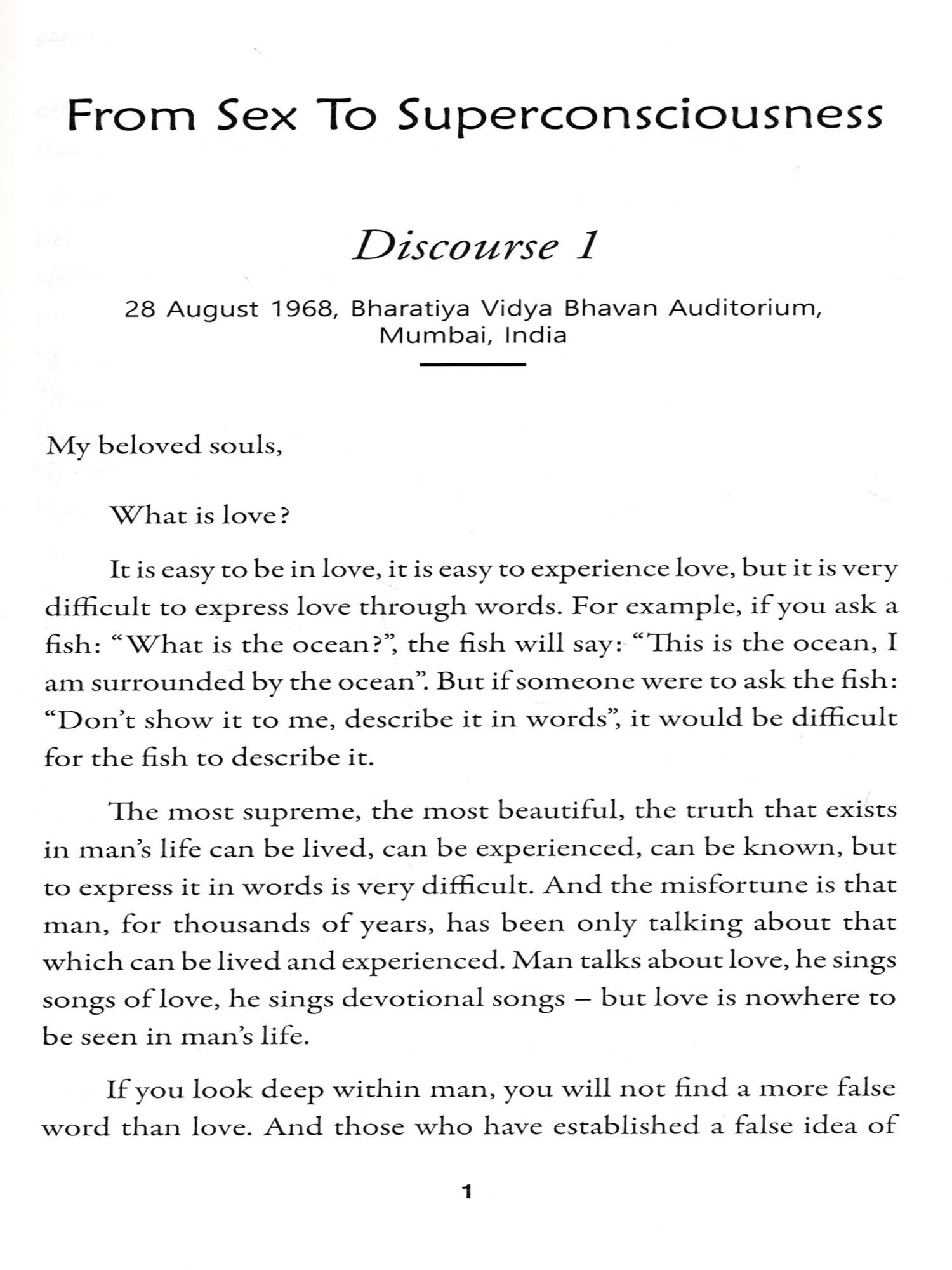 In 1968, a well-respected teacher by the name Acharya Rajneesh (later known as Osho) gave 5 discourses in Hindi on the subject of love and sex in Mumbai, India, giving rise to great controversy. These talks were given to a live audience of thousands of people. The title of the discourse series in Hindi is "Sambhog Se Samadhi Ki Aur", which literally means "From Sex to Samadhi". This series of discourses which have become known all over the world is titled "From Sex to Superconsciousness", as Samadhi is the ultimate state of consciousness.