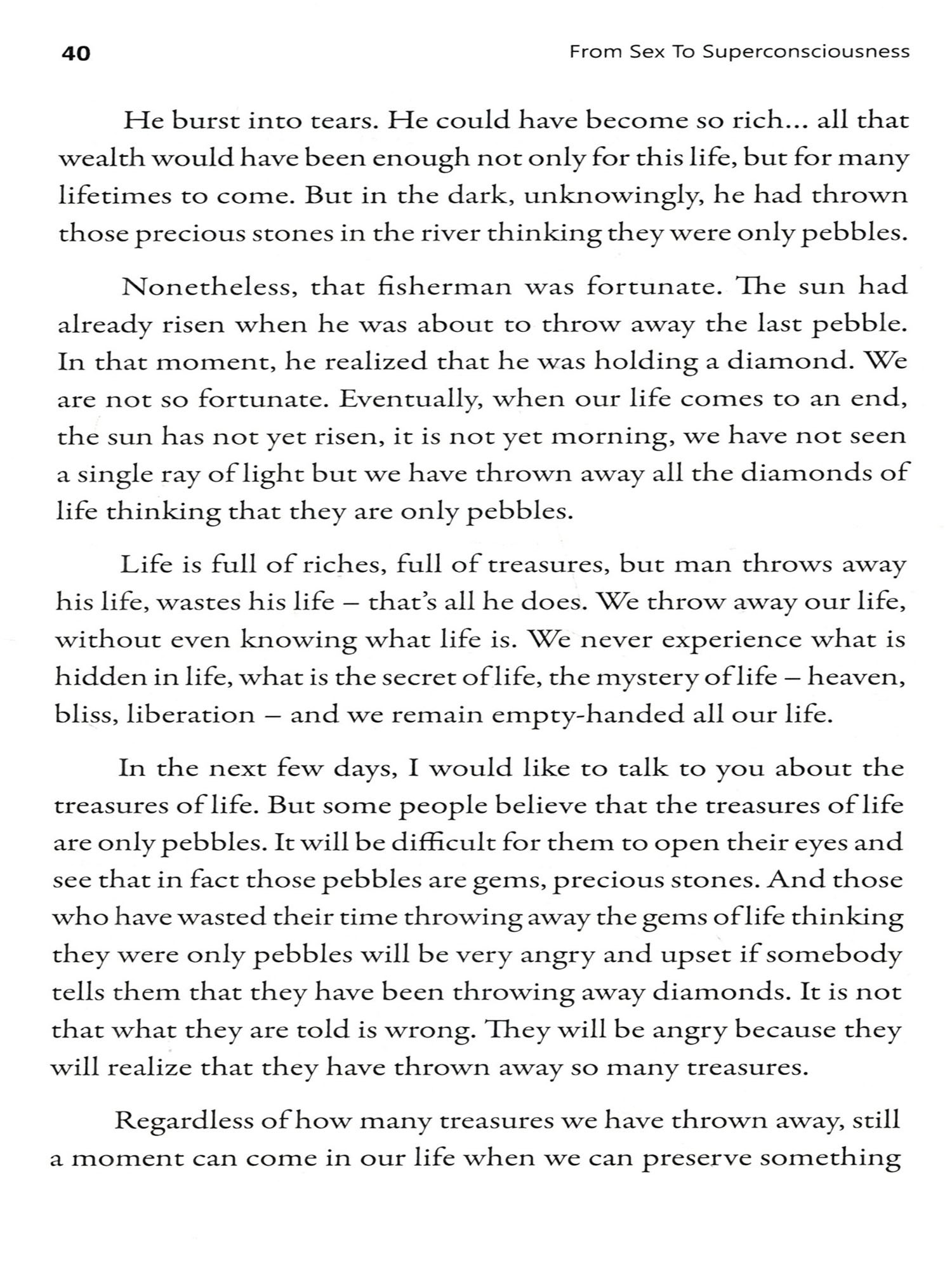 At the time, these discourses of Osho must have come as a shock. These early talks about sex and Samadhi were thought to be outrageous and disrespectful towards traditional values. Because of his revolutionary approach, in those days and throughout his life, Osho was criticized harshly and rejected by the orthodox clergy of all religions. But this is probably the destiny of all visionaries who are often misunderstood during their lifetime, but are inevitably appreciated later on, as time passes and man begins to understand the truths that they expressed.