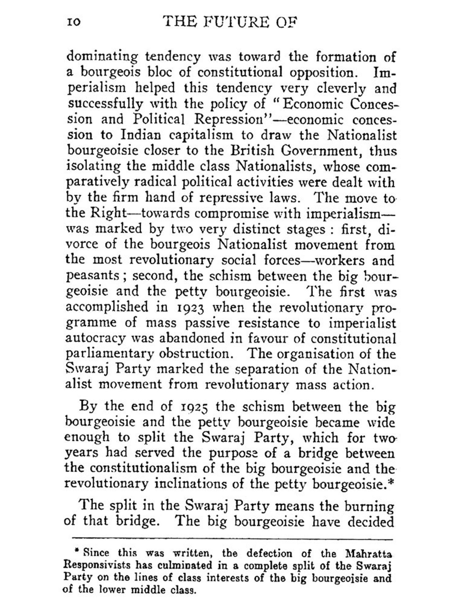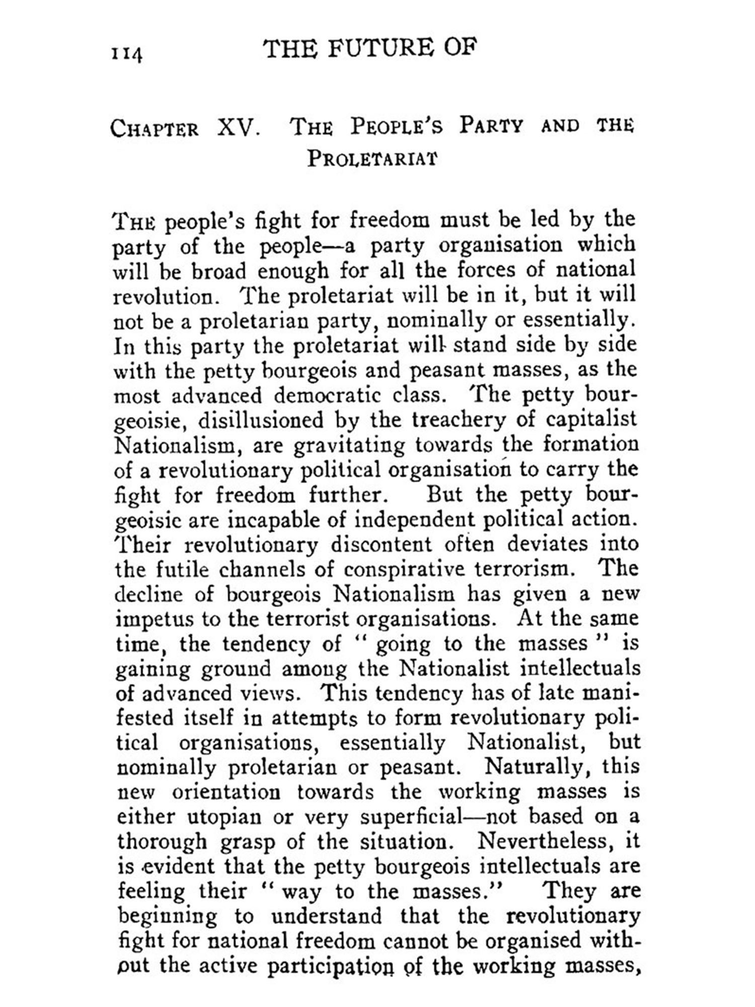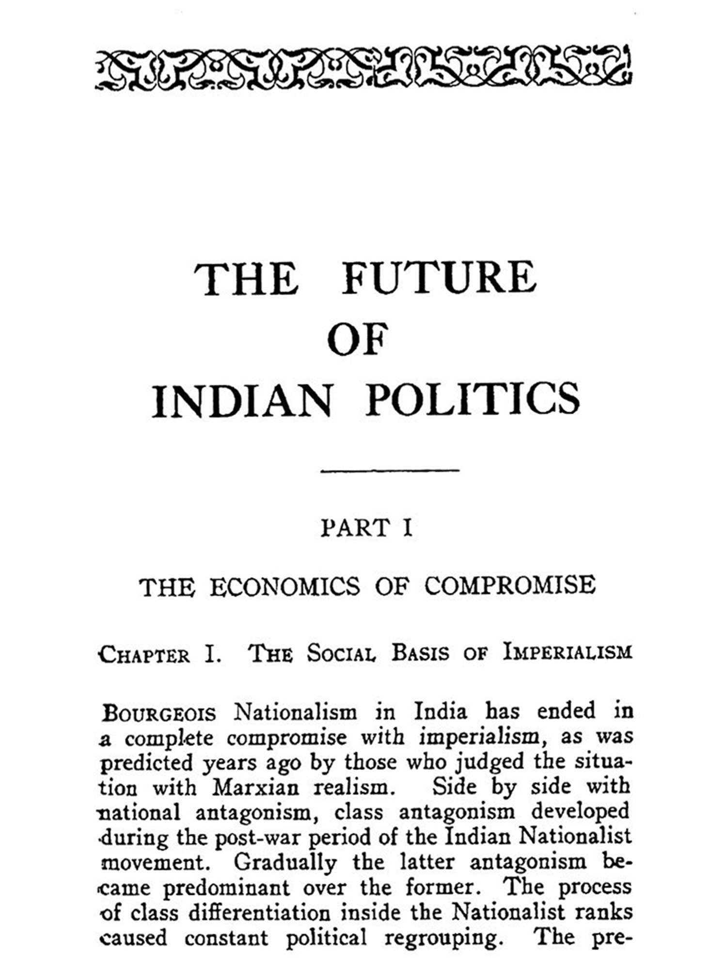 In this book the historic necessity for a People's Party in India is dealt with. The question of a the party of the proletariat is purposely left out. The role of the proletariat in the struggle for national freedom and democratisation of the country is defined only in broad outlines. Political organisation of the proletariat, its structure and programme, do not enter into the purview of the book. The proletariat is considered as a component part of the Nationalist forces. By the omission of the question, the importance of the party of the proletariat is not in the least minimised. Neither is the People's Party meant to be a substitute for the party of the proletariat. The object of this book is to show way to the revolutionary Nationalist forces; to point out the causes of the decline of bourgeois Nationalism; to expose the tendency of compromise underneath the verbal radicalism of the upper middle class; to indicate the historic necessity for the fight for freedom; and to enunciate in general the programme and organisational form the fight is bound to assume in its coming phases. Although the proletariat is destined to act as the lever of the struggle for national liberation, there are other social classes immensely more numerous than the proletariat whose importance in the fight for democratic national freedom cannot be minimised. The future of Indian politics will still be dominated by the interests of these classes-intellectuals, artisans, small traders and peasantry.