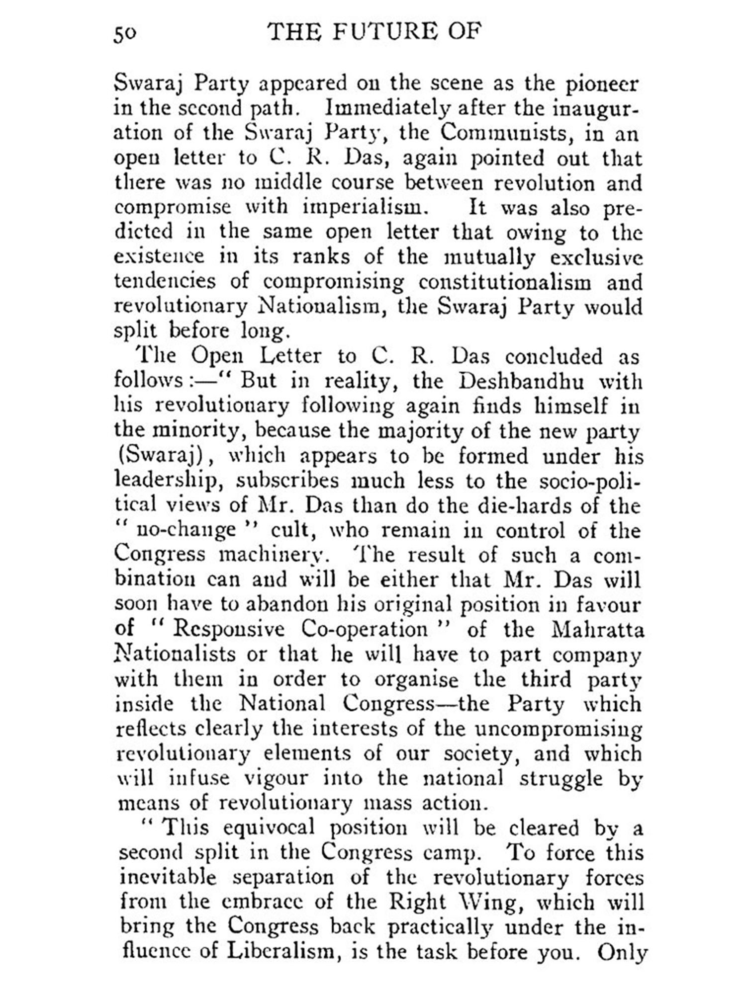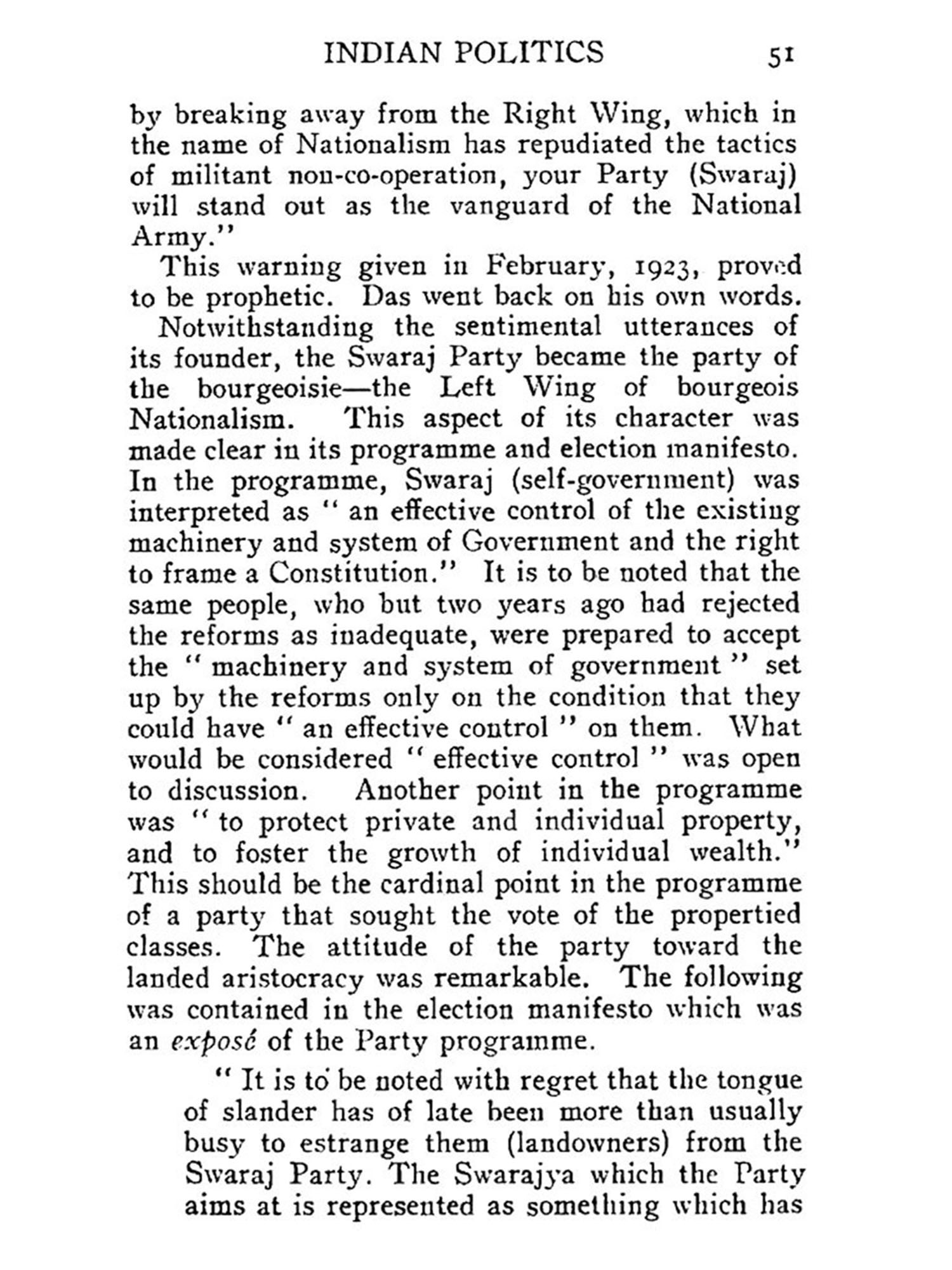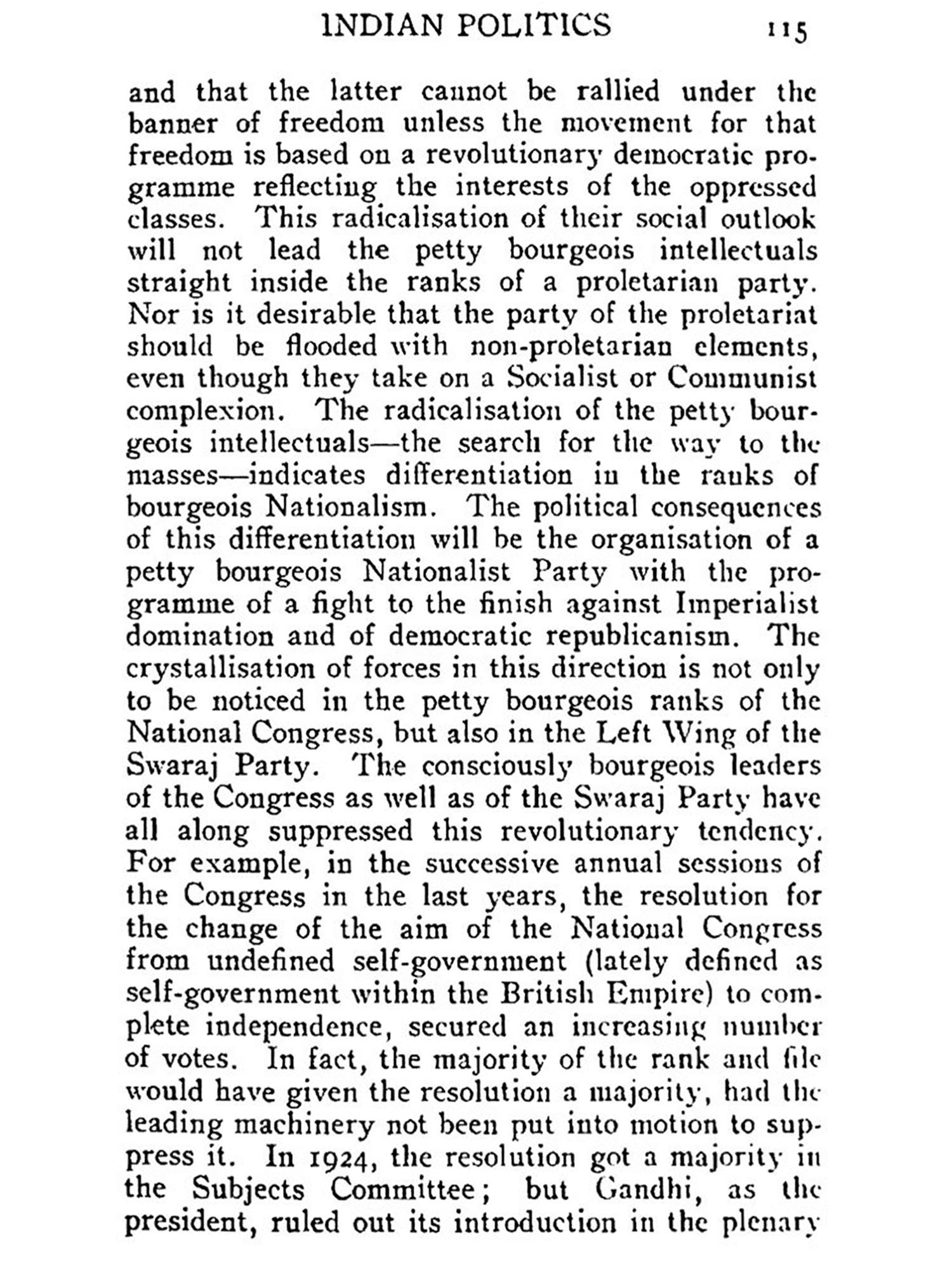 In this book the historic necessity for a People's Party in India is dealt with. The question of a the party of the proletariat is purposely left out. The role of the proletariat in the struggle for national freedom and democratisation of the country is defined only in broad outlines. Political organisation of the proletariat, its structure and programme, do not enter into the purview of the book. The proletariat is considered as a component part of the Nationalist forces. By the omission of the question, the importance of the party of the proletariat is not in the least minimised. Neither is the People's Party meant to be a substitute for the party of the proletariat. The object of this book is to show way to the revolutionary Nationalist forces; to point out the causes of the decline of bourgeois Nationalism; to expose the tendency of compromise underneath the verbal radicalism of the upper middle class; to indicate the historic necessity for the fight for freedom; and to enunciate in general the programme and organisational form the fight is bound to assume in its coming phases. Although the proletariat is destined to act as the lever of the struggle for national liberation, there are other social classes immensely more numerous than the proletariat whose importance in the fight for democratic national freedom cannot be minimised. The future of Indian politics will still be dominated by the interests of these classes-intellectuals, artisans, small traders and peasantry.