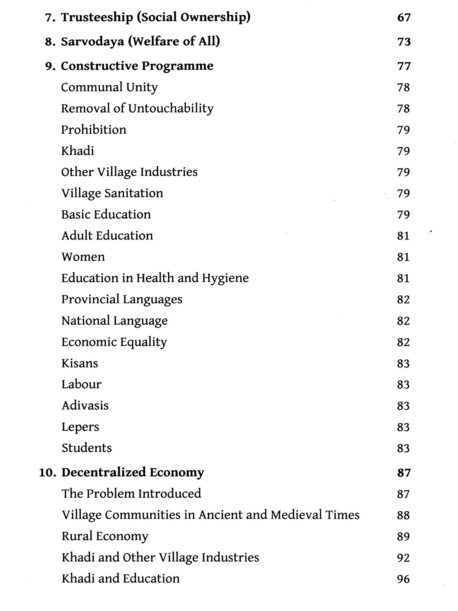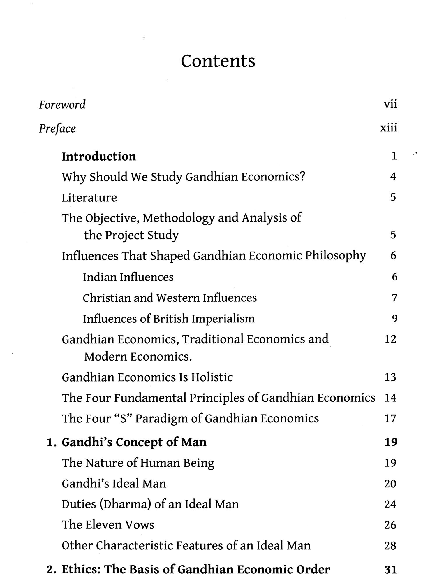 This book initiates with a very apt quote by Martin Luther King Jr. "If humanity is to progress, Gandhi is inescapable. ..." The document itself starts with "Preface", followed by "Introduction" full of scholarly information, linked to the study of the subject. Gandhi learnt his "economics" from John Ruskin's Unto This Last and other multifarious sources as a part of actual experiences of life. Hence, to him truth and non-violence remained the fundamental principles of economics also. He was not like a typical academician. J.C. Kumarappa's Economy of Permanence rightly classified "Gandhian economics" as "economy of service" (among the five possible categories: parasitic, predatory, enterprising, gregarious and service). Professor Prasad then discusses other very relevant issues: "Why should we study Gandhian economics?", Its resource literature, objectives, methodology and influences that shaped its philosophy, Gandhian economics vs. traditional economics, Gandhian economics is holistic and its four fundamental principles, six fundamental premises and four "S" paradigm. The "Introduction" makes one realize the core values of Gandhian economics before perusing the following chapters 1 to 13 describing its varied contents and perspectives.