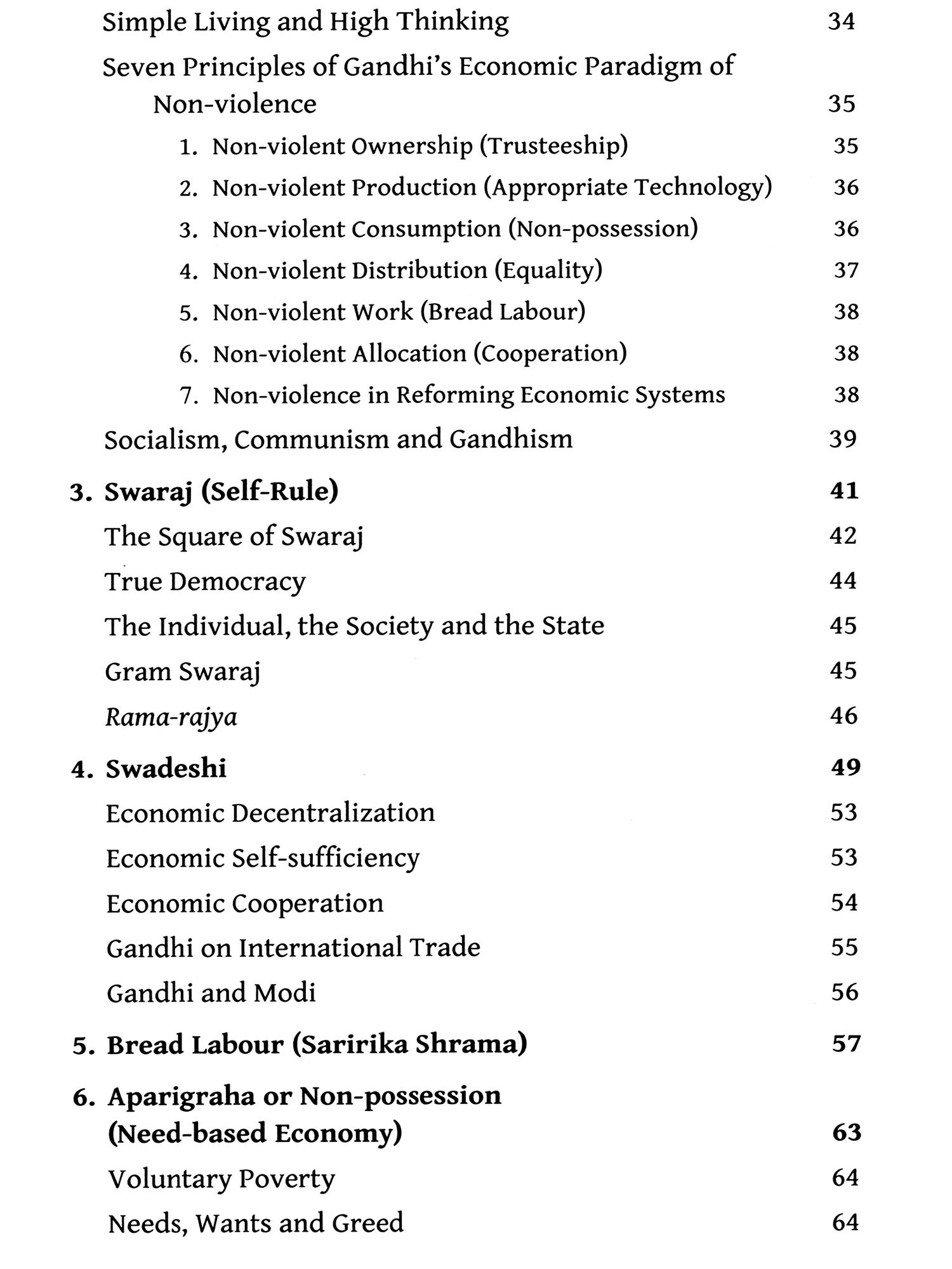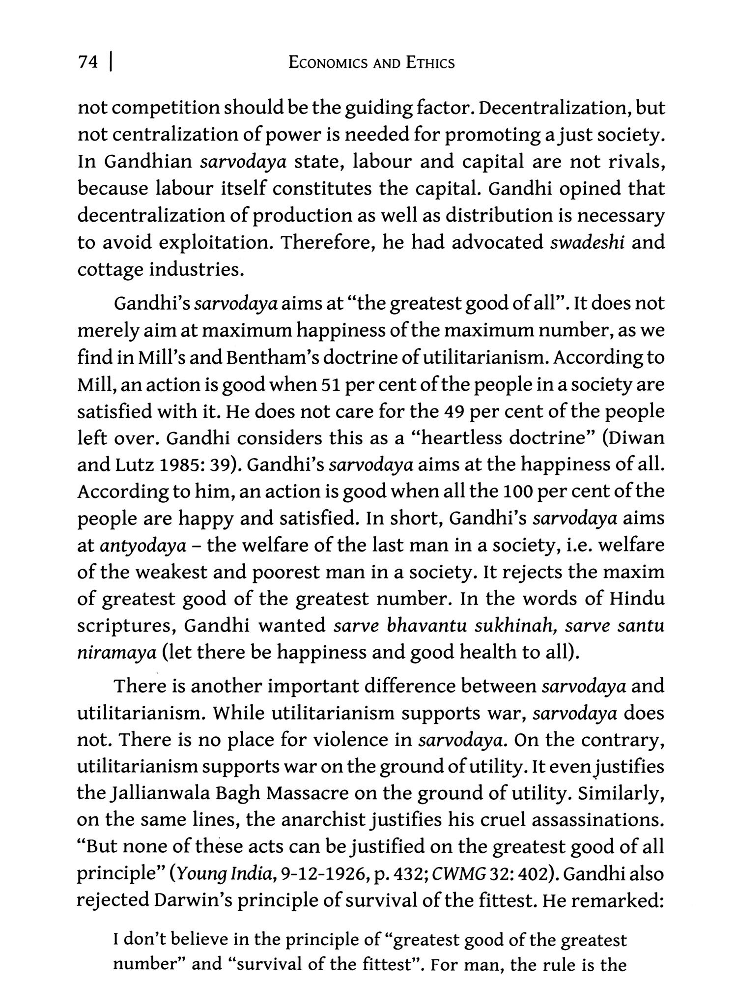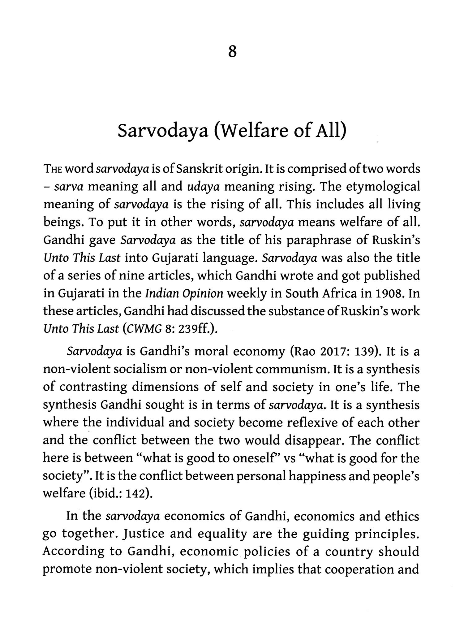 Chapter 2 "Ethics: The Basis of Gandhian Economic Order", further concretizes Gandhi's integration of economic and moral progress. Central principle of traditional economics is "self-interest", that of Gandhian economics is "good of all", particularly of the "last man" (Gandhi's Talisman). It means "simple living and high thinking", seeking satisfaction of "needs", not "greed". It means "non-violent" economic order.