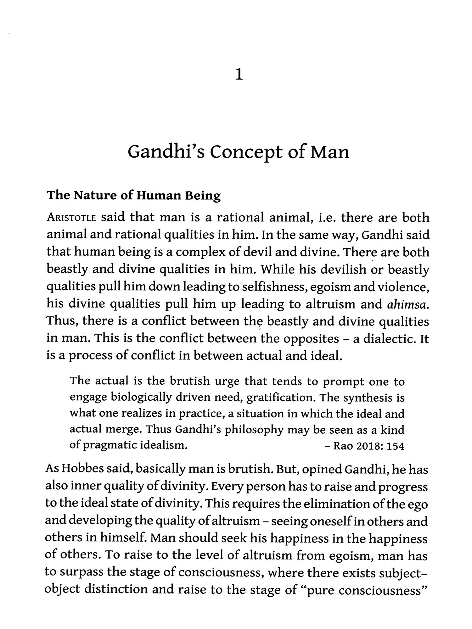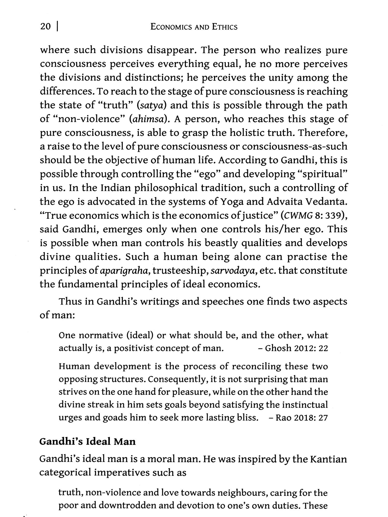 In Chapter 1 "Gandhi's Concept of Man", his ideal man is described as a moral man, following the purusharthas and the eleven vows and avoiding the seven deadly sins. There can be no contradiction between true "economic" progress and "moral" progress in an ideal social order.