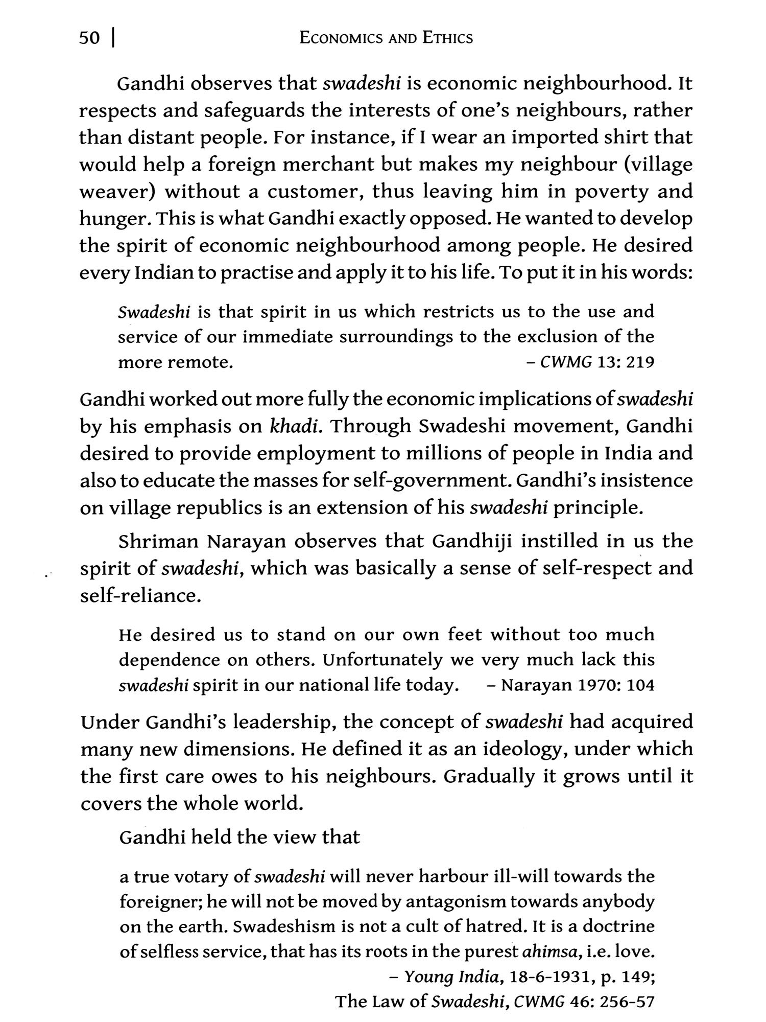 Gandhian concept of swadeshi included his agenda of a decentralized economy, revival of rural economies, mass employment and self-sufficiency/self-reliance. The first care one owes is to one's neighbour, its reach expanding step by step till it covers the world. It led to his well-known khadi economics. "It is a doctrine of selfless service that has its roots in the purest ahimsa, i.e. love." Chapter 5: "Bread Labour" has been among the most innovative policies of Gandhian economics. "Man must earn his bread by labouring with his own hands." It implies everyone's "duty and right to work". Gandhi resourced his concept of bread labour from John Ruskin, Leo Tolstoy and the Gita. It meant the dignity of labour and thus the popularity of the charkha. To achieve this deeply socialistic nature of Gandhian economics, Gandhi had laid down clear policy directives for the owners of wealth and the society at large. These are covered under the next three chapters. Chapters 6-8 focus on "Aparigraha or Non-possession (Need-based Economy)", "Trusteeship (Social Ownership)" and "Sarvodaya (Welfare of All)".