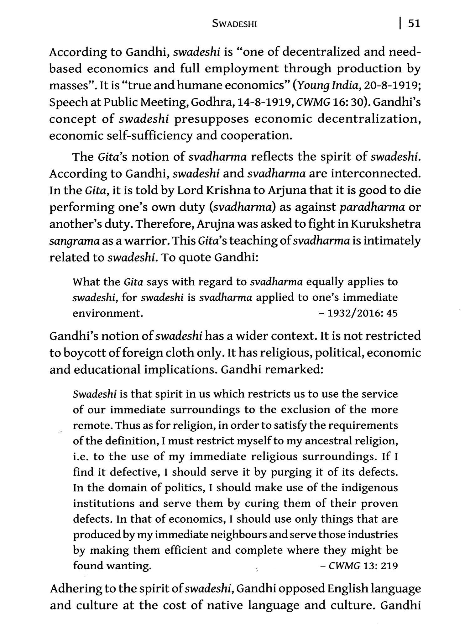Chapters 3-5 "Swaraj (Self-rule)", "Swadeshi (Economics of Neighbourhood)" and "Bread Labour (Sarirak Shrama)" portray how pursuit of Gandhian economics remained at the core of India's freedom struggle. Gandhian concept of swaraj included not only political freedom but also economic, social and moral freedoms. It was "poor man's swaraj". Three days before his martyrdom (27 January 1948) he had cautioned that the Congress had got only "political" freedom for India; economic, social and moral freedoms were still to come; their attainment would be harder as these have to come from within. Gandhian swaraj also meant "true democracy", "the individual is the supreme consideration", "Gram Swaraj" and "Ramarajya", i.e. an ideal state.