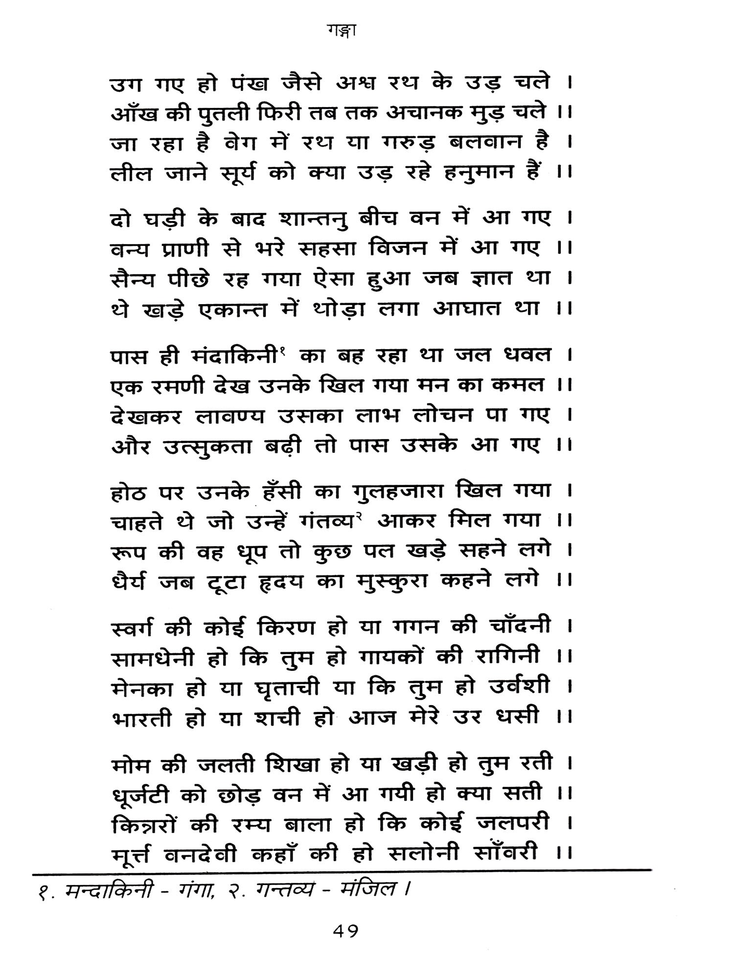 कवि ने देवापगा गंगा पर, अथवा यो कहिए कि गंगावतरण पर यह प्रबन्ध काव्य लिखकर संसार के सामने एक आदर्श उपस्थित किया है। मम्मट, कैयट रुद्रट, भामह, राजशेखर और दण्डी ने प्रबंध काव्य के लिए धीरोदात्त, धीरोद्धत, धीरप्रशान्त और धीरललित नायकों के चुनाव पर बल दिया है। नारियों को नायक बनाया जाए कि नहीं, इस तथ्य पर मौन रह गए हैं। मैं सोचता हूँ कि कवि श्रीकान्त तिवारी 'सदेह' ने इस दिशा में साहसिक कदम उठाया है। इसके लिए उनकी जितनी प्रशंसा की जाए, कम होगी। गंगा की पवित्रता के बारे में जितने उदाहरण हमारे धर्मशास्त्रों में मिलते हैं, संभवतः उतने अन्य नदियों के नहीं मिलते। यों तो कर्मनाशा और काकपेया दो नदियों को छोड़कर बाकी सभी नदियों का जल पवित्र माना जाता है। लेकिन गंगा का क्या कहना ? उसकी पवित्रता पर ऊँगली नहीं उठाई जा सकती । बाकी नदियों में स्नान करने को ही महत्त्व दिया गया है, किन्तु गंगा के बारे में स्कन्दपुराण 31/7 कहता है कि जो मनुष्य सौ बार भी गंगा के नाम का जप करता है वह अपने जीवन के सभी पापों को मिटाकर अंततः विष्णुलोक में निवास करता है -
